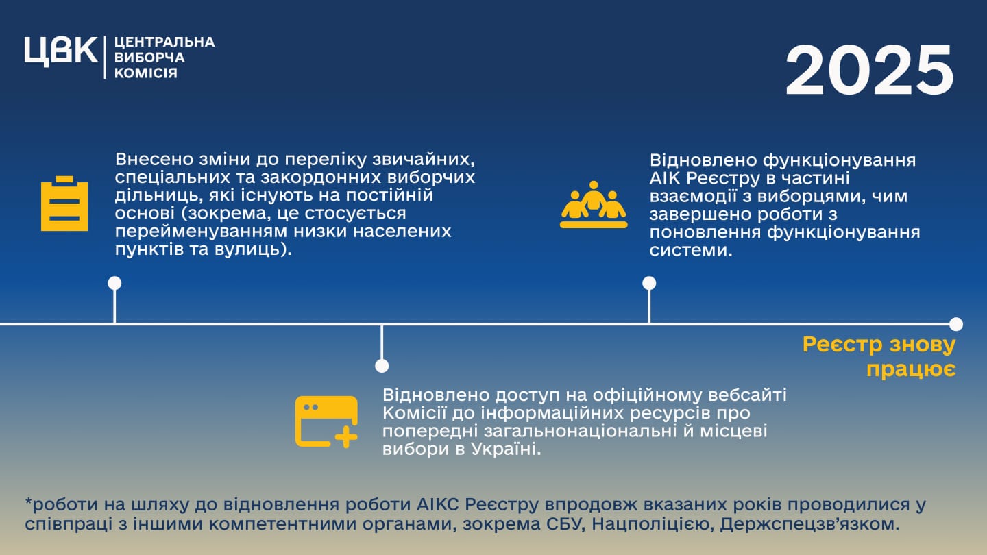 Наприкінці 2025 року Комісія відновила функціонування автоматизованої інформаційно-комунікаційної системи “Державний реєстр виборців” у частині взаємодії з виборцями.
