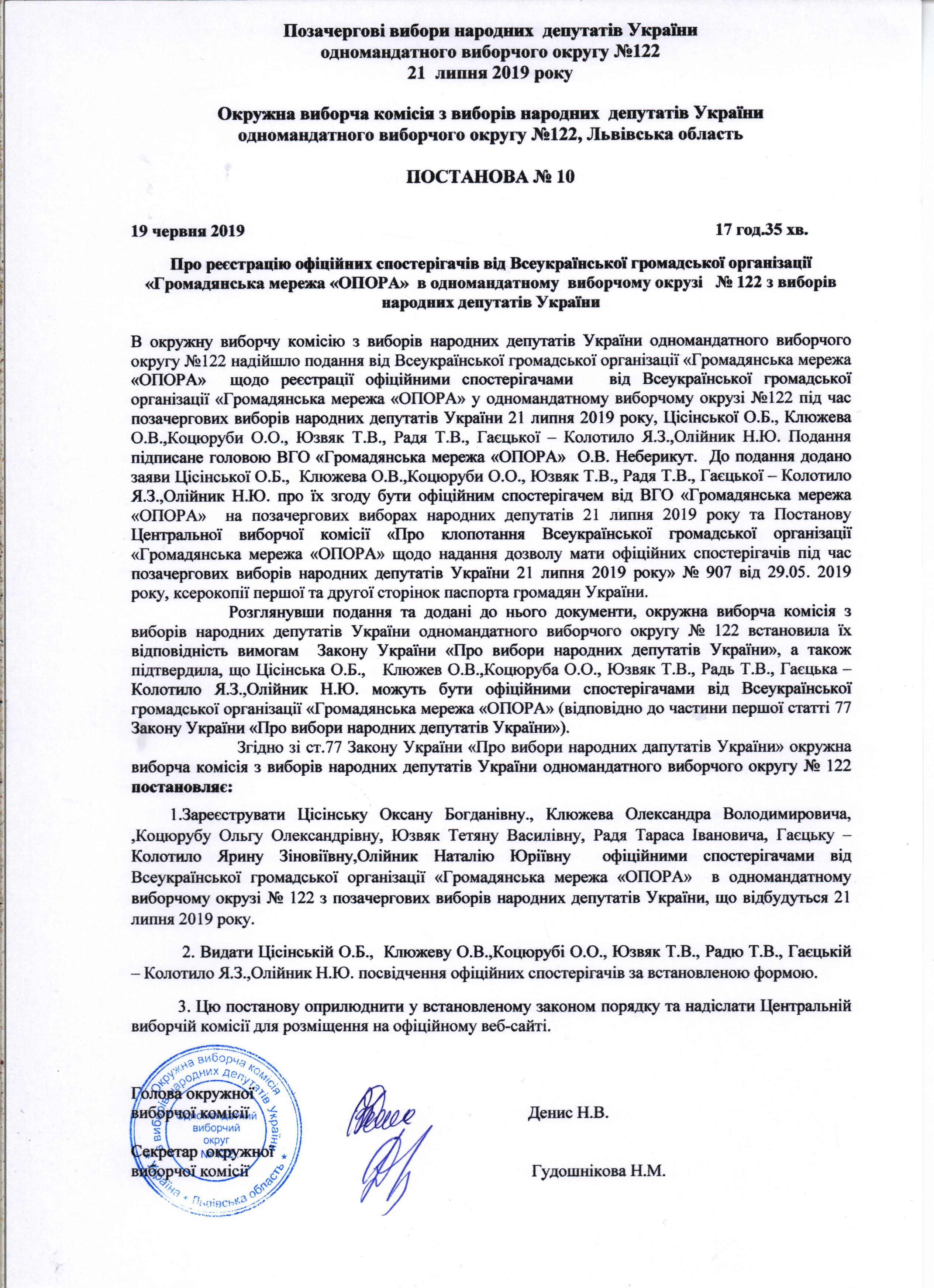 Про реєстрацію офіційних спостерігачів від Всеукраїнської громадської організації "Громадянська мережа "ОПОРА" в одномандатному виборчому окрузі №122 з виборів народних депутатів України |