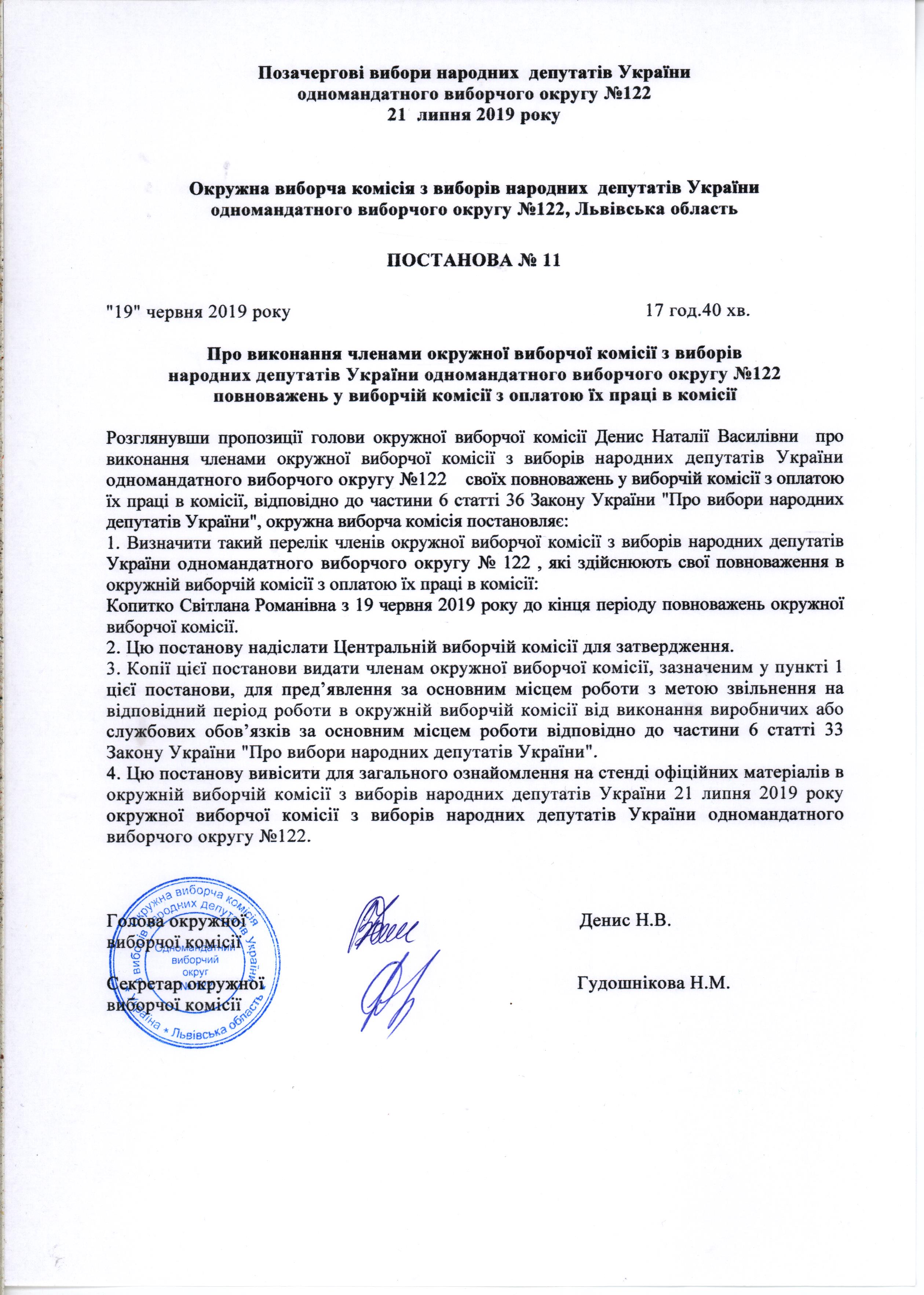 Про виконання членами окружної виборчої комісії з виборів народних депутатів України одномандатного виборчого округ №122 повноважень у виборчій комісії з оплатою їх праці в комісії |
