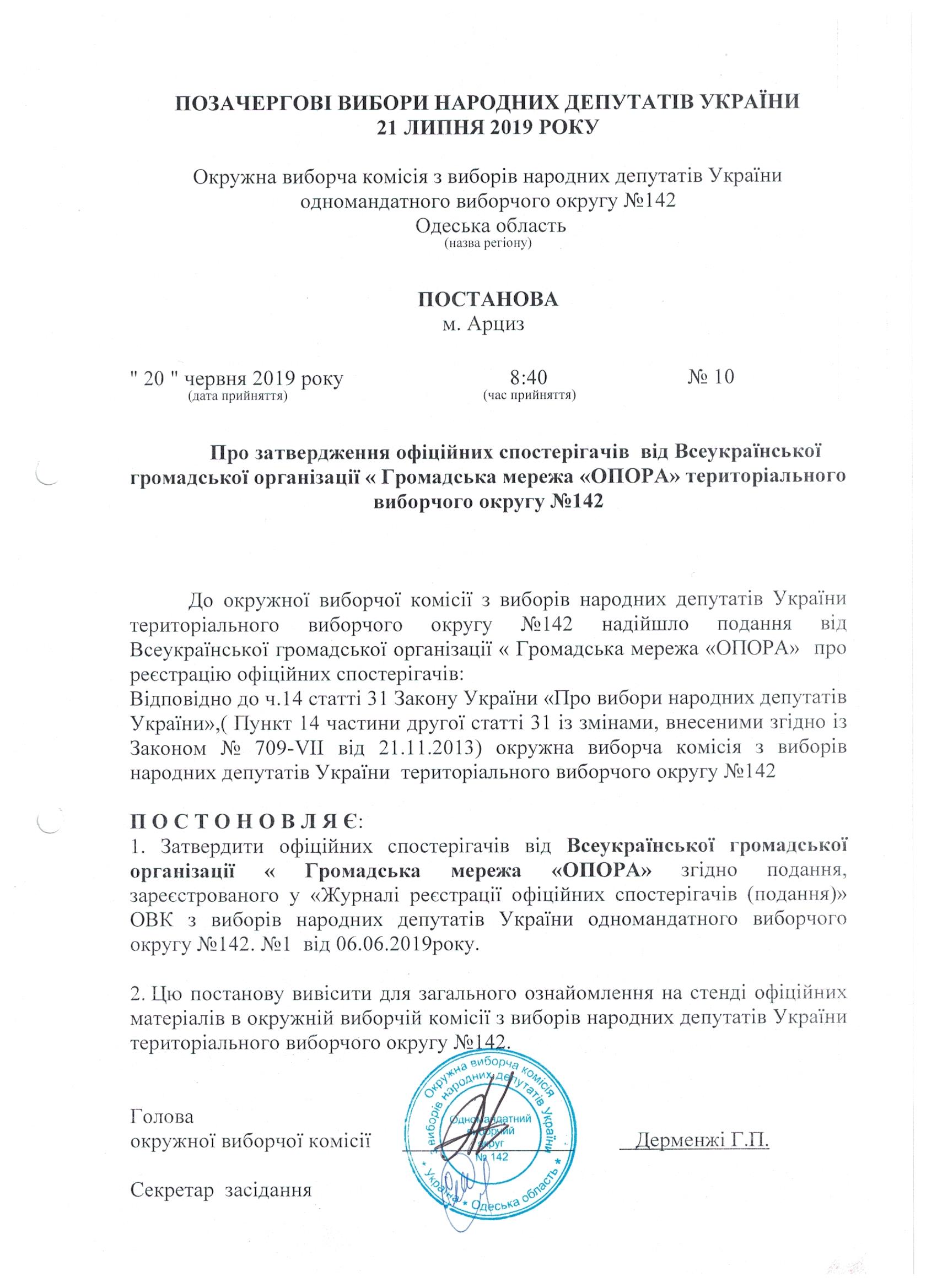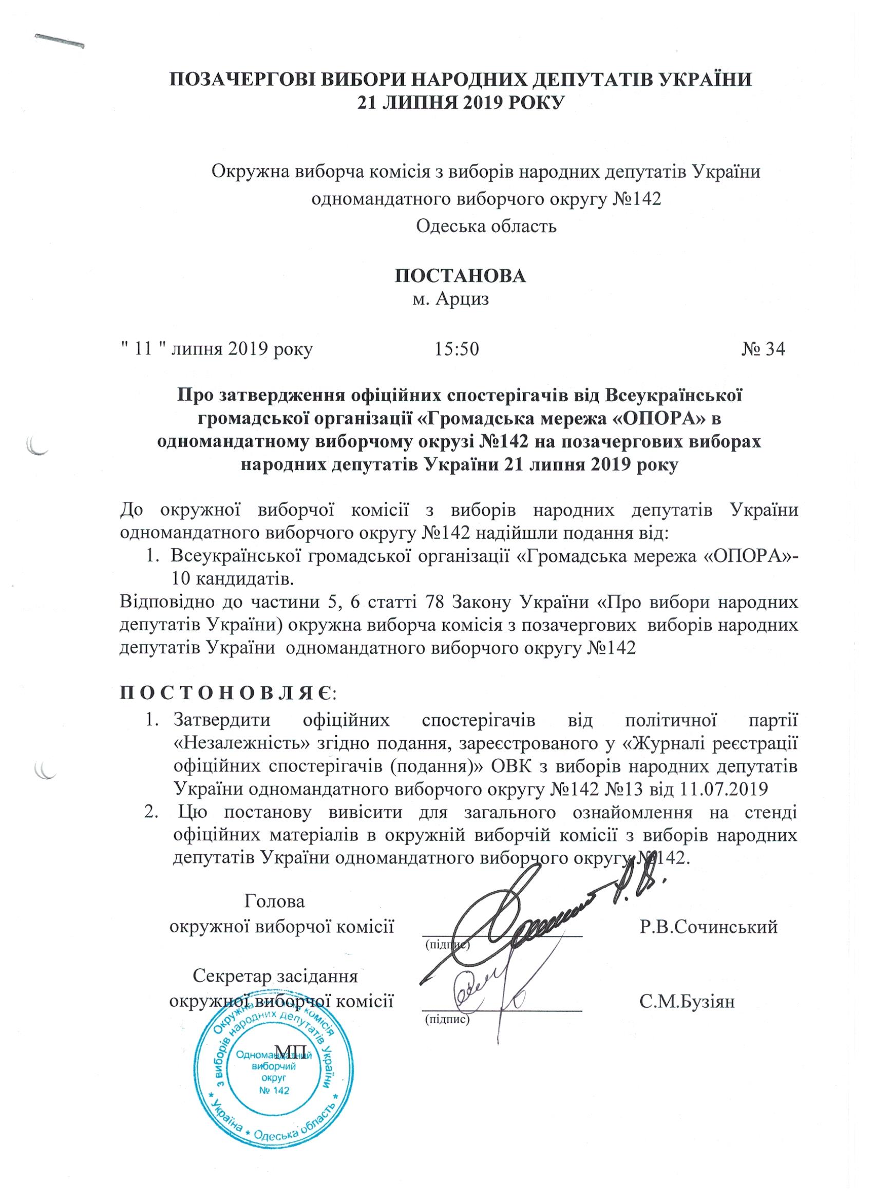 Про затвердження офіційних спостерігачів від Веукраїнської громадської органіізації "Громадська мережа "ОПОРА"" |