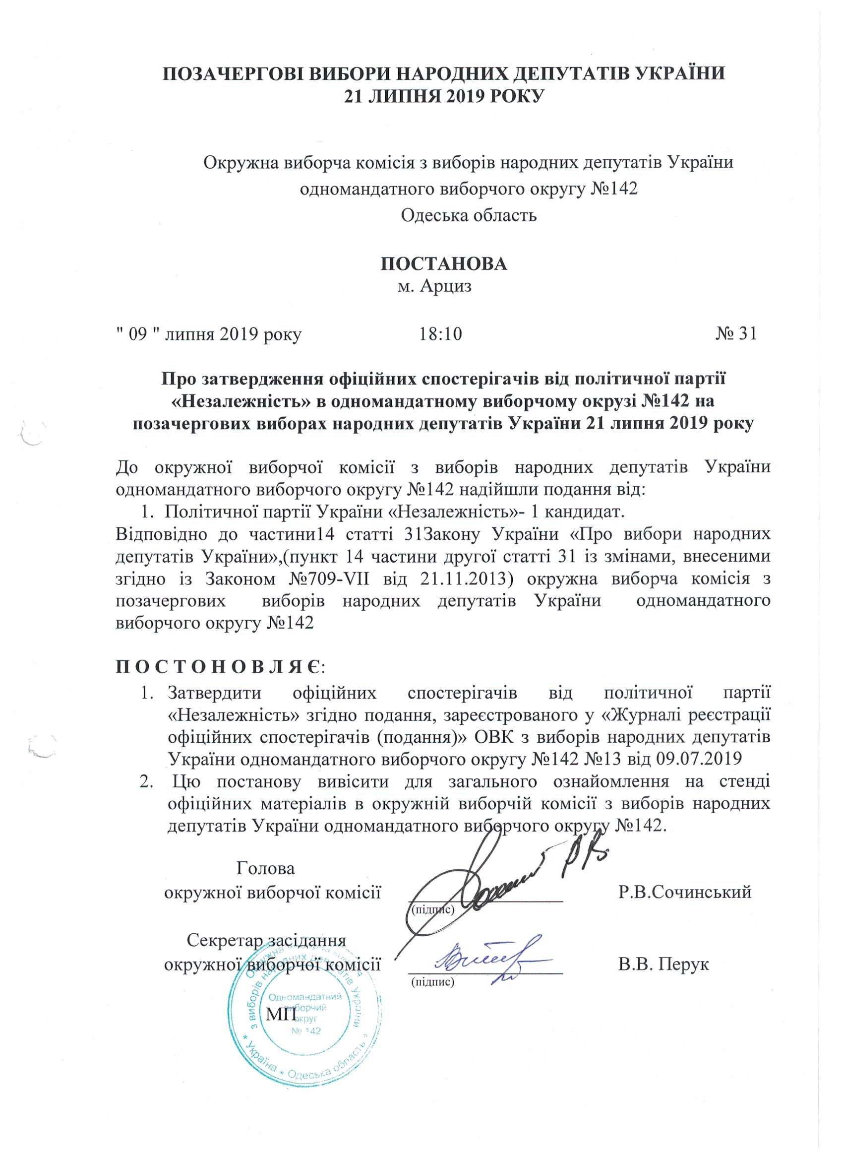 Про затвердження офіційних спостерігачів від политичної партії "Незалеєність" |