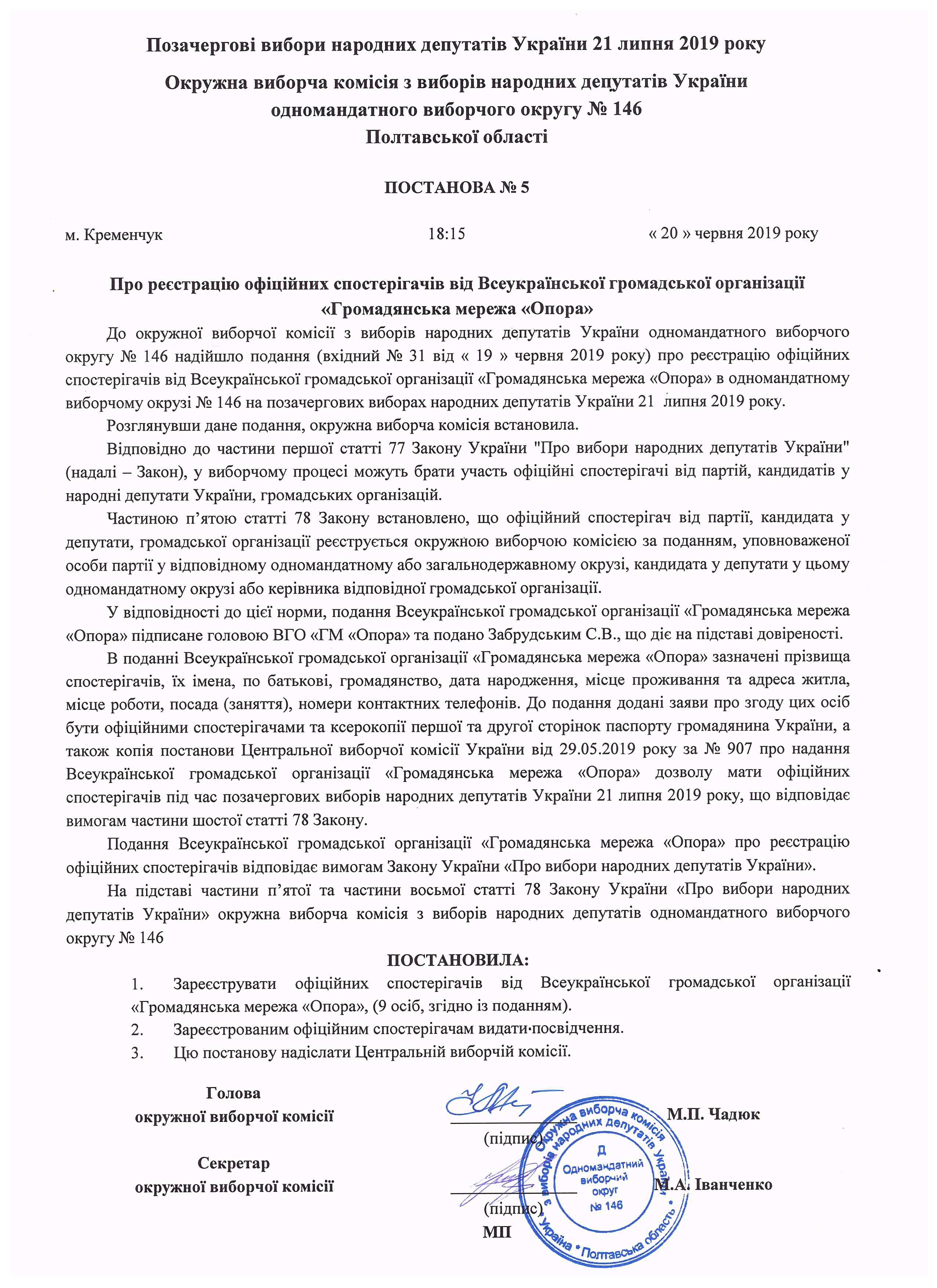 Про реєстрацію офіційних спостерігачів від Всеукраїнської громадської організації "Громадська мережа "Опора" |