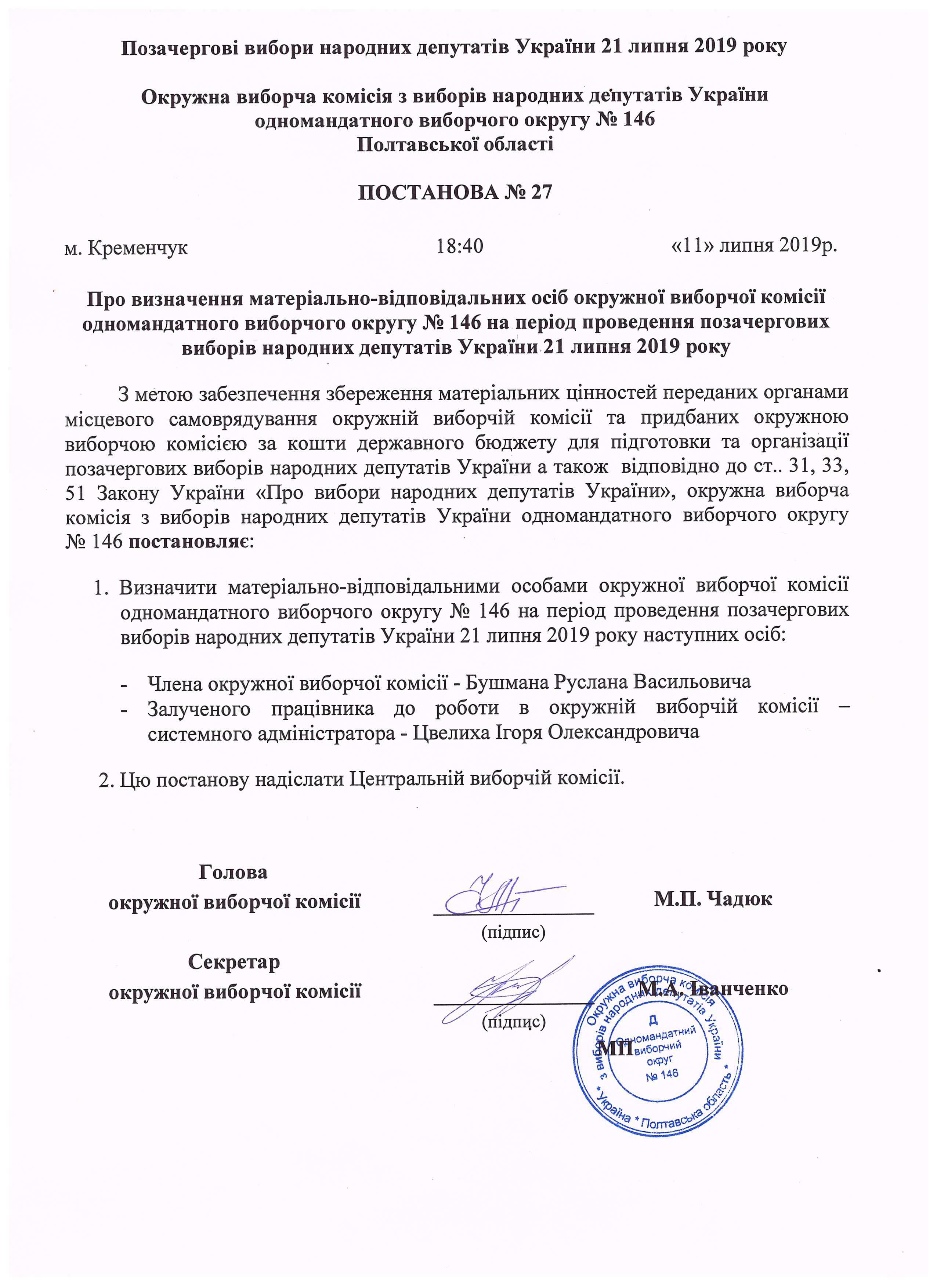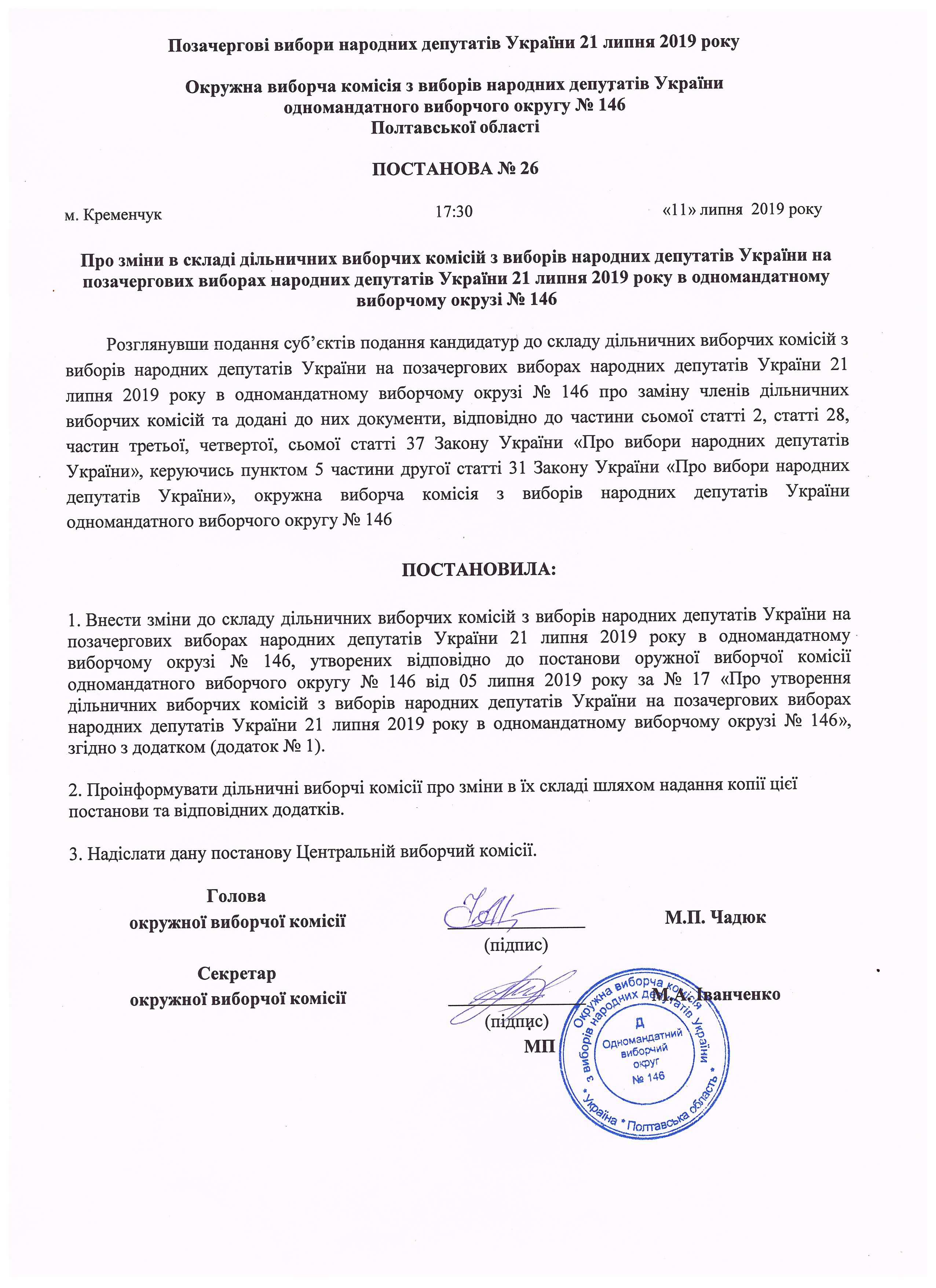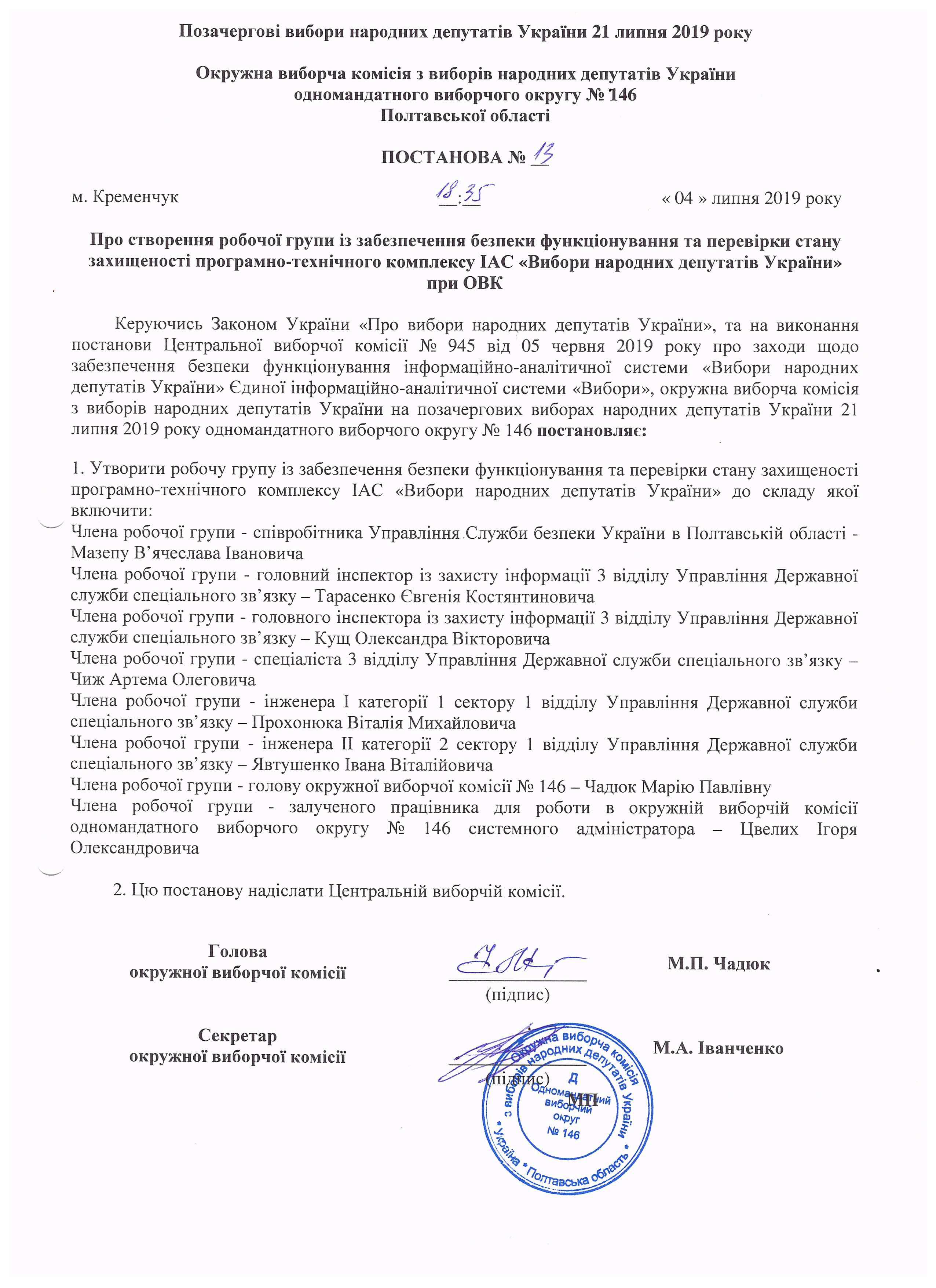 Про розподіл обов'язків членів окружної виборчої комісії з виборів народних депутатів України на позачергових виборах народних депутатів України 21 липня 2019 року одномандатного виборчого округу №146 |