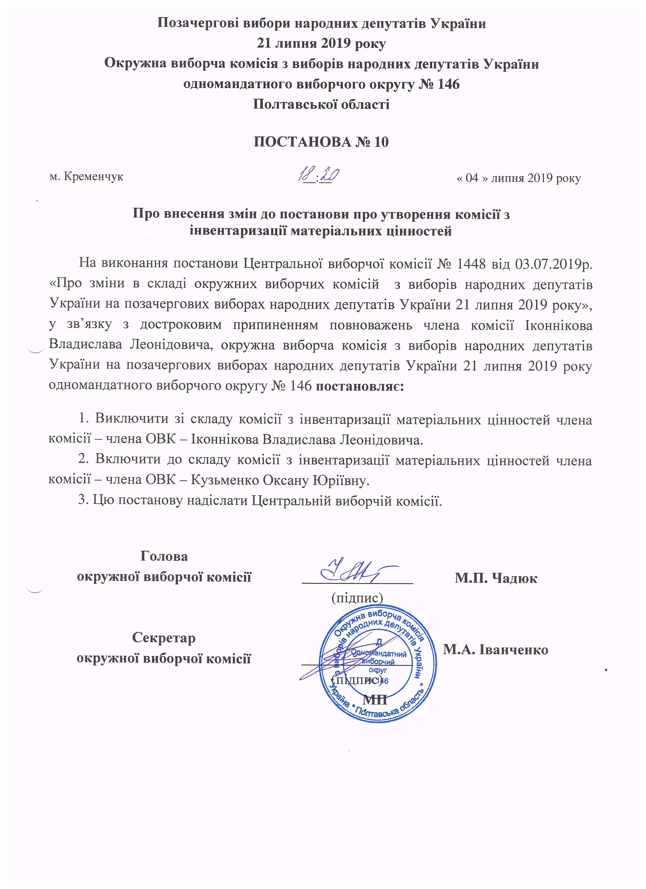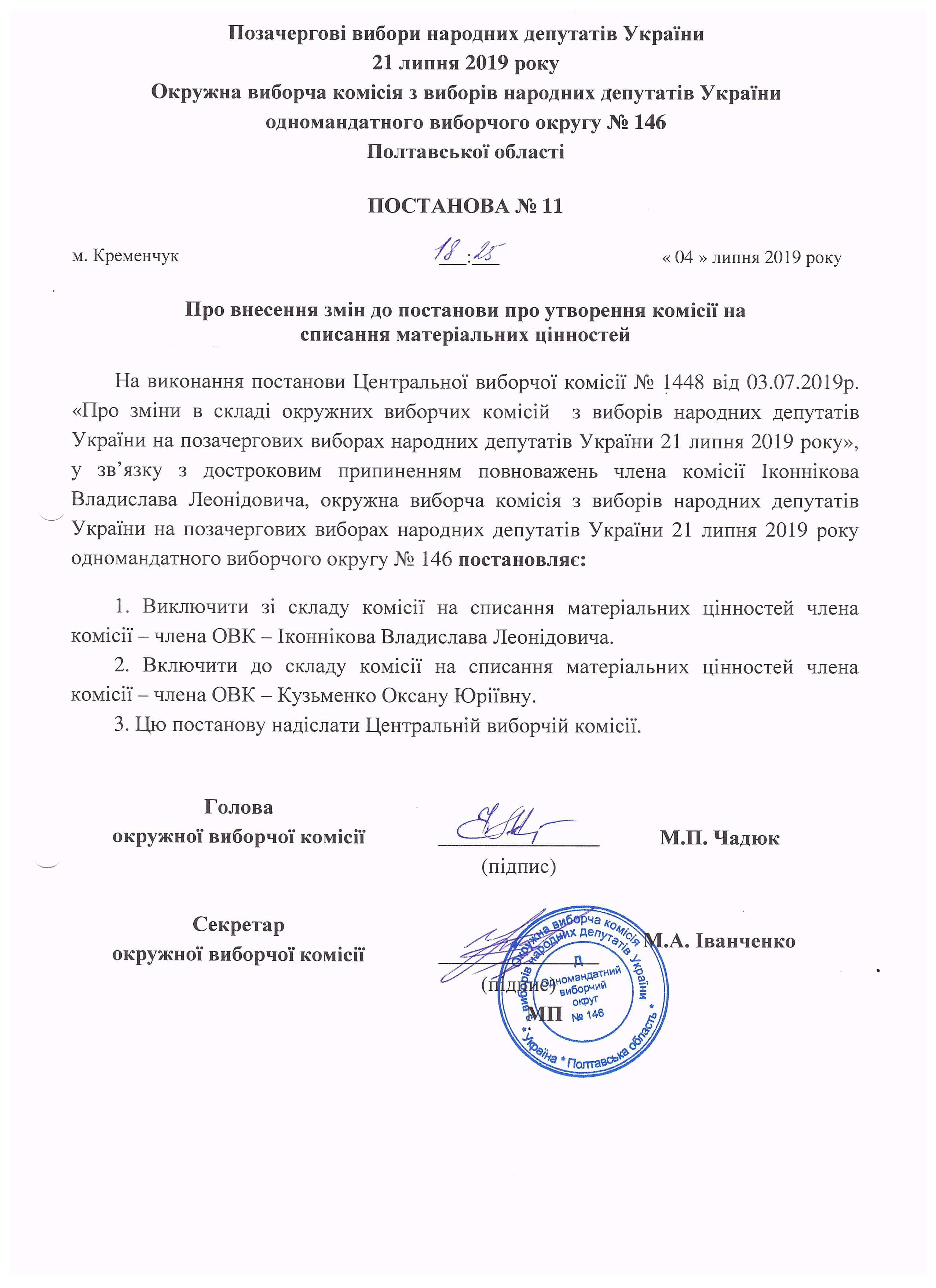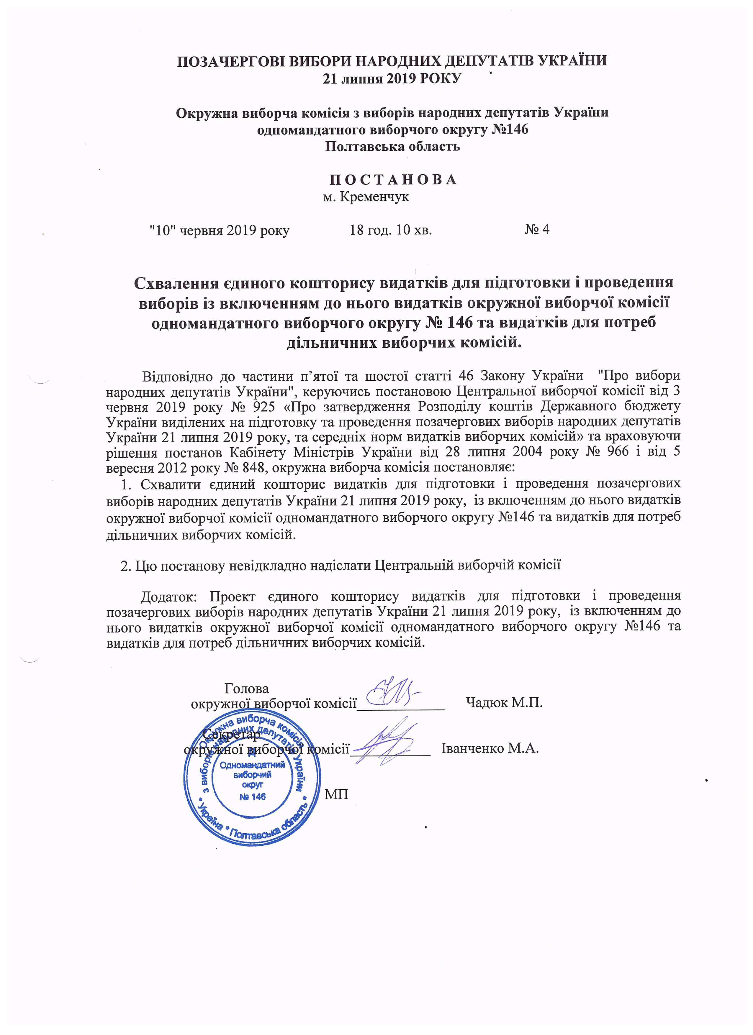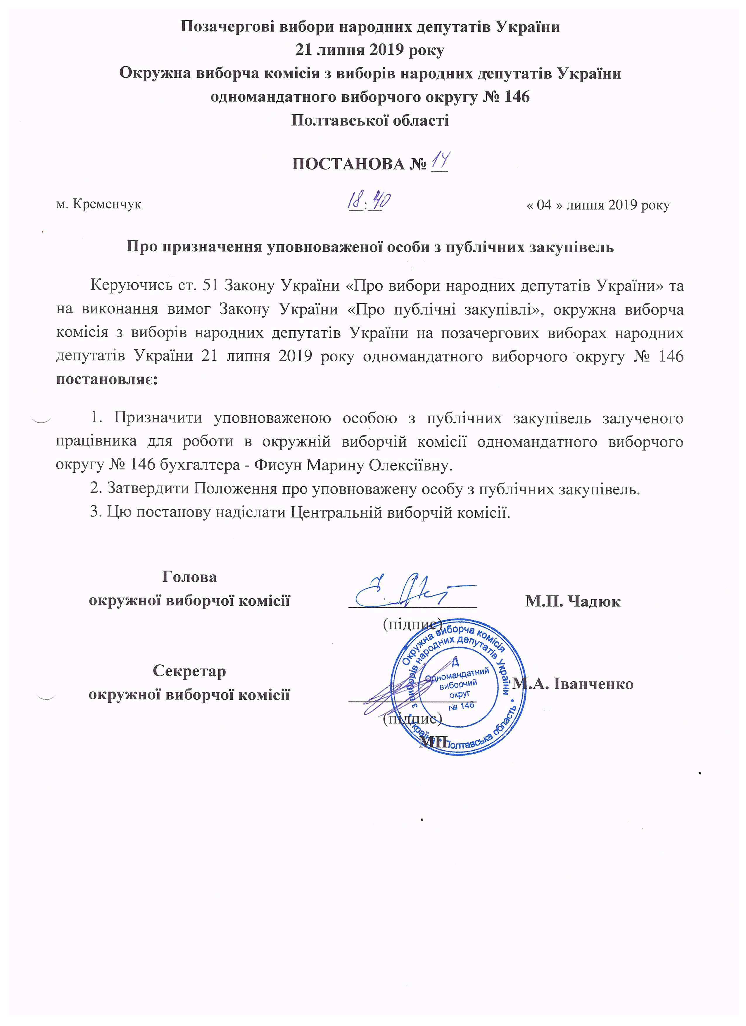 Про розподіл обов'язків членів окружної виборчої комісії з виборів народних депутатів України на позачергових виборах народних депутатів України 21 липня 2019 року одномандатного виборчого округу №146 |