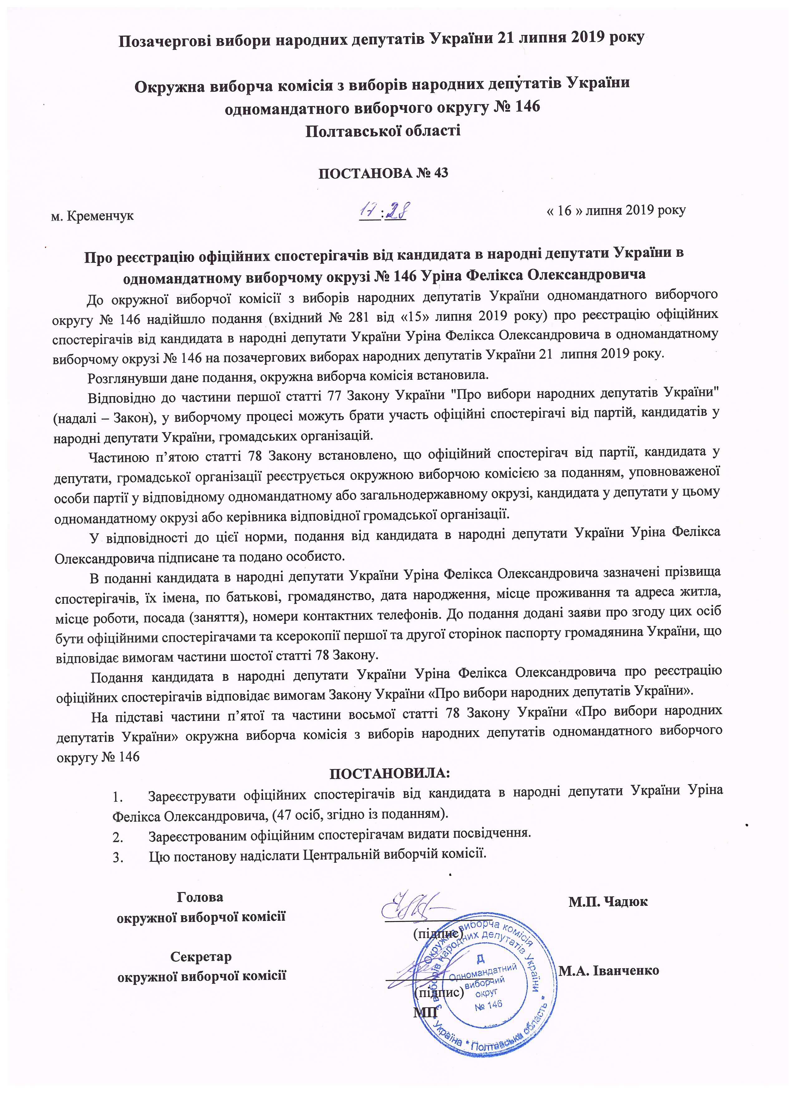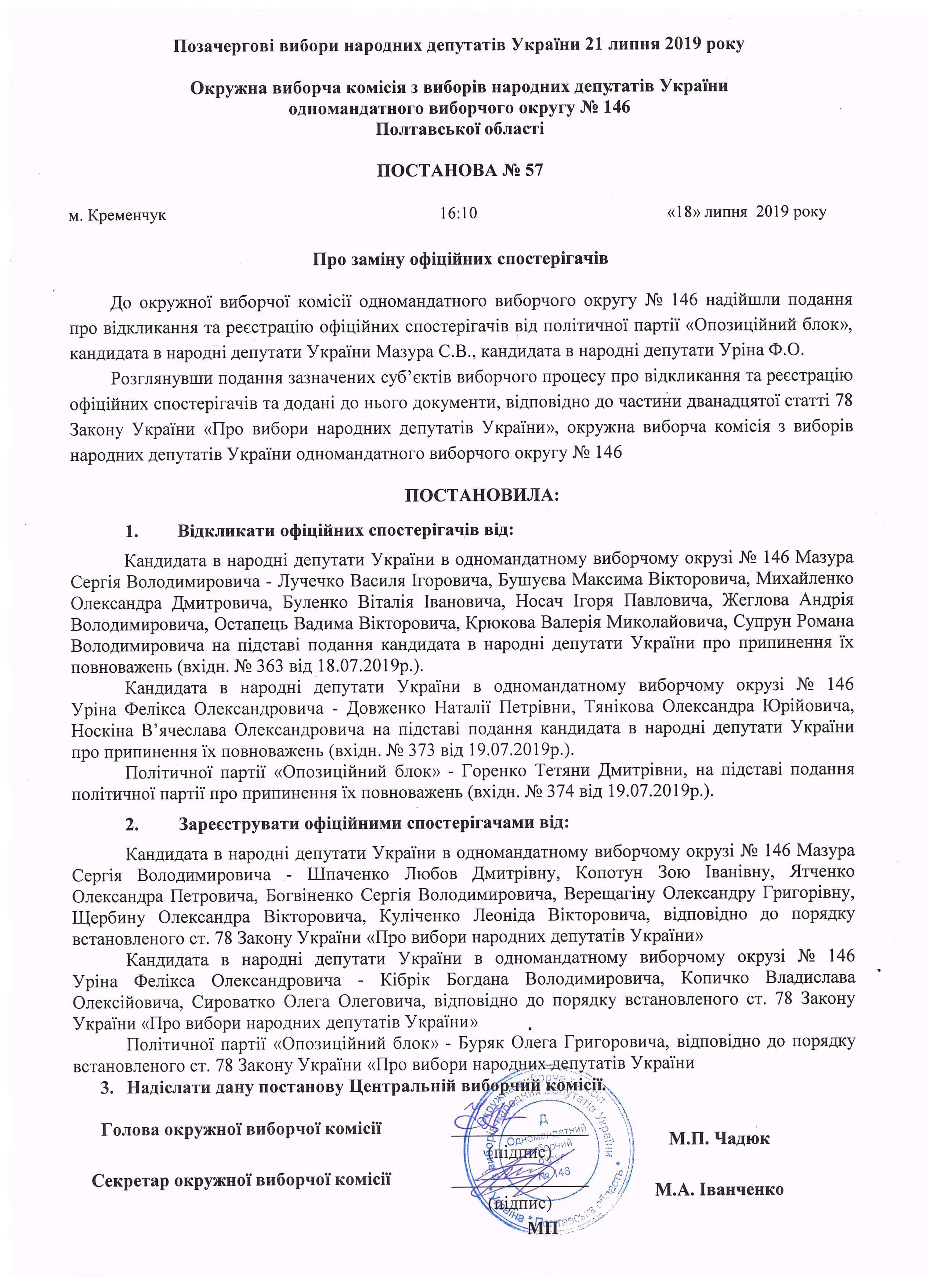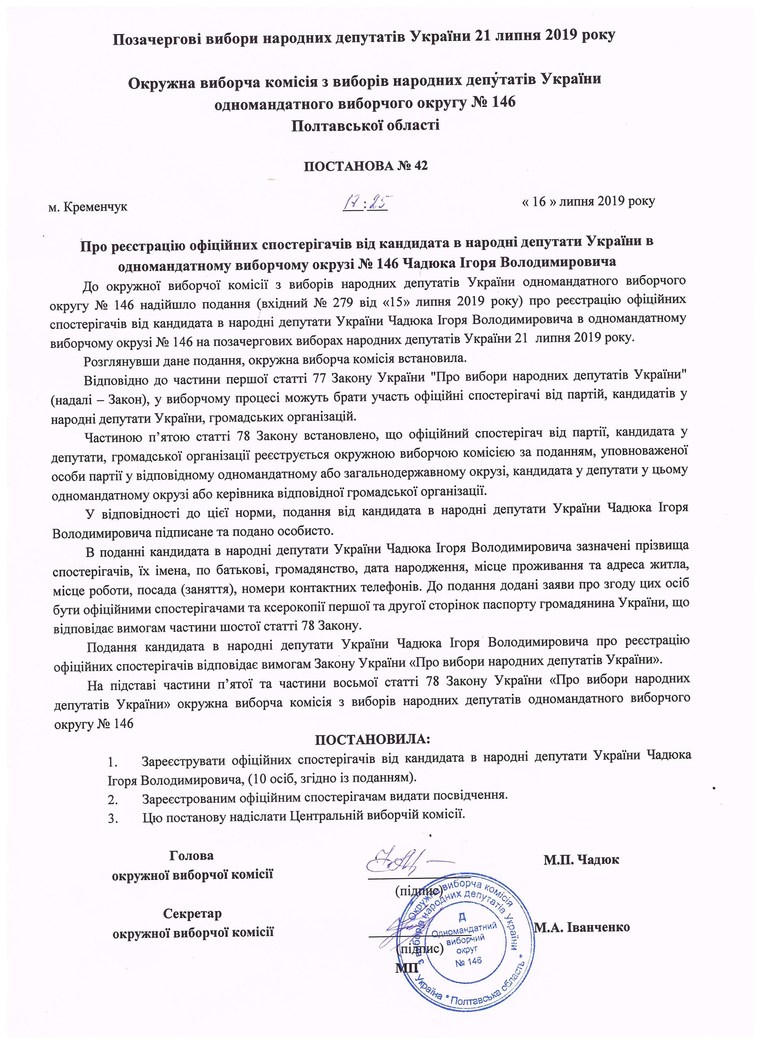 Про реєстрацію офіційних спостерігачів від кандидата в народні депутати Чадюка І.В. |