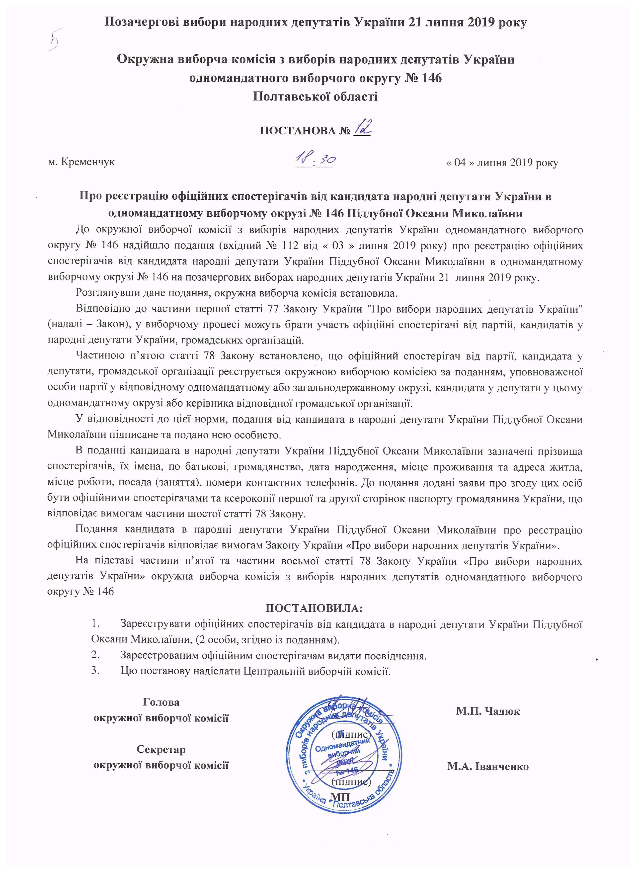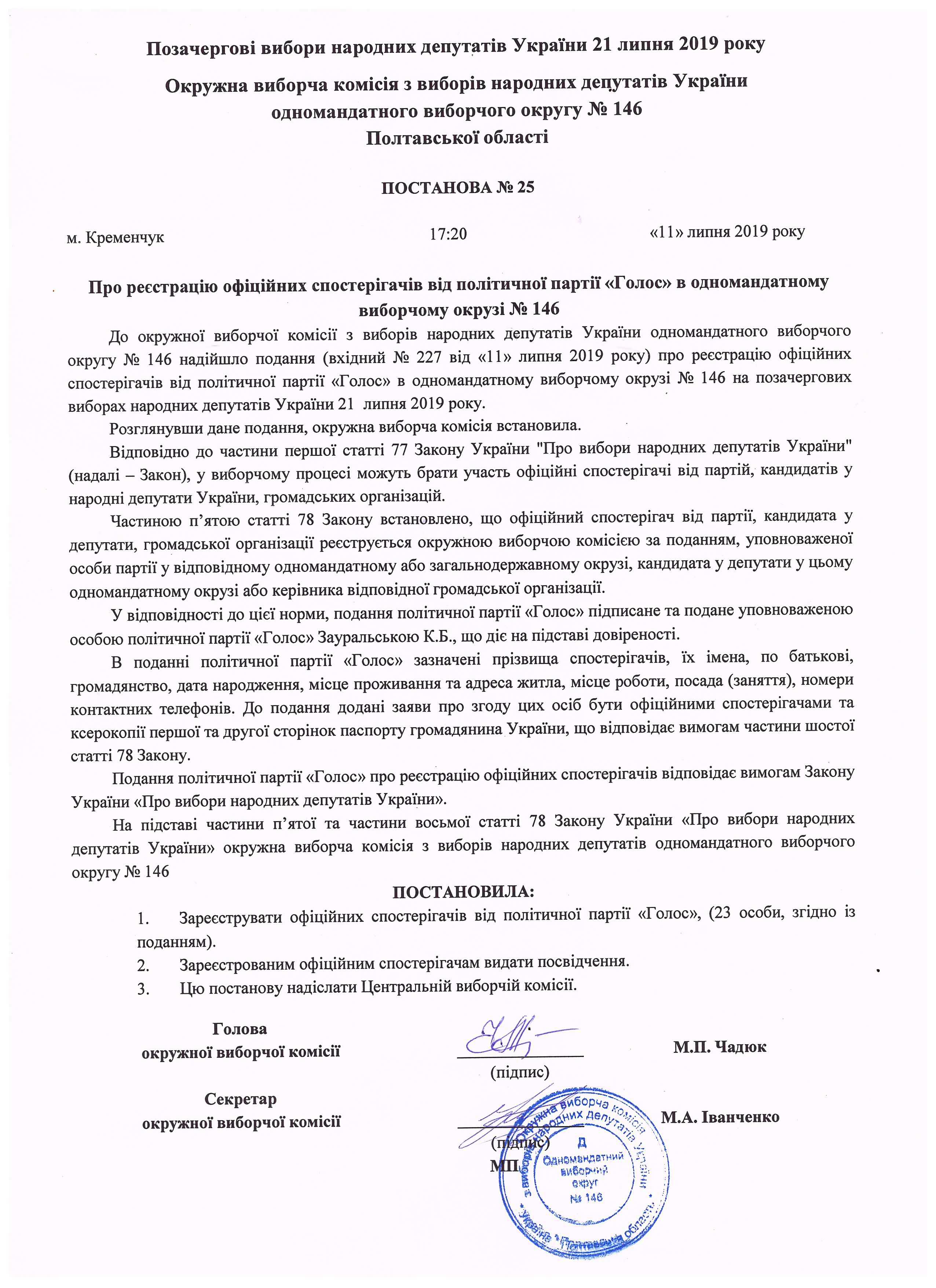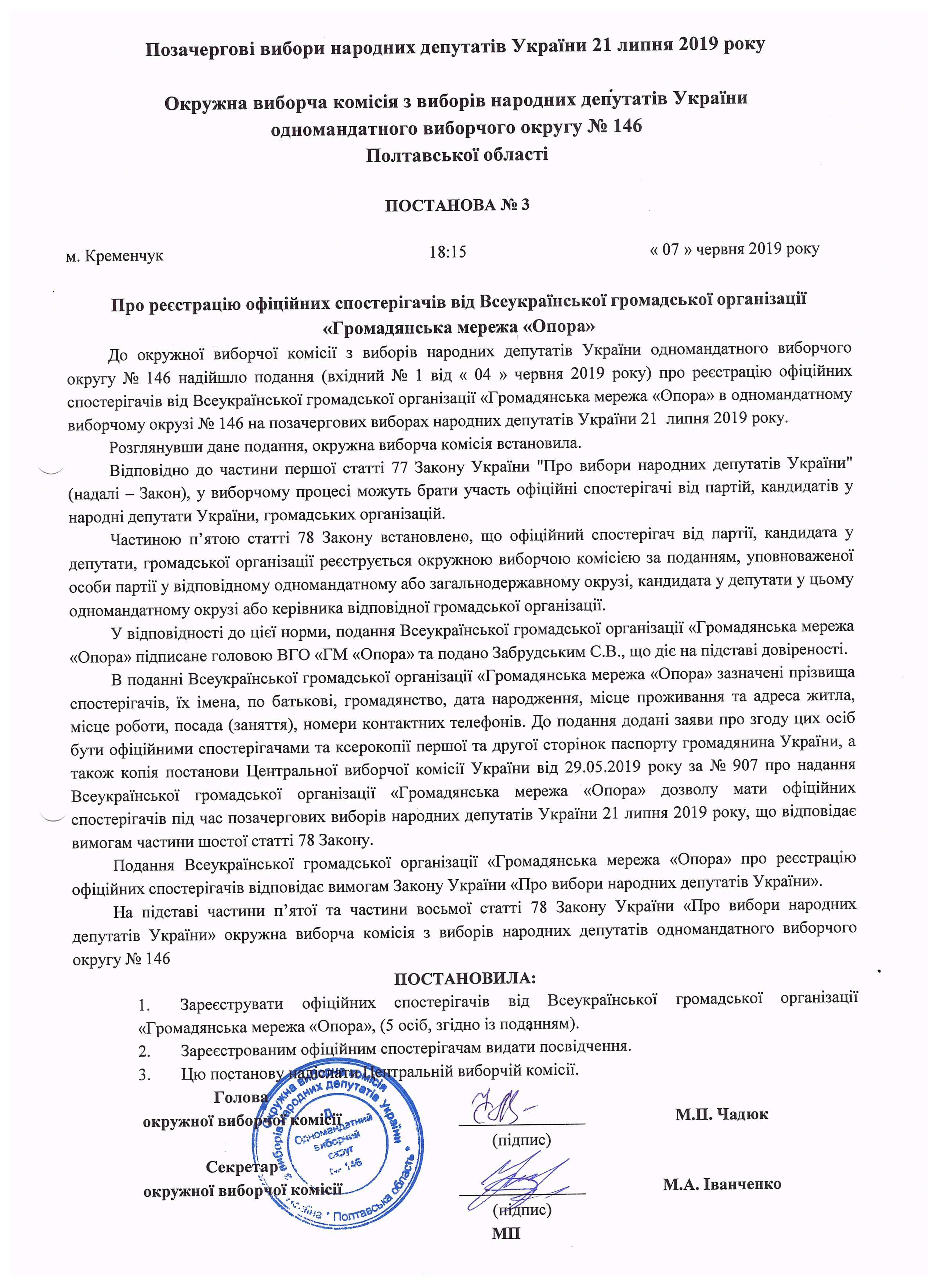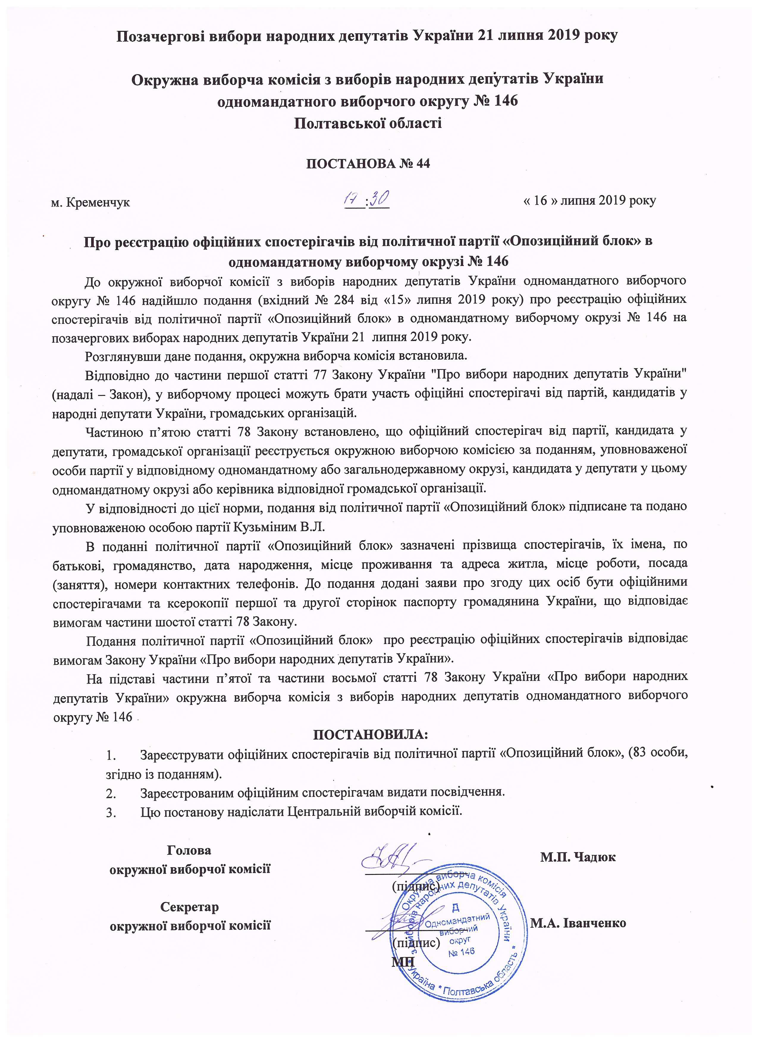 Про реєстрацію офіційних спостерігачів від кандидата в народні депутати Чадюка І.В. |
