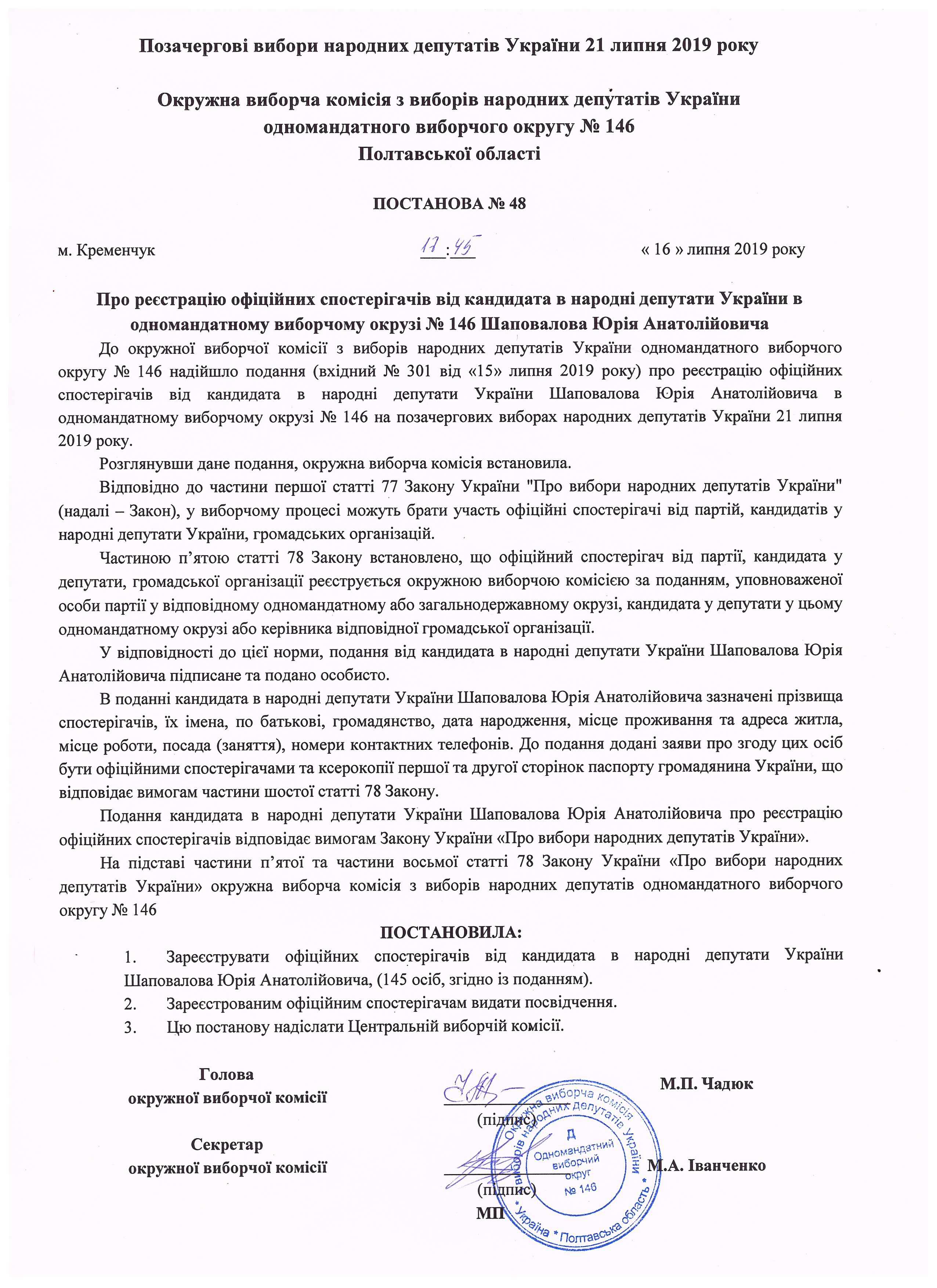 Про реєстрацію офіційних спостерігачів від кандидата в народні депутати Шаповалова Ю.А. |