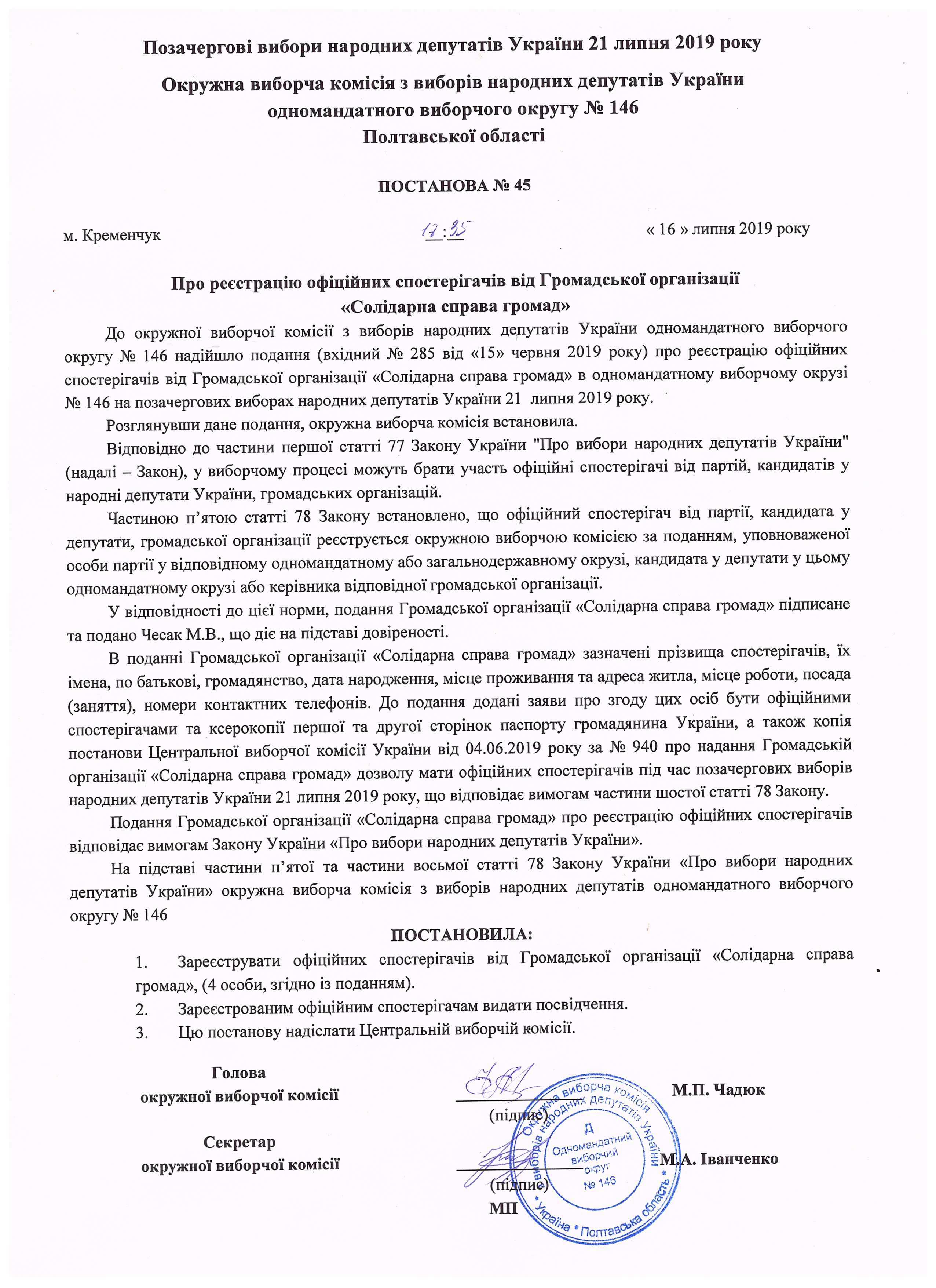 Про реєстрацію офіційних спостерігачів від громадської організації "Солідарна справа громад" |