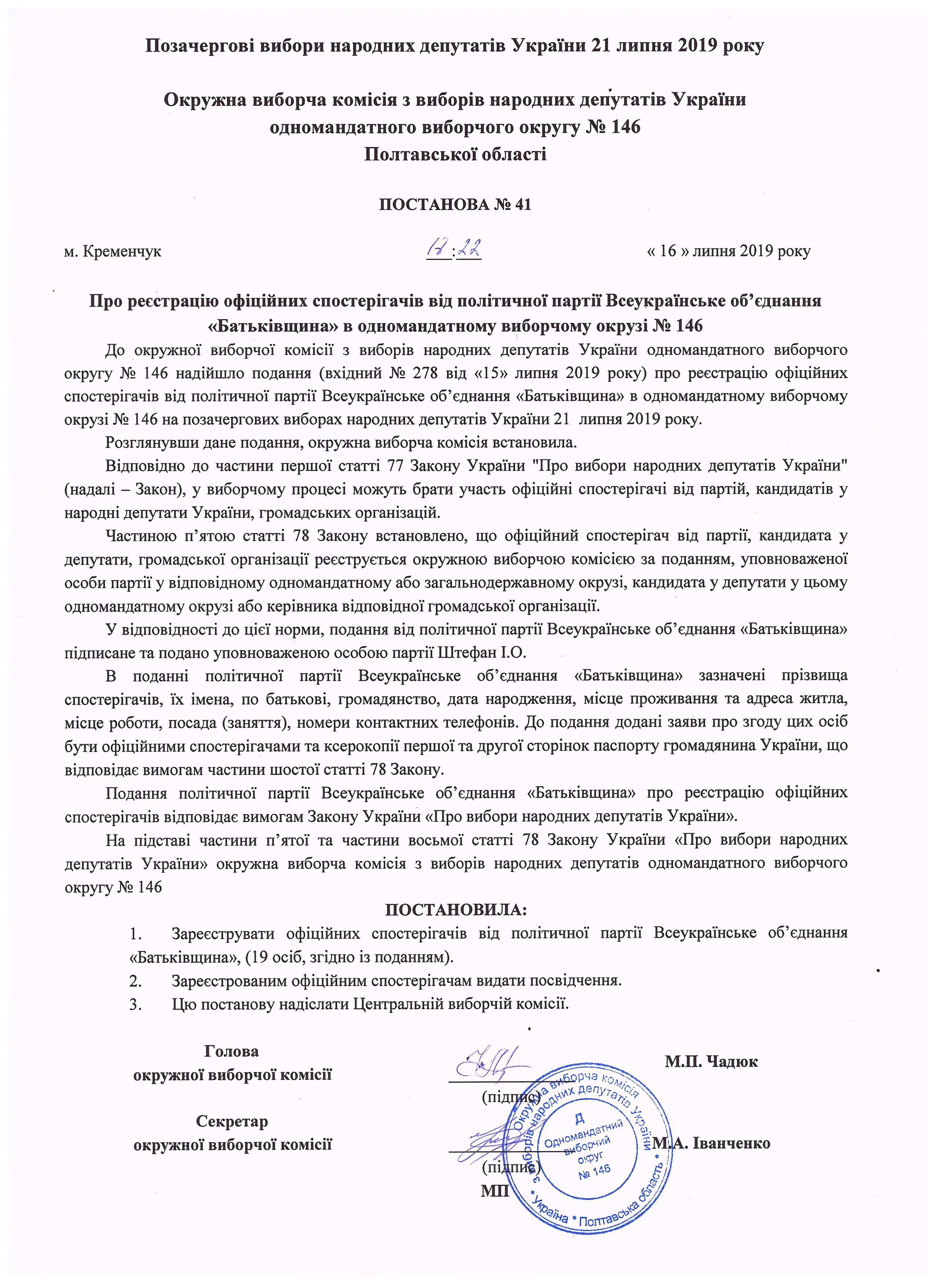 Про реєстрацію офіційних спостерігачів від політичної партії "Всеукраїнське об'єднання "Батьківщина" |