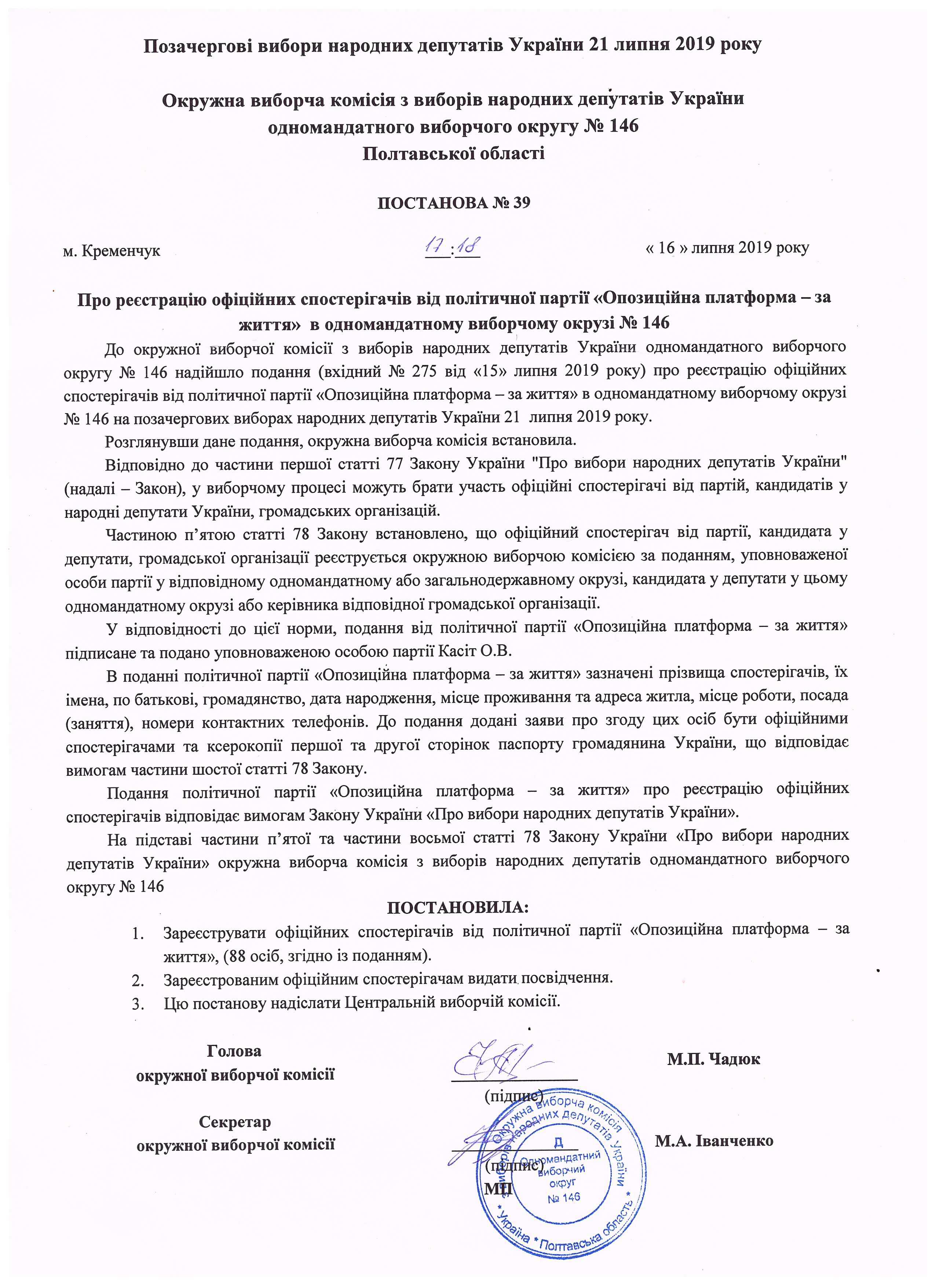 Про реєстрацію офіційних спостерігачів від політичної партії "Опозиційна платформа – за життя" |