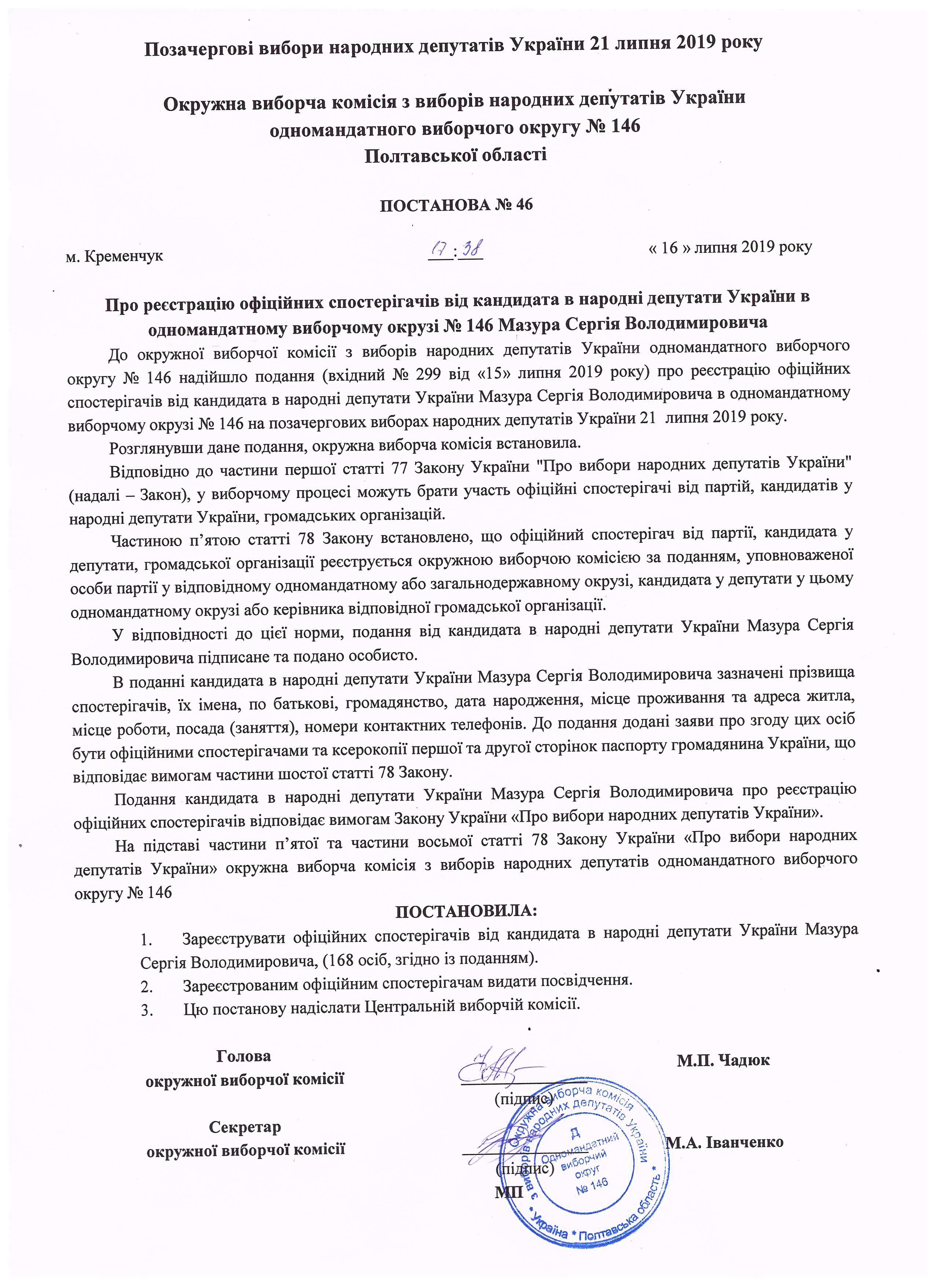 Про реєстрацію офіційних спостерігачів від кандидата в народні депутати Мазура С.В. |