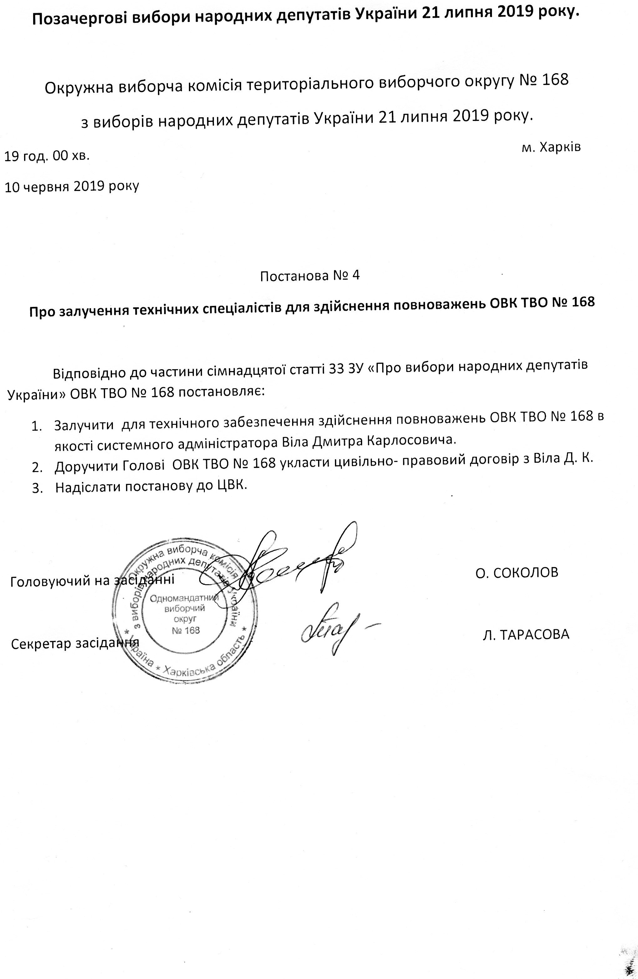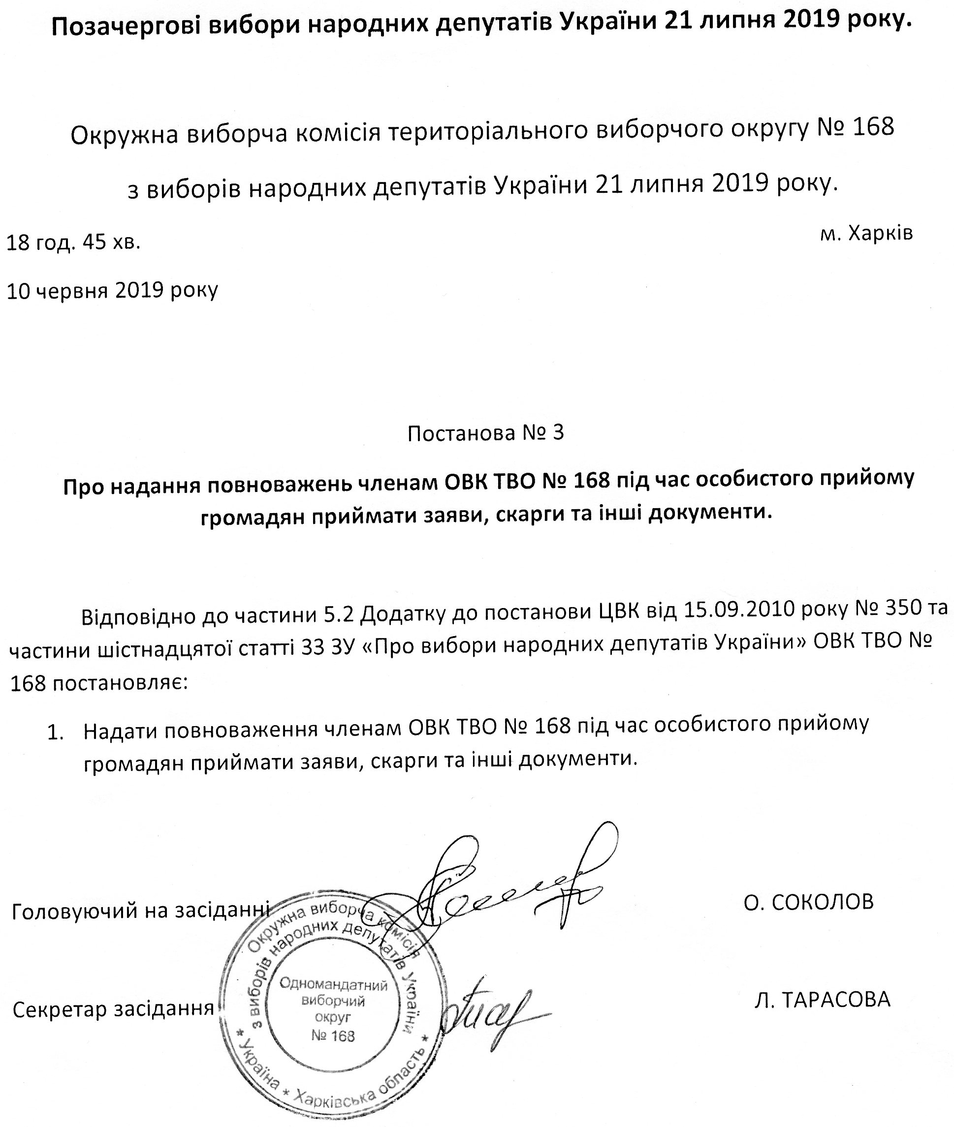Про включення до складу дільничних виборчих комісій з виборів народних депутатів України на позачергових виборах народних депутатів України 21 липня 2019 року ово № 168 кандидатур і розподіл керівних посад в дільничних виборчих комісіях |