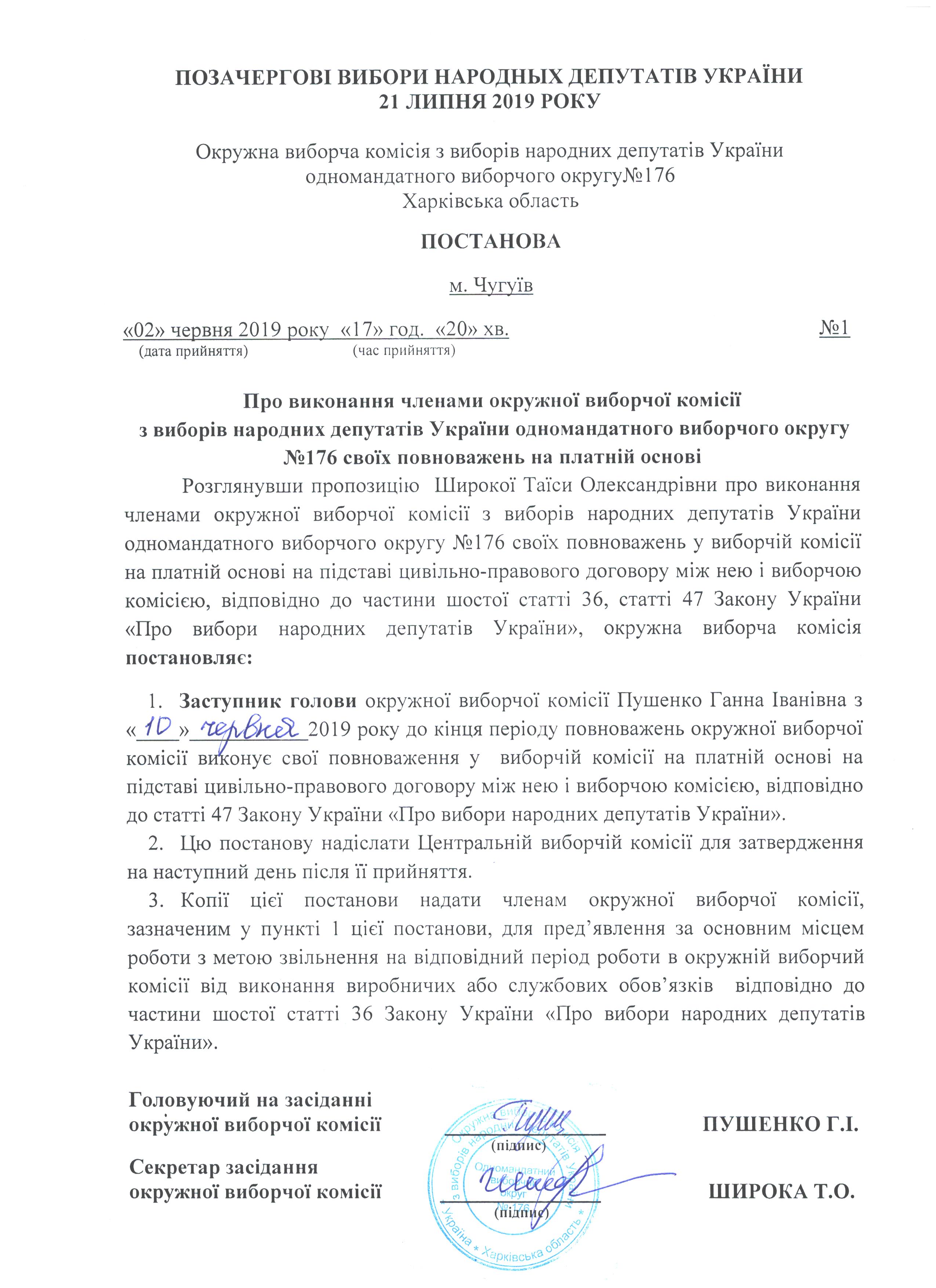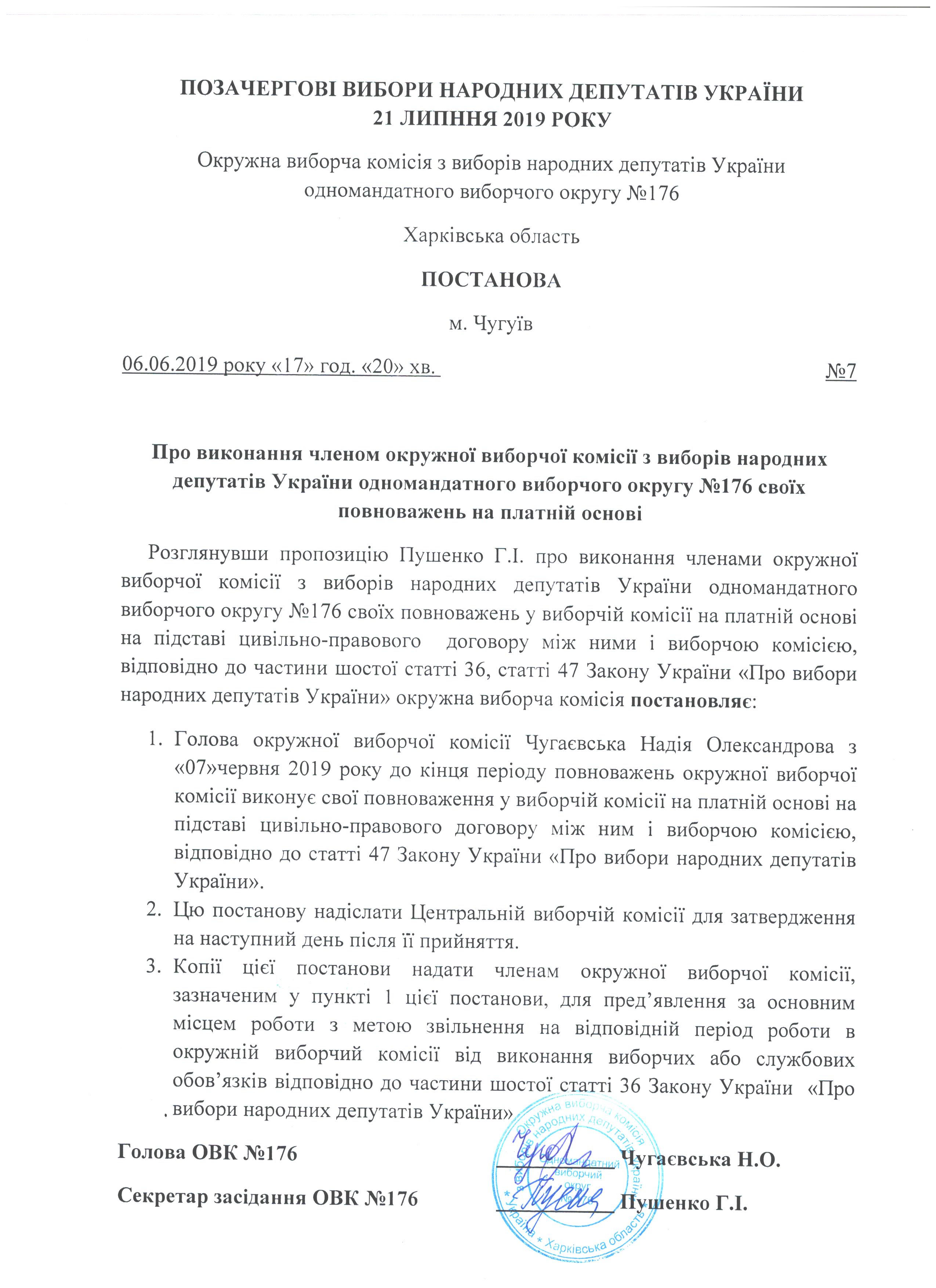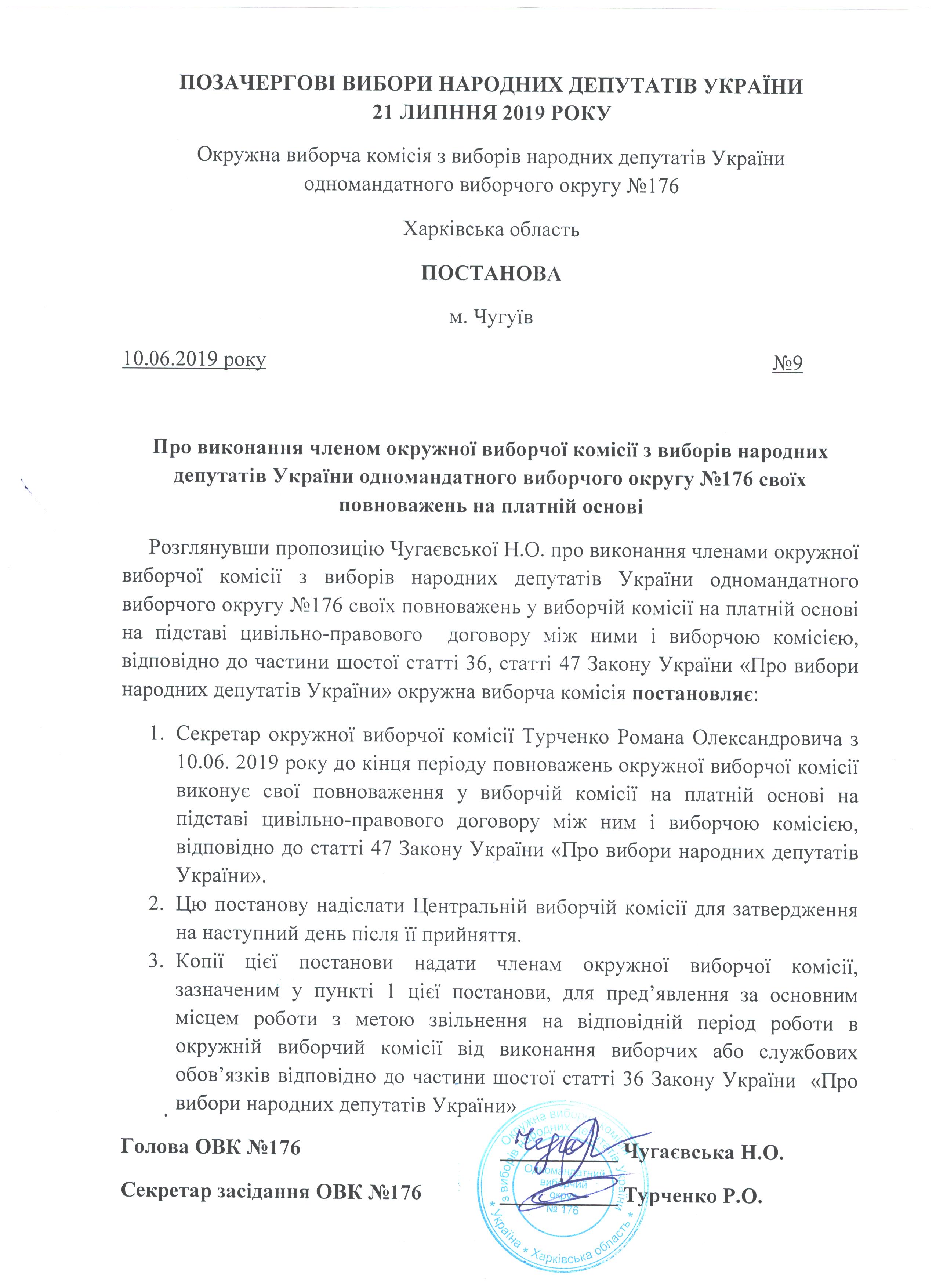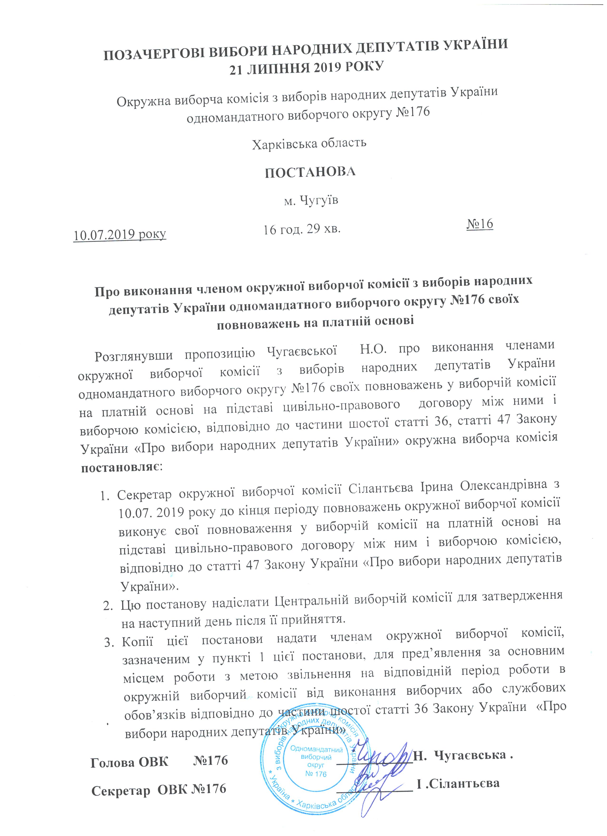Про виконання членом окружної виборчої комісії з виборів народних депутатів України одномандатного виборчого округу №176 своїх повноважень на платній основі |