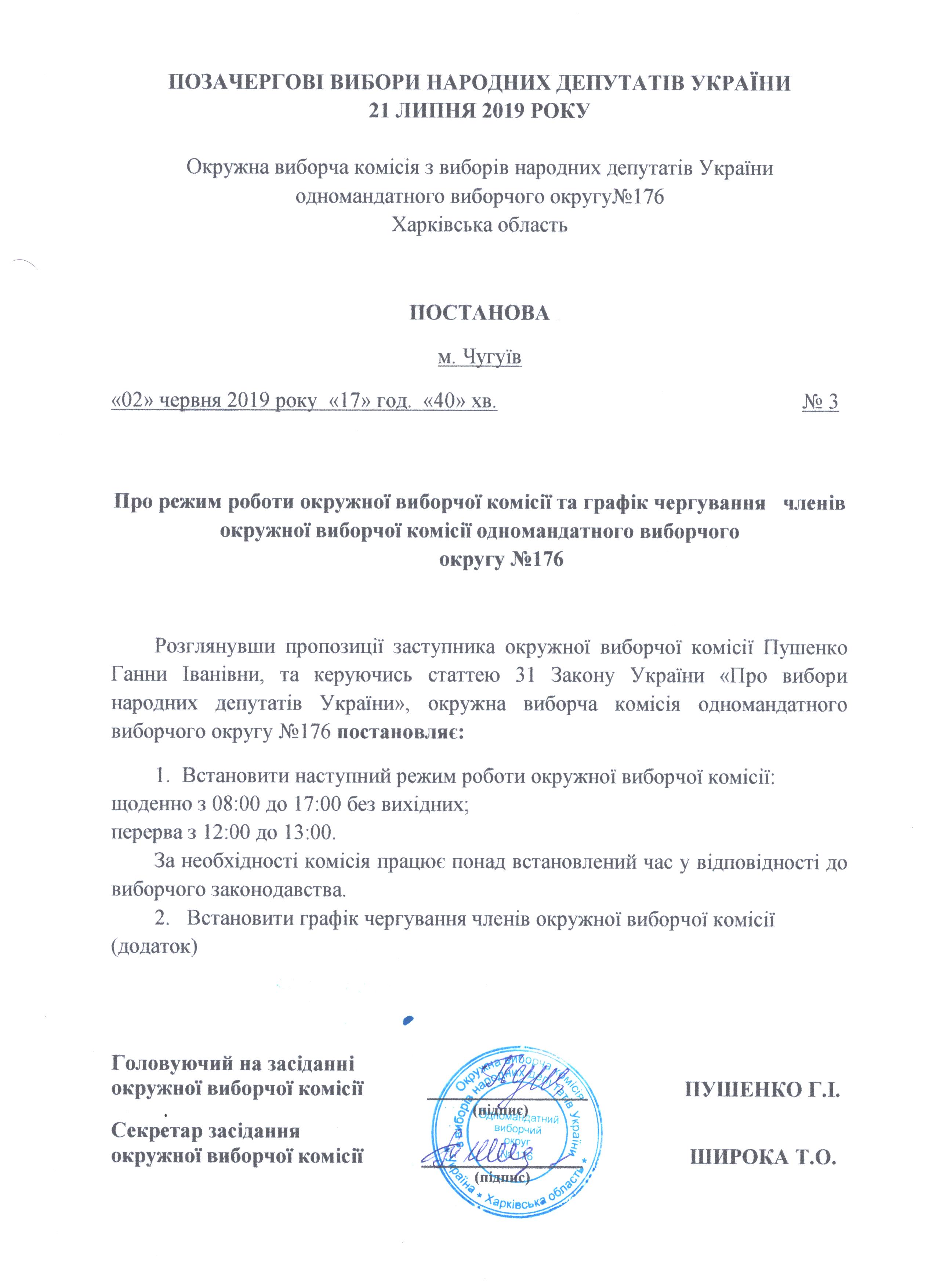 Про режим роботи ОВК та графік чергування членів ОВК одномандатного виборчого округу № 176 |