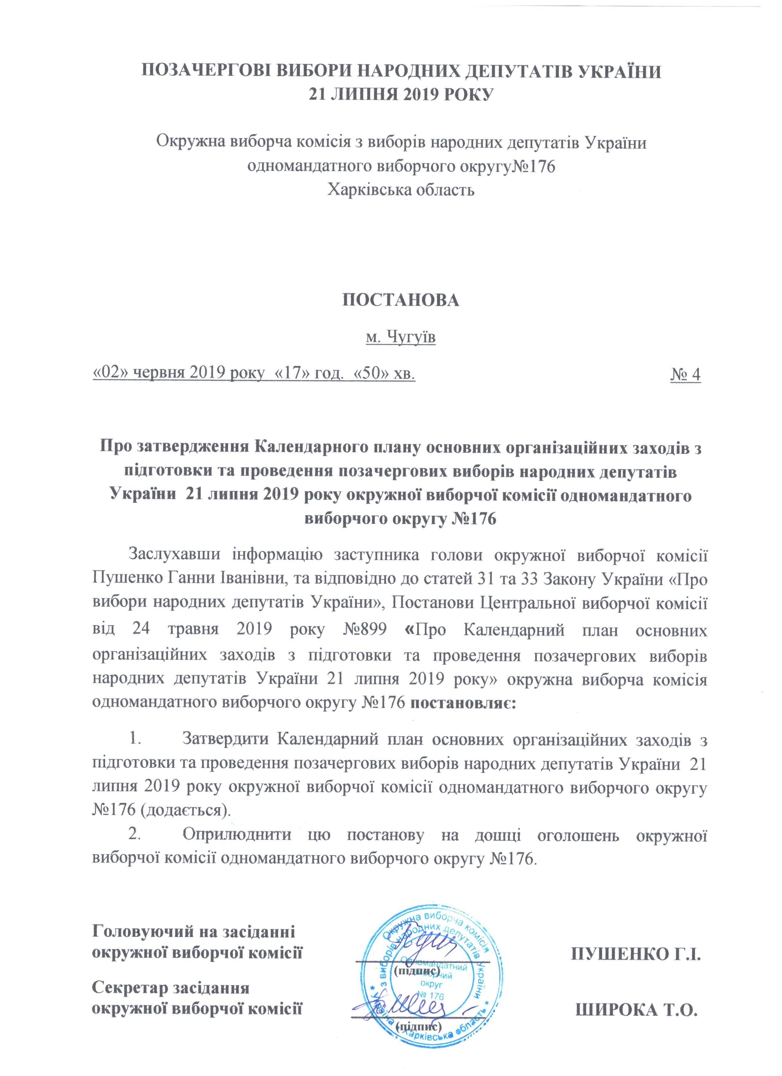 Про затвердження Календарного плану основних організаційних заходів підготовки та проведення позачергових виборів народних депутатів України 21 липня 2019 року ОВК ОВО №176 |