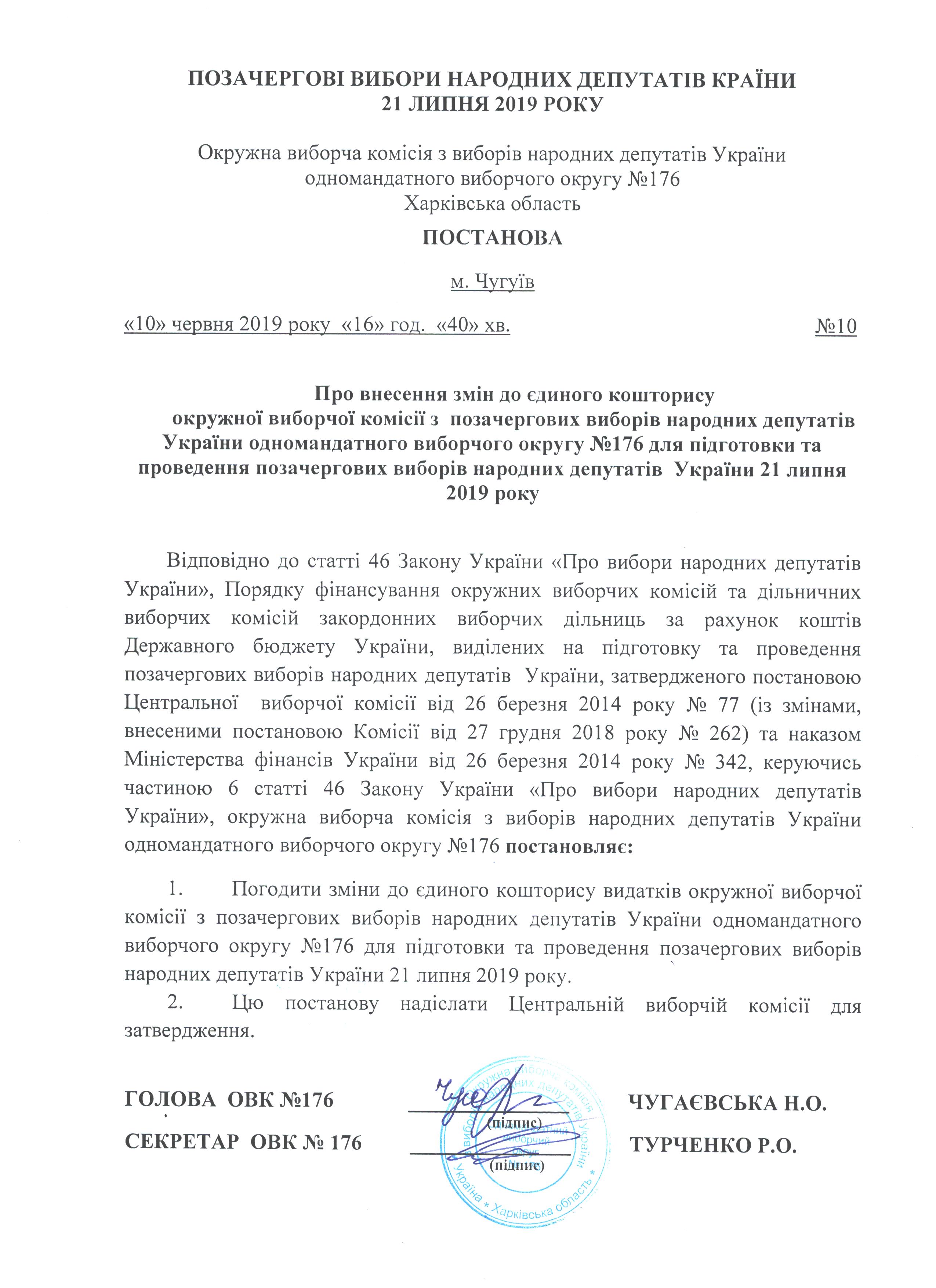 Про внесення змін до єдиного кошторису ОВК з позачергових виборів народних депутатів України ОВО № 176 для підготовки та проведення позачергових виборів народних депутатів України 21 липня 2019 року |