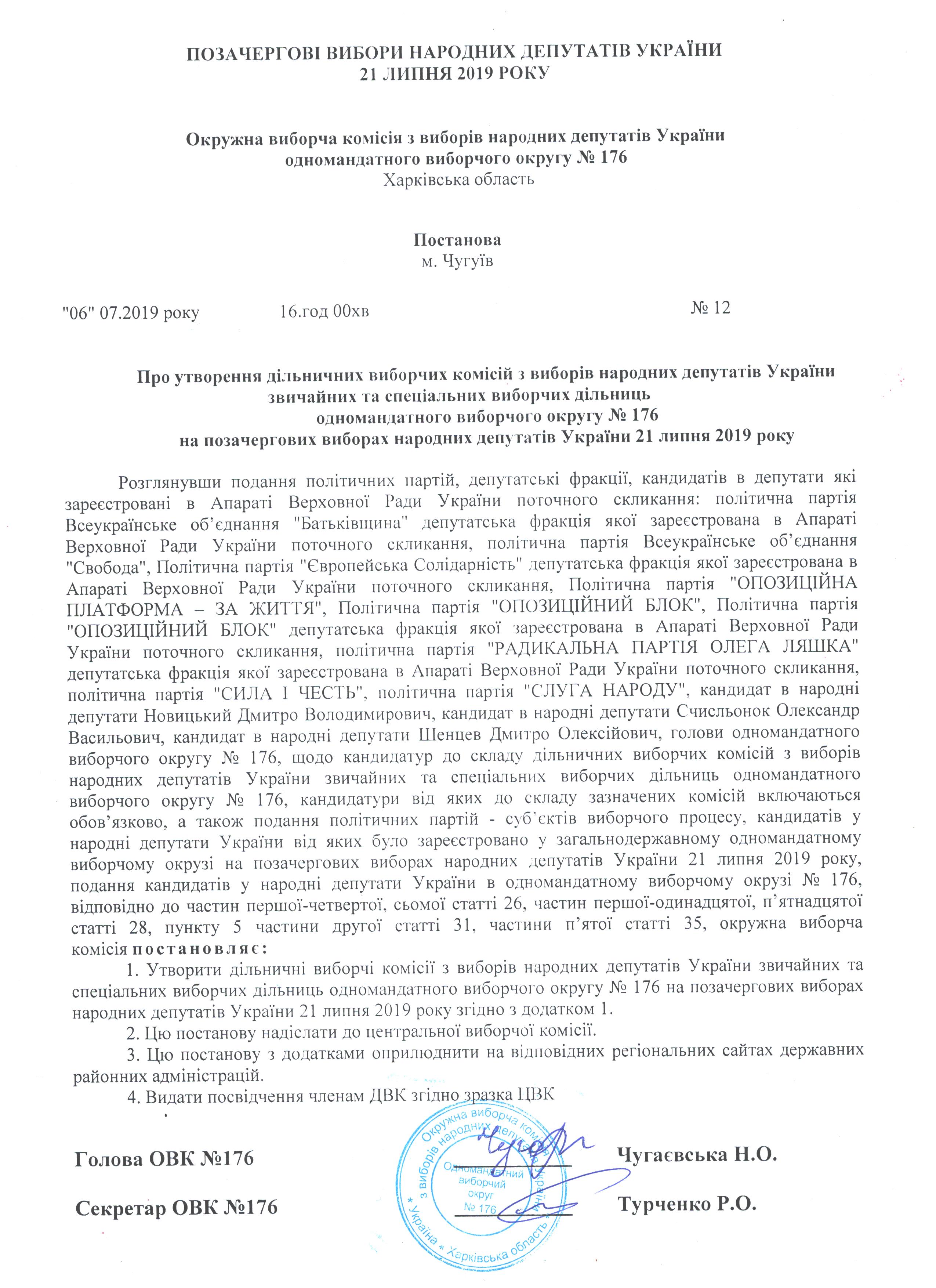 Про внесення змін до постанови №12 від 06.07.2019 року "Про утворення дільничних виборчих комісій з виборів народних депутатів України звичайних та спеціальних виборчих дільниць одномандатного виборчого округу №176 на позачергових виборах народних депутатів України 21 липня 2019 року |
