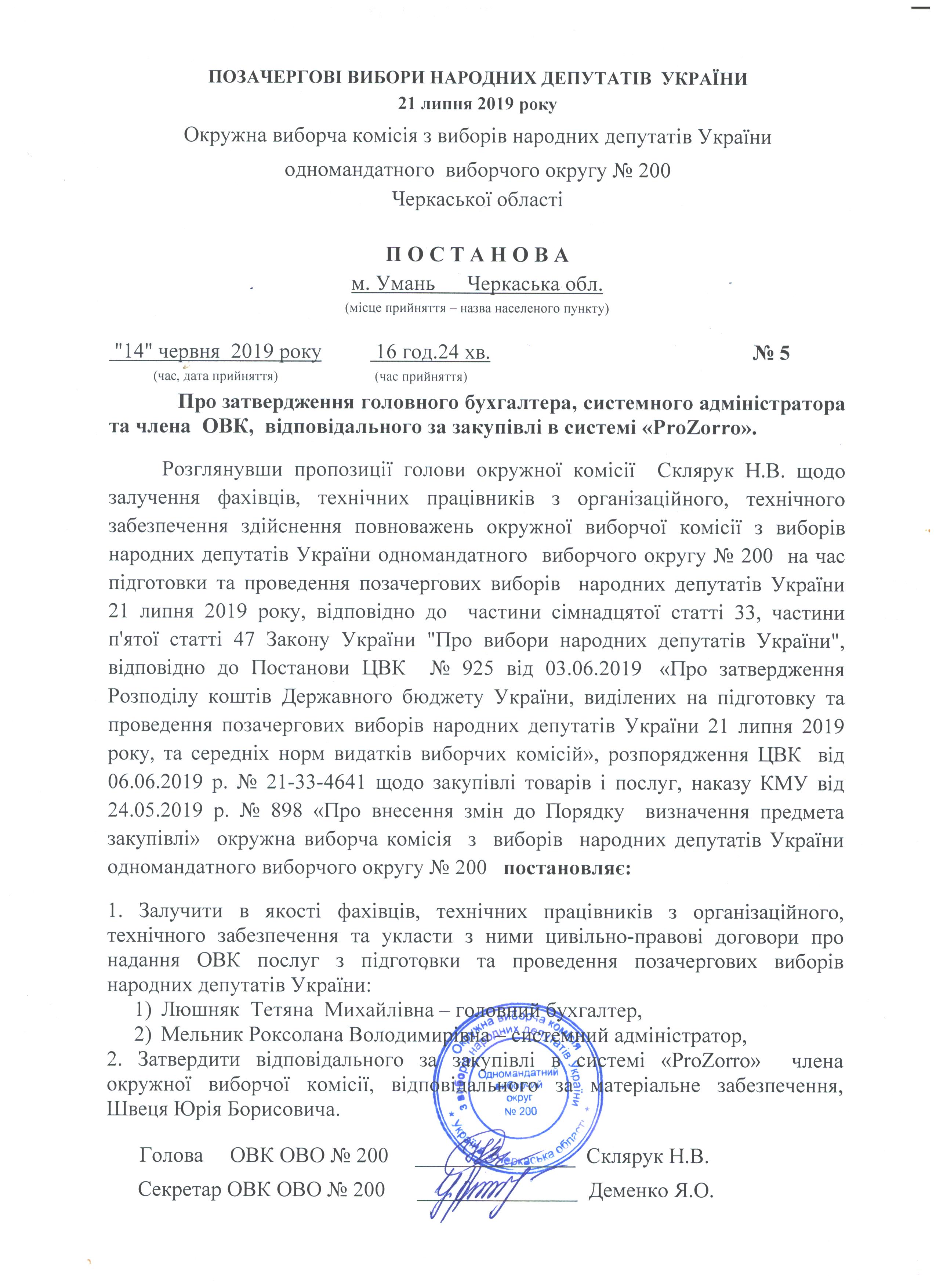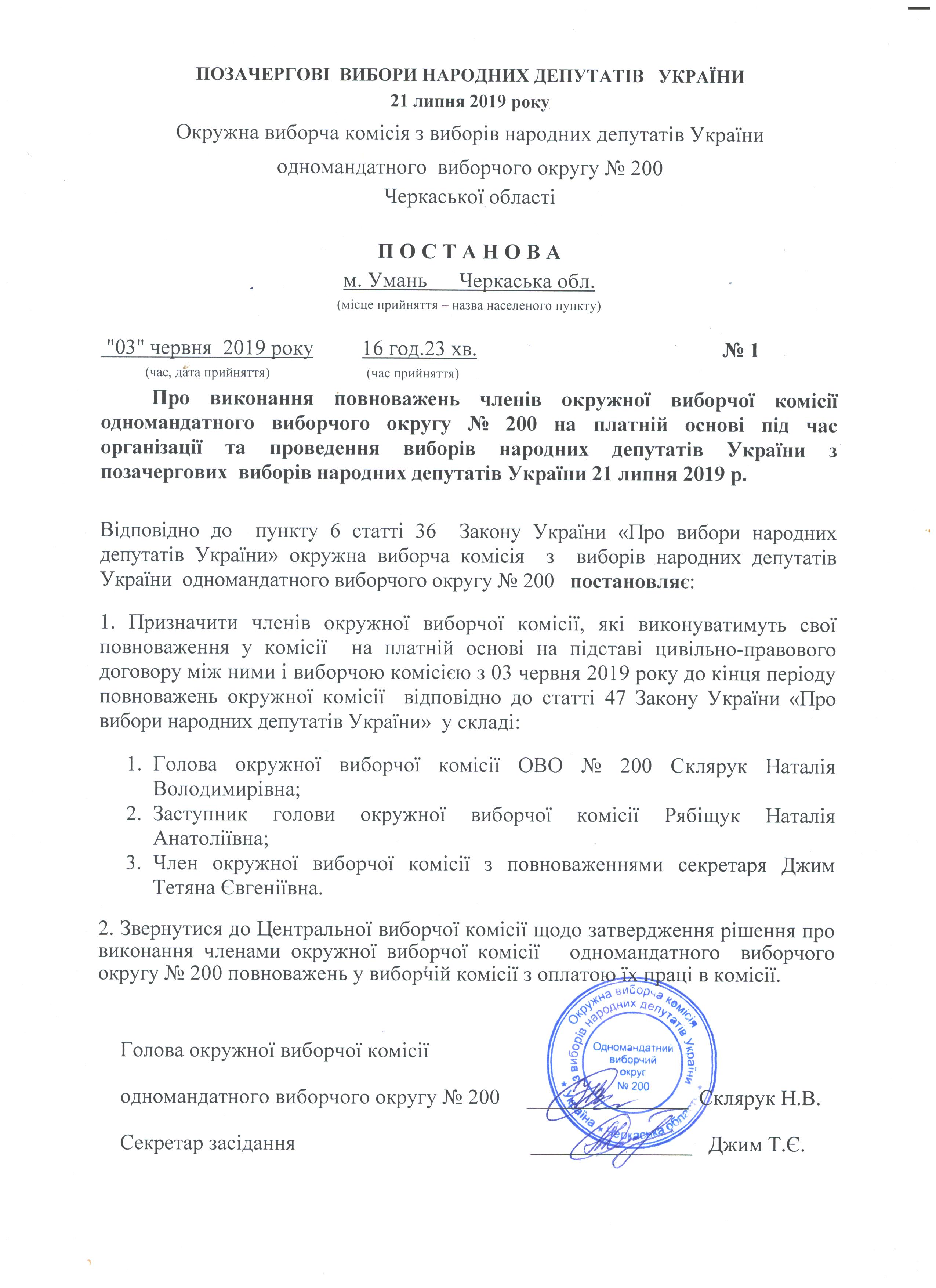 Про виконання повноважень членів окружної виборчої комісії одномандатного виборчого округу № 200 на платній основі під час організації та проведення виборів народних депутатів України з позачергових виборів народних депутатів України 21 липня 2019р |