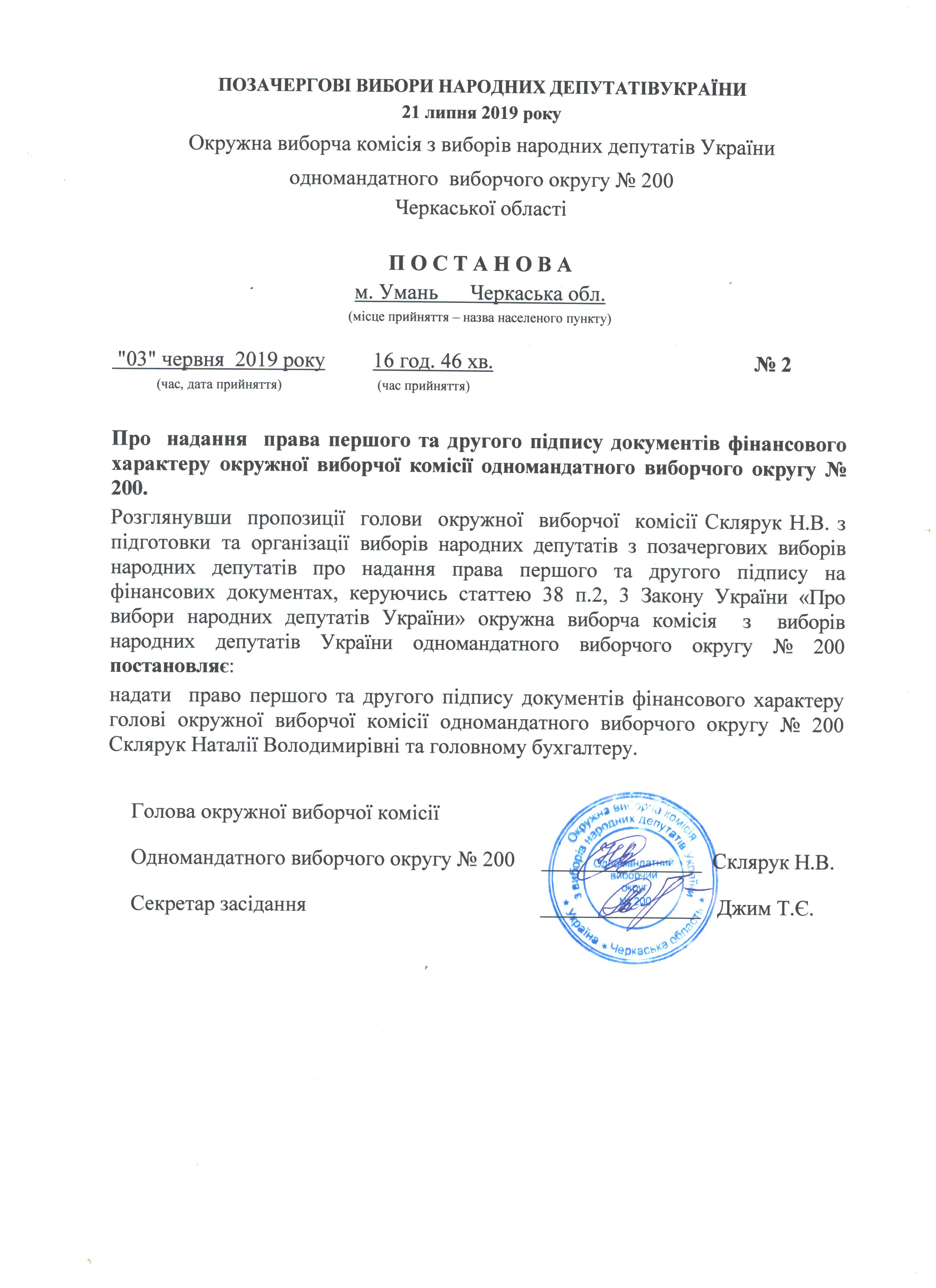 Про надання права першого та другого підпису документів фінансового характеру окружної виборчої комісії одномандатного виборчого округу № 200 |