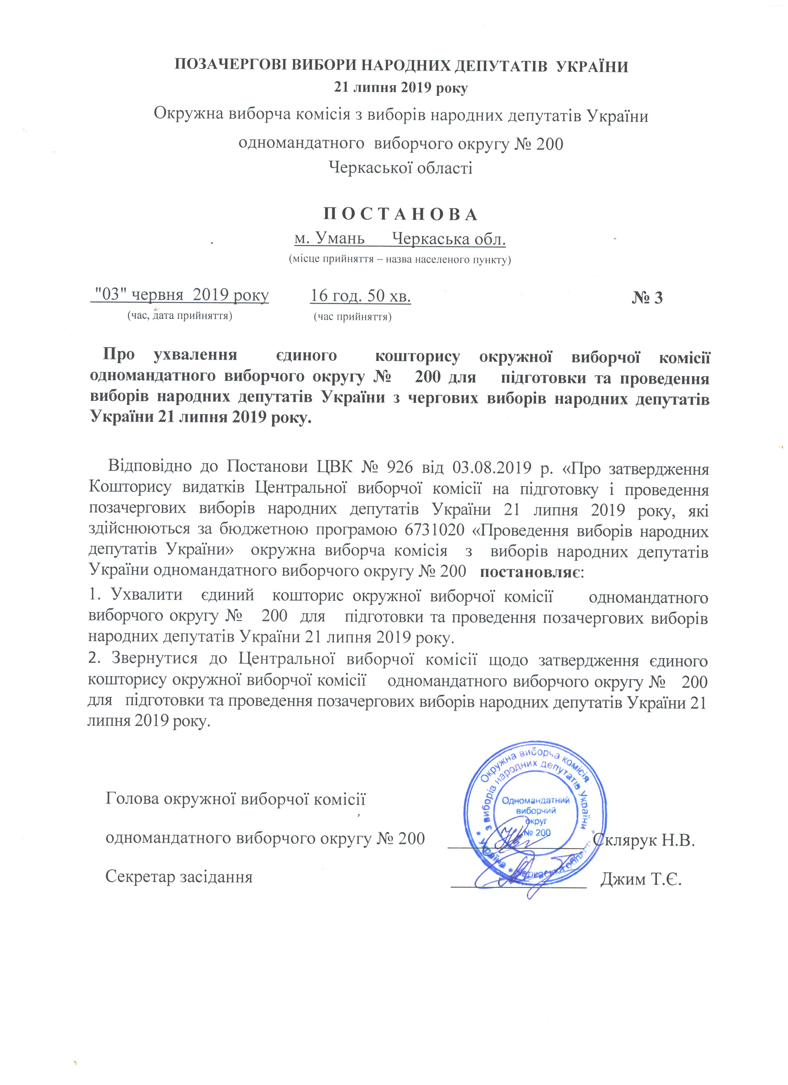 Про ухвалення єдиного кошторису окружної виборчої комісії одномандатного виборчого округу № 200 для підготовки та проведення виборів народних депутатів України з чергових виборів народних депутатів України 21 липня 2019 року |