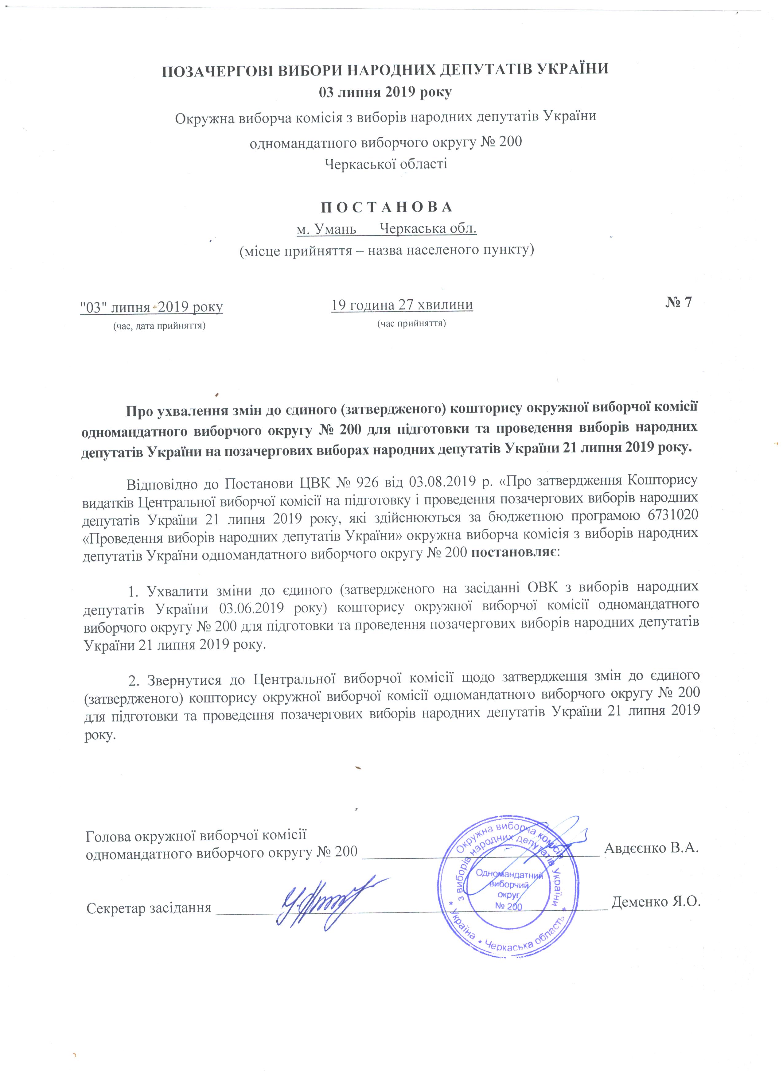 Про ухвалення змін до єдиного(затвердженого) кошторису окружної виборчої комісії одномандатного виборчого округу №200 для підготовки та проведення виборів народних депутатів України на позачергових виборах народних депутатів України 21 липня 2019 року |