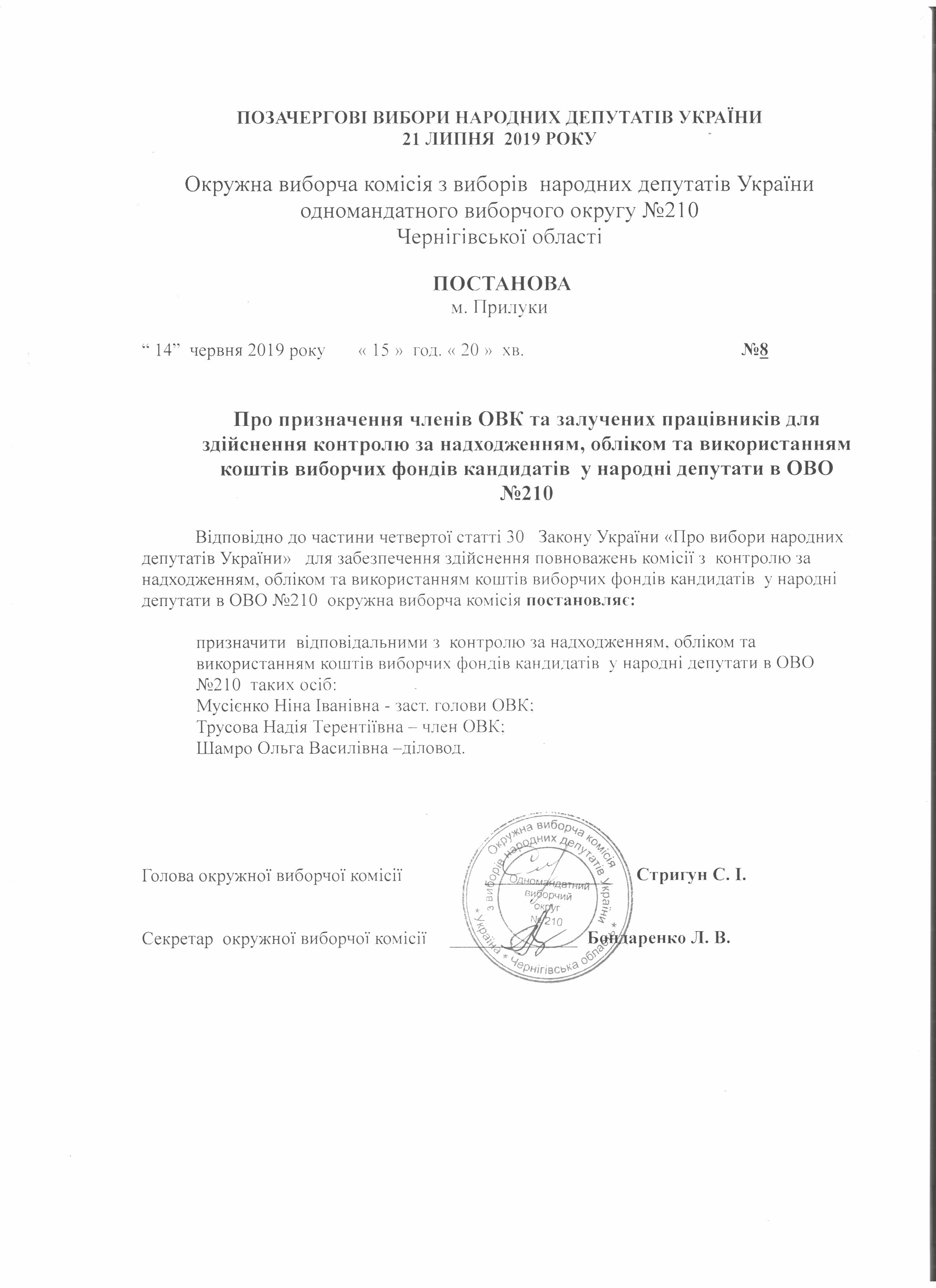 Про призначення членів ОВК та залучених працівників для здійснення контролю за надходженням, обліком та використанням коштів виборчих фондів кандидатів у народні депутати в ОВО №210 |