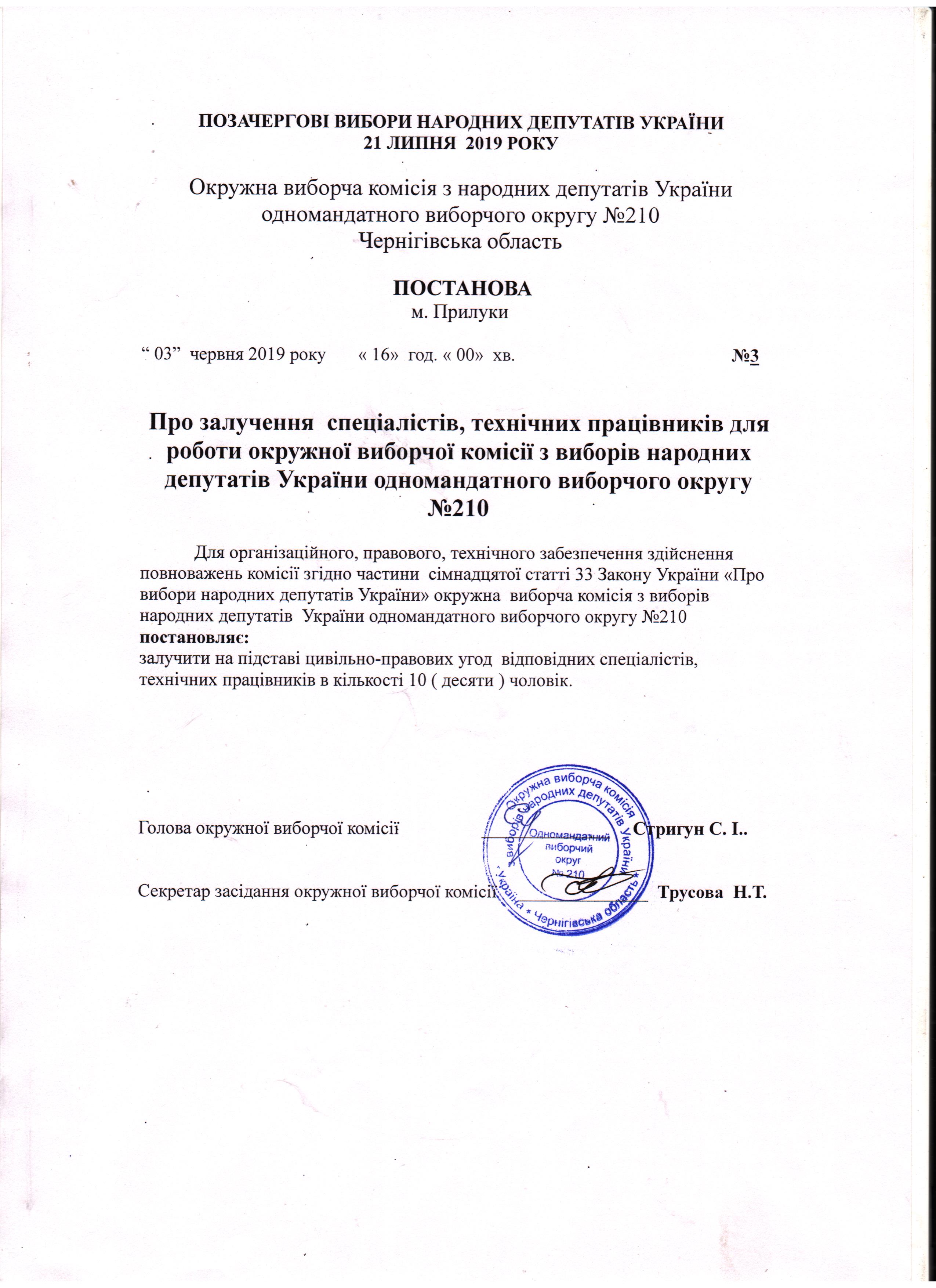 Про залучення спеціалістів, технічних працівників для роботи окружної виборчої комісії з виборів народних депутатів України одномандатного виборчого округу №210 |