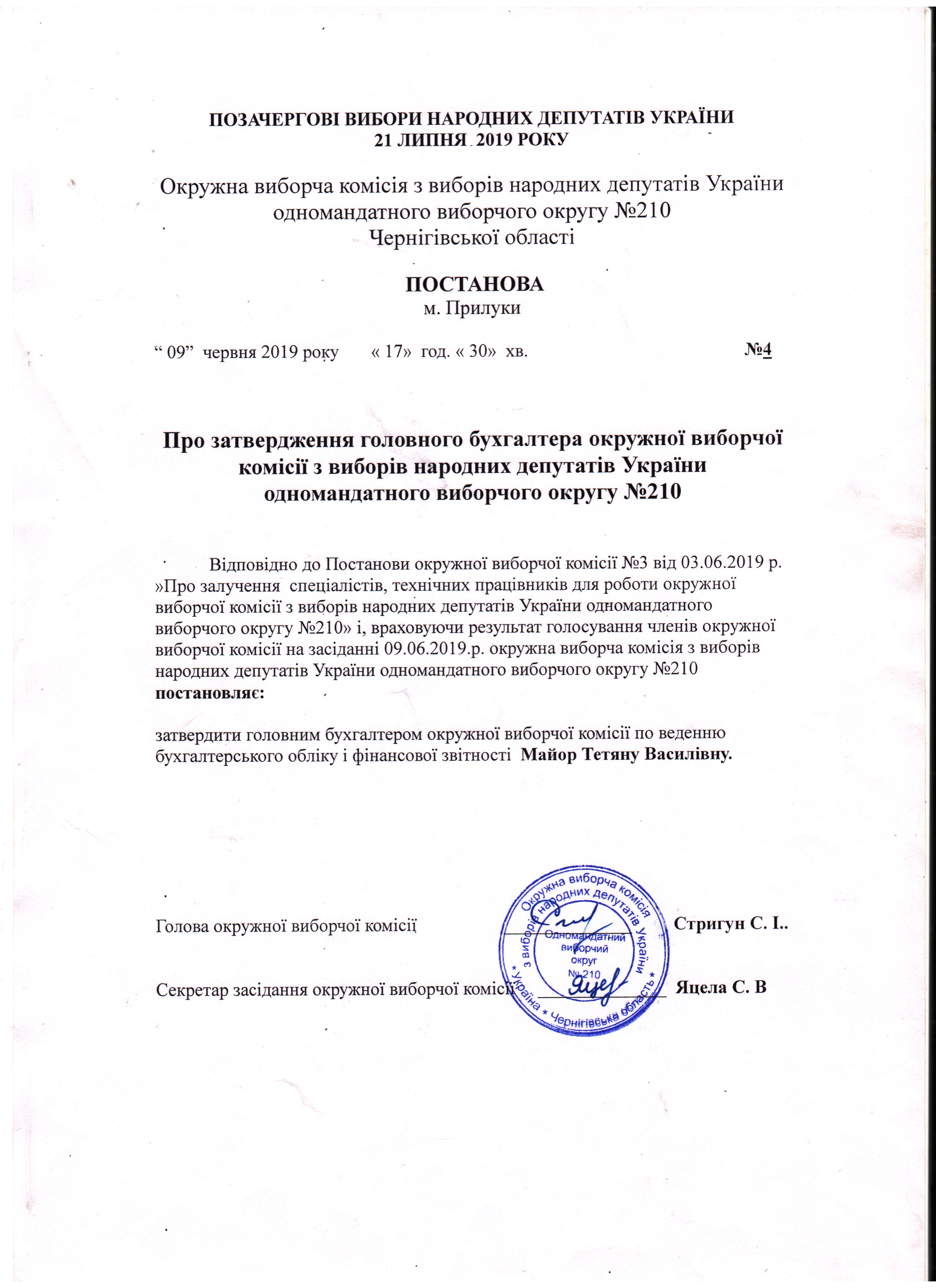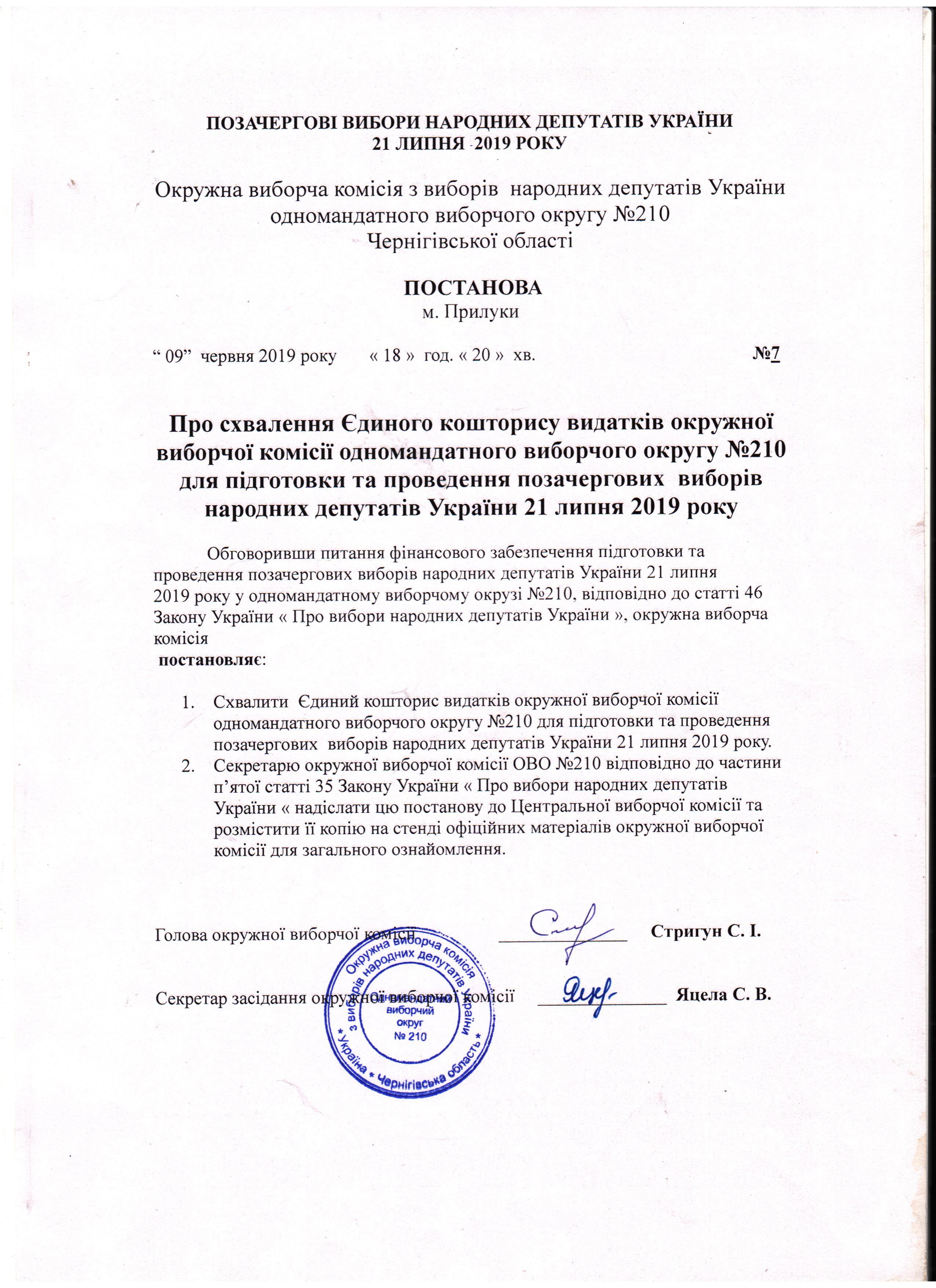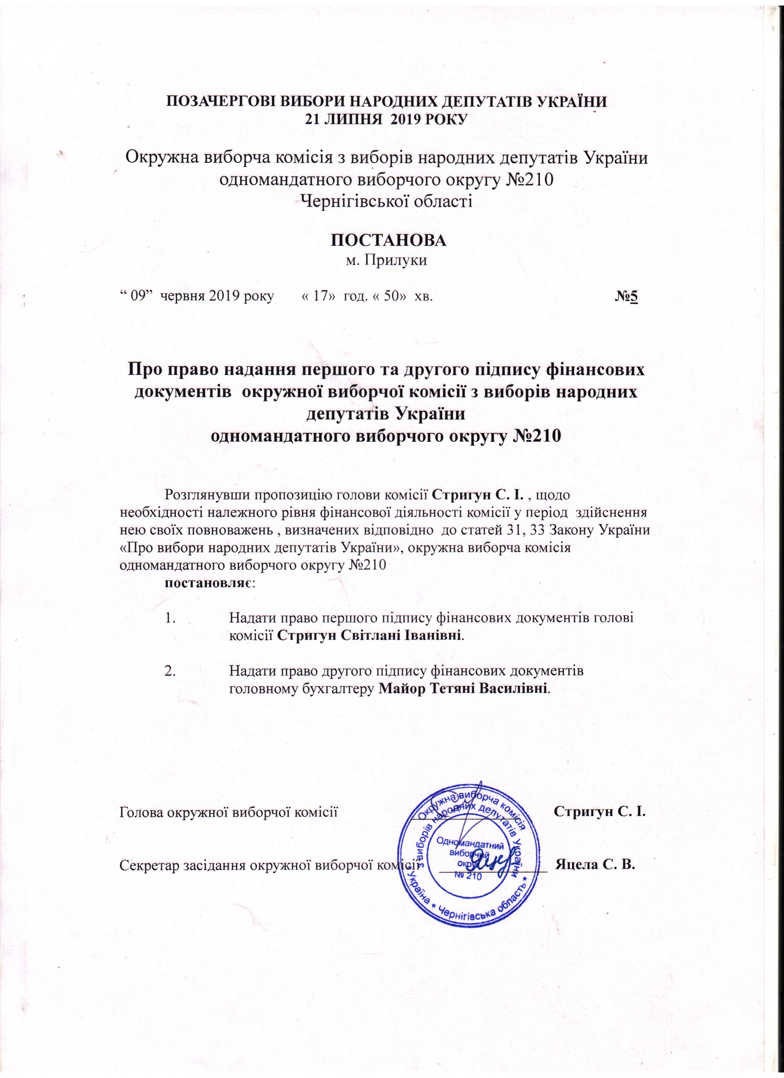 Про право надання першого підпису фінансових документів окружної виборчої комісії з виборів народних депутатів України 21 липня 2019 року одномандатного виборчого округу №210 |
