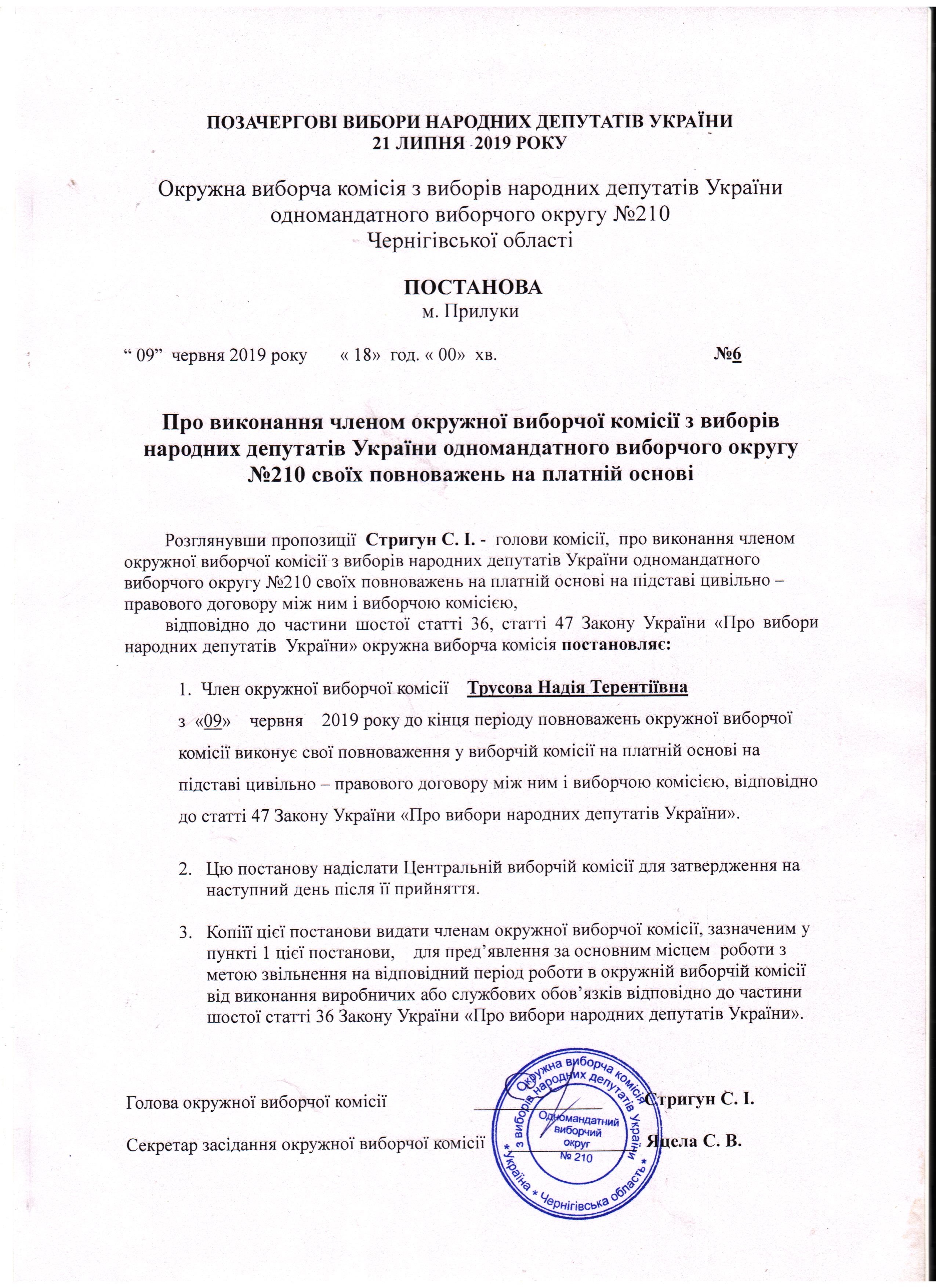 Про виконання членом окружної виборчої комісії з виборів народних депутатів України 21 липня 2019 року одномандатного виборчого округу №210 своїх повноважень на платній основі |