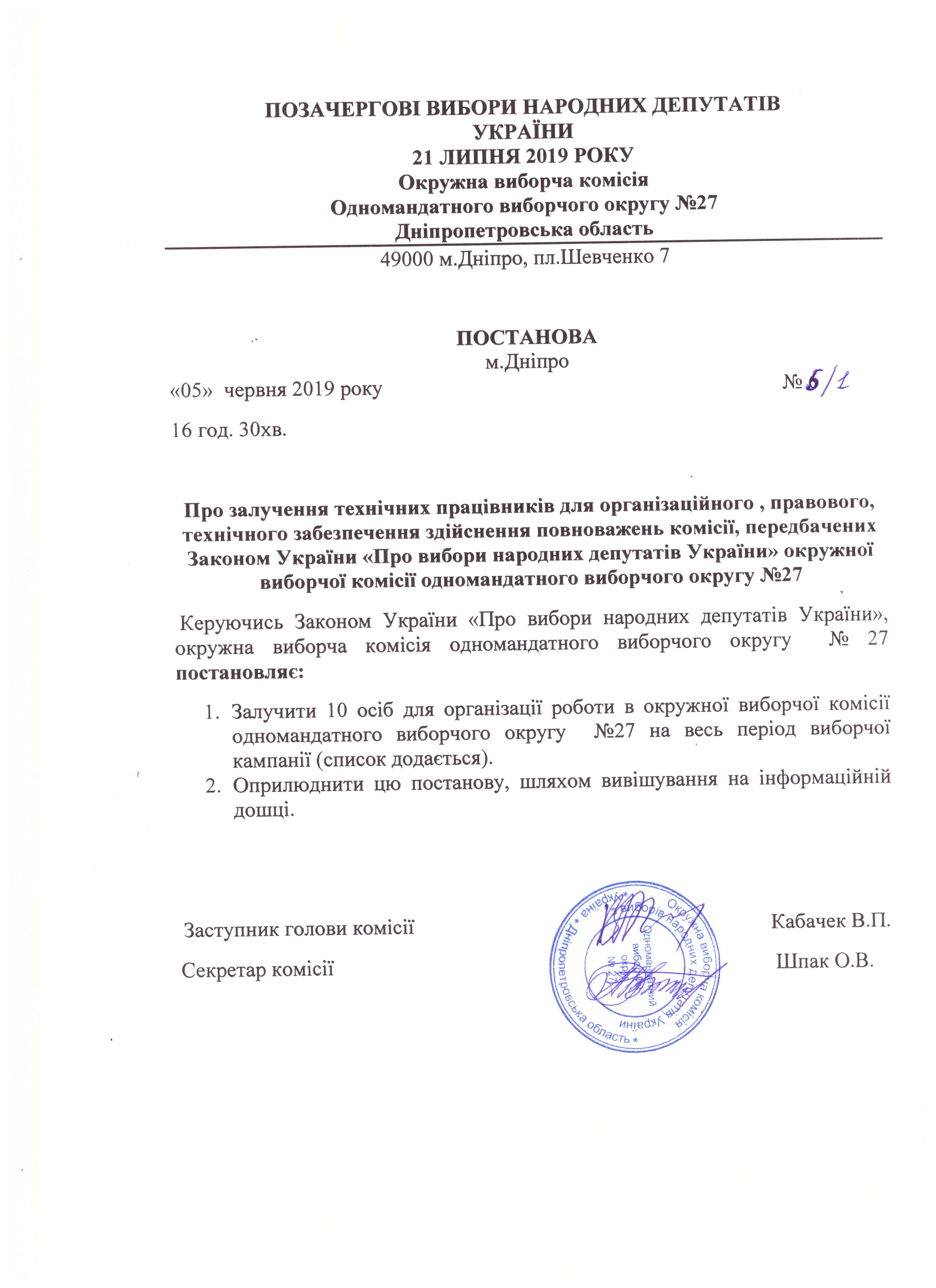 Про залучених технічних працівників для організаційного, правового, технічного забезпечення здійснення повноважень комісії, передбачених Законом України "Про вибори Народних депутатів України" окружної виборчої комісії одномандатного виборчого округу №27 |