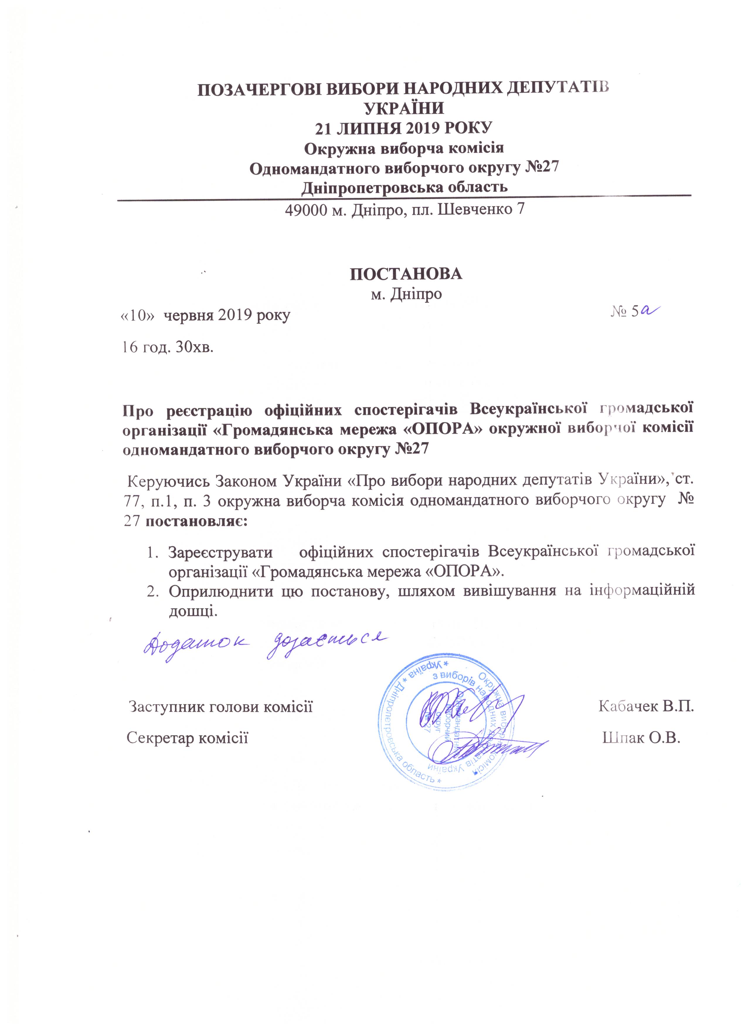Про реєстрацію офіційних спостерігачів Всеукраїнської громадської організації "Громадянська мережа "ОПОРА" окружної виборчої комісії одномандатного виборчого округу №27 |