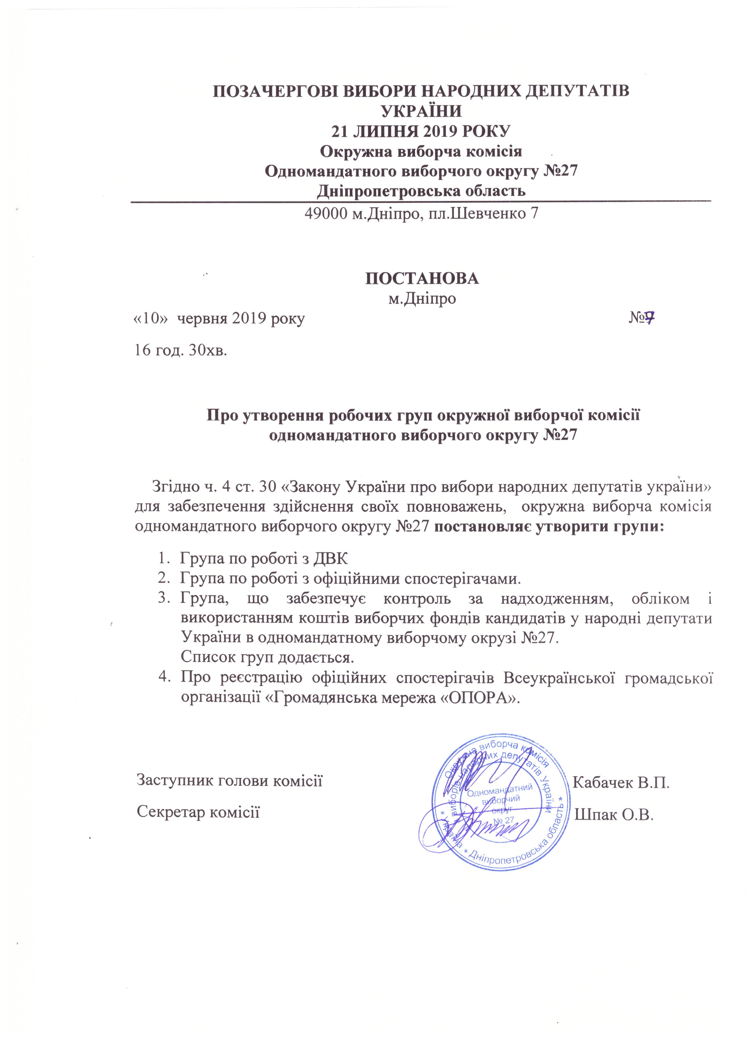 Про утворення дільничих виборчих комісій звичайних і спеціальних виборчих дільниць одномандатного виборчого округу №27 з позачергових виборів народних депутатів України 21 липня 2019 року |