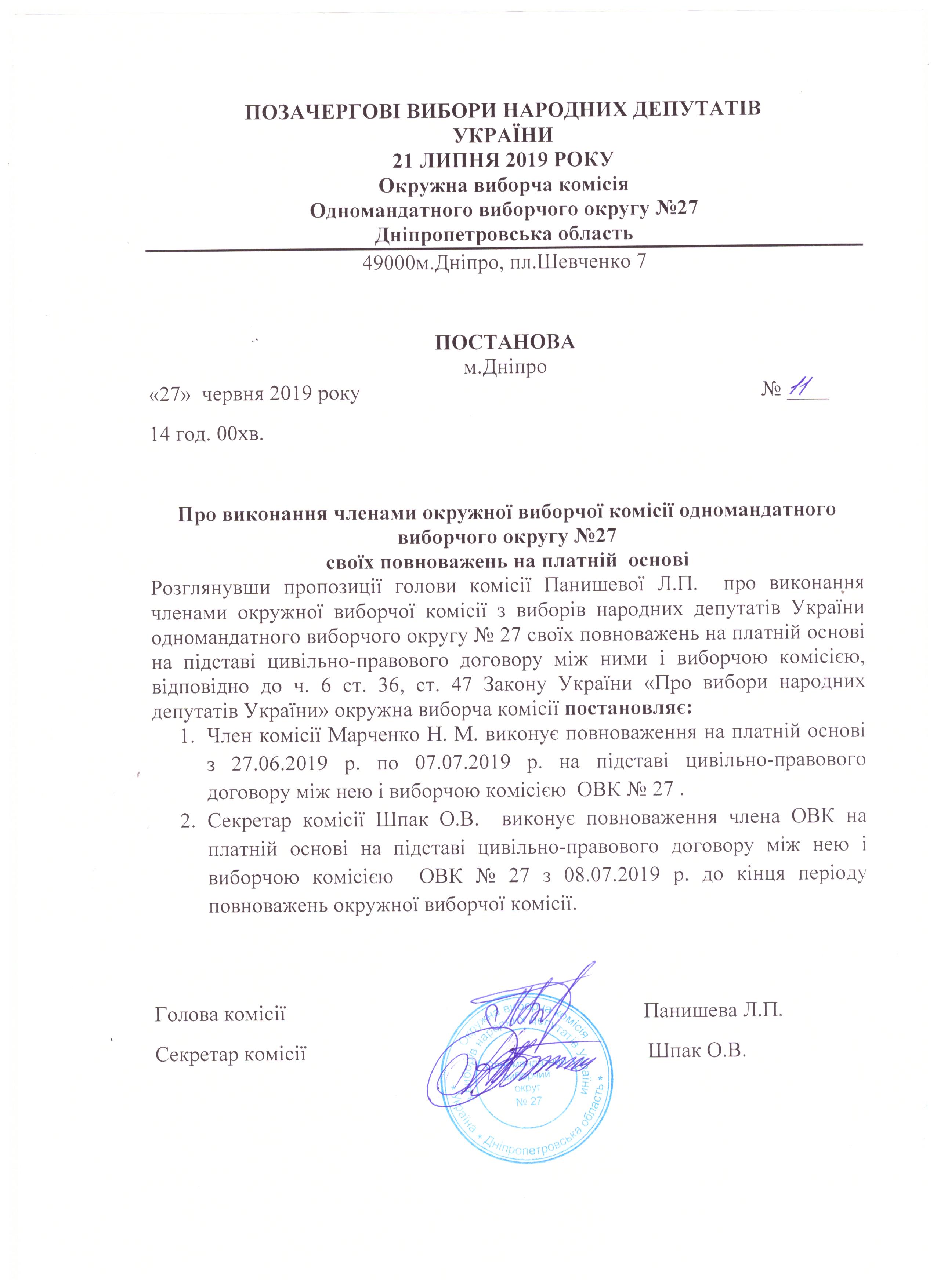 Про виконання членами ОВК з виборів народних депутатів України ОВО № 27 своїх повноважень на платній основі |