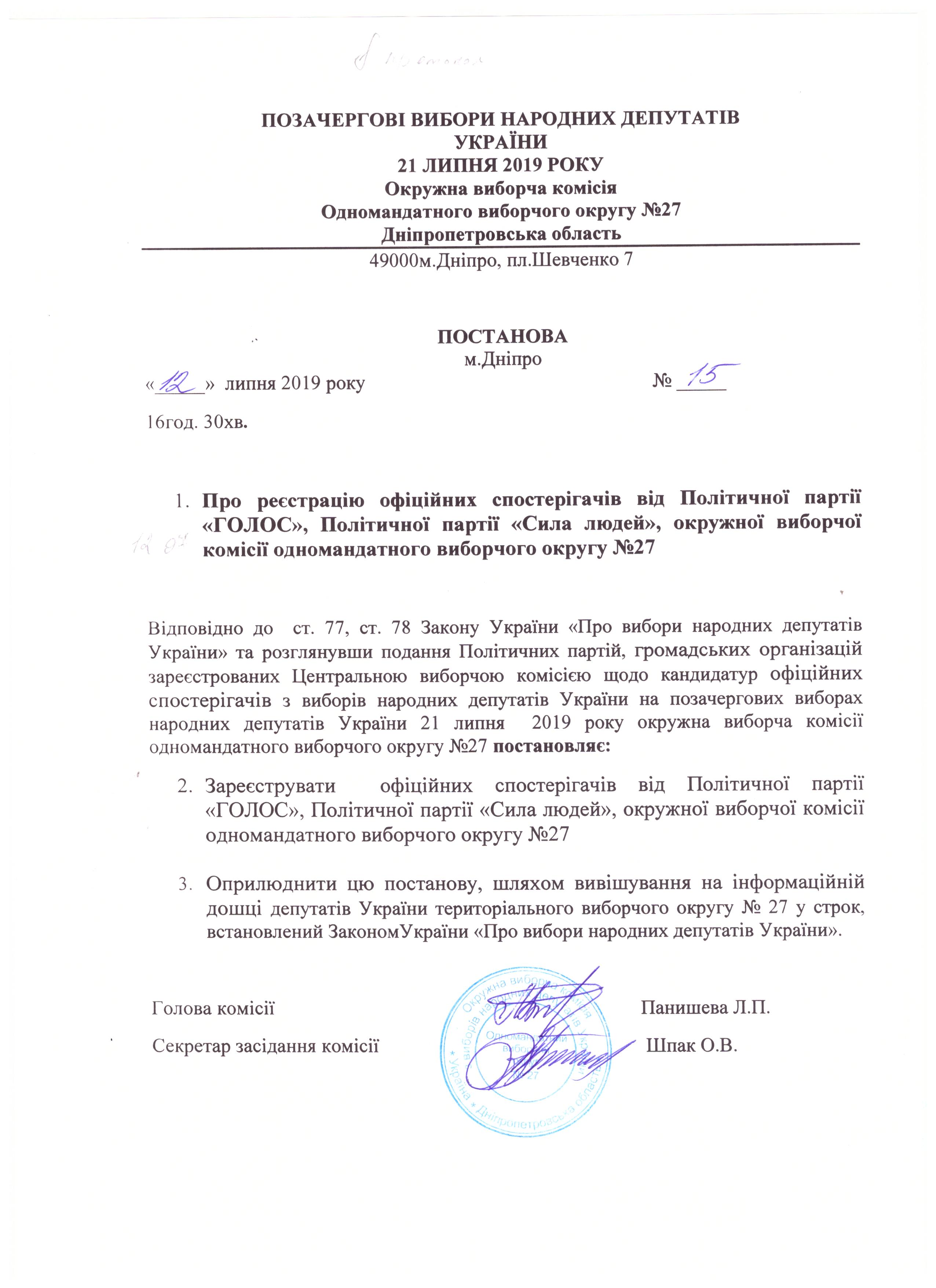 Про реєстрацію офіційних спостерігачів від Політичної партії "ГОЛОС", Політичної партії "Сила людей", окружної виборчої комісії одномандатного виборчого округу №27 |