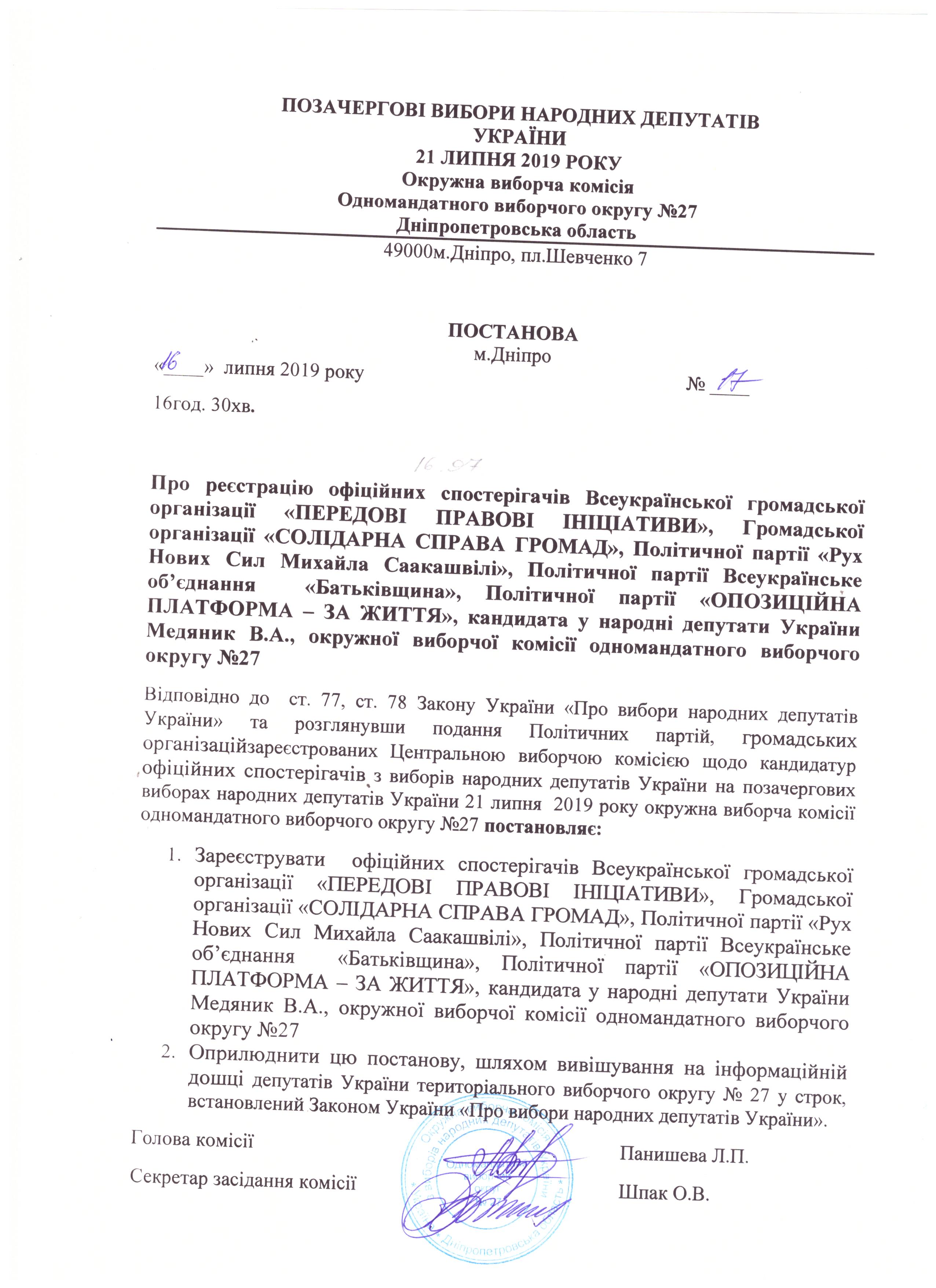 Про реєстрацію офіційних спостерігачів Всеукраїнської організації "ПЕРЕДОВІ ПРАВОВІ ІНІЦІАТИВИ", Громадської організації "СОЛІДАРНА СПРАВА ГРОМАД", Політичної партії "Рух Нових Сил Михайла Саакашвілі", Політичної партії Всеукраїнське об'єеднання "Батьківщина", Політичної партії "ОПОЗИЦІЙНА ПЛАТФОРМА-ЗА ЖИТТЯ", кандидата в народні депутати України Медяника В.А., окружної виборчої комісії одномандатного виборчого округу №27 |