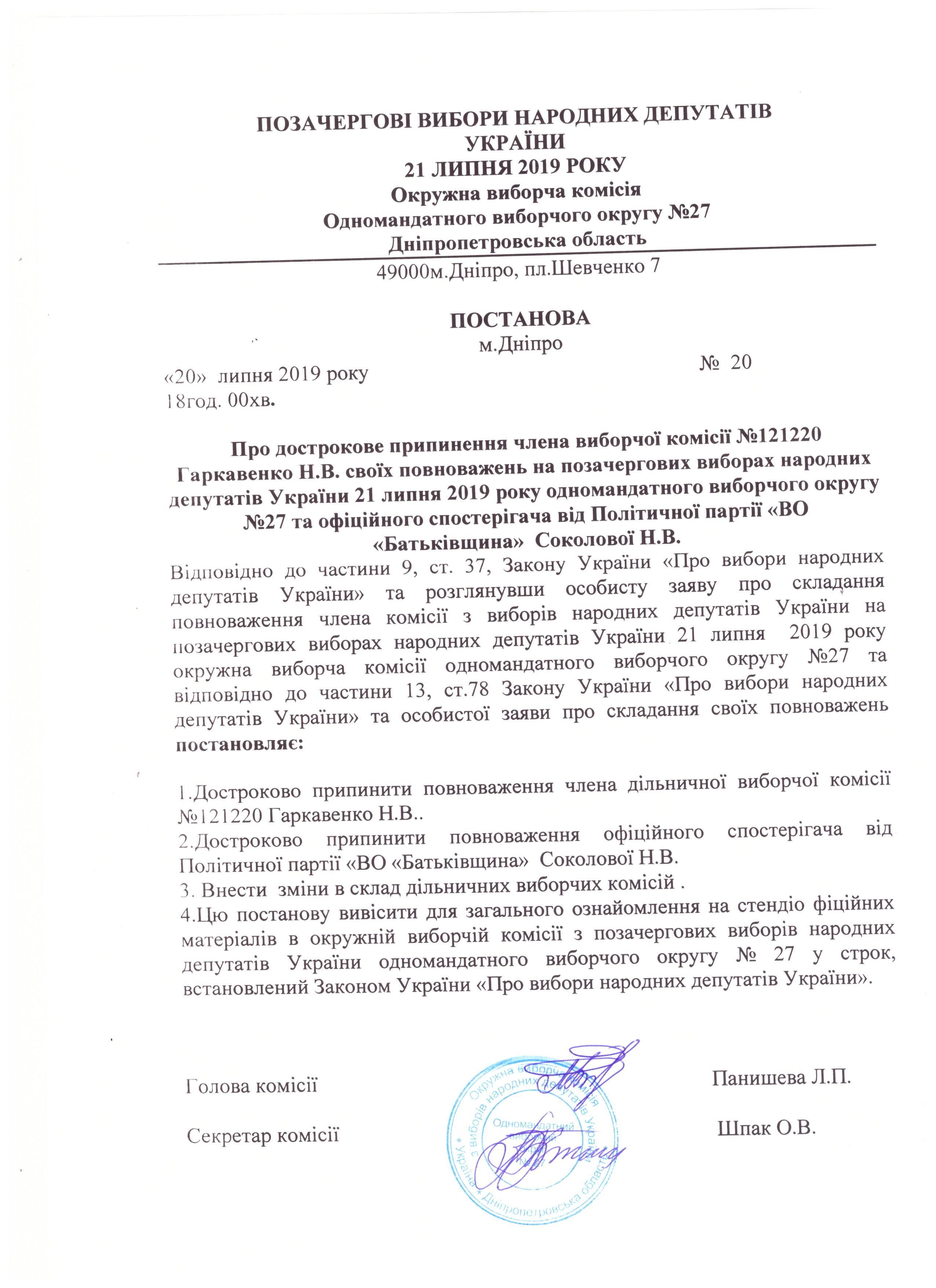 Про дострокове припинення члена виборчої комісії №121220 Гаркавенко Н.В. своїх повноважень на позачергових виборах народних депутатів України 21 липня 2019 року одномандатного виборчого кругу №27 та офіційних спостерігачів від Політичної партії "ВО "Батьківщина" Соколової Н.В. |