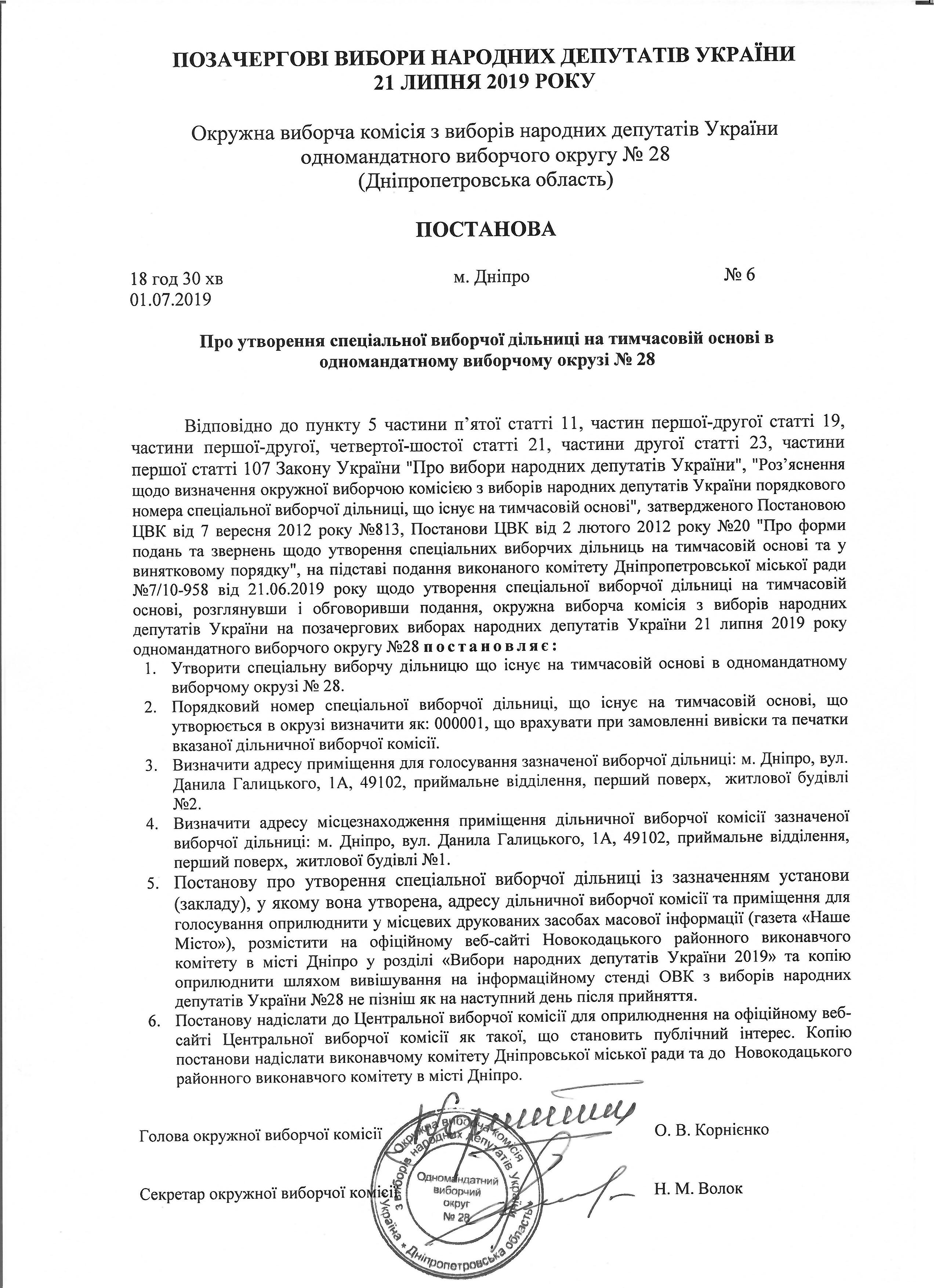 Про утворення спеціальної виборчої дільниці на тимчасовій основі в одномандатному виборчому окрузі № 28 |