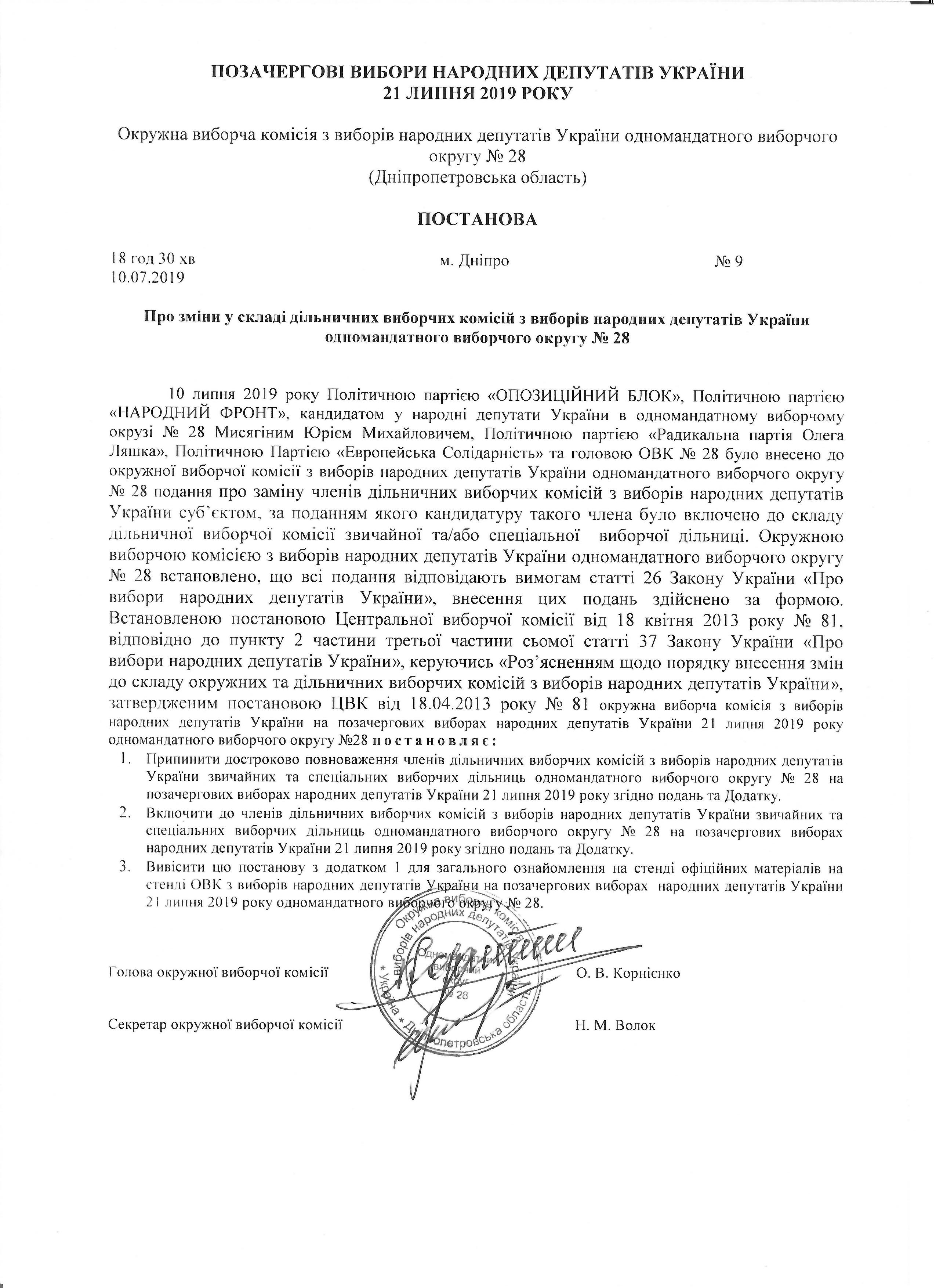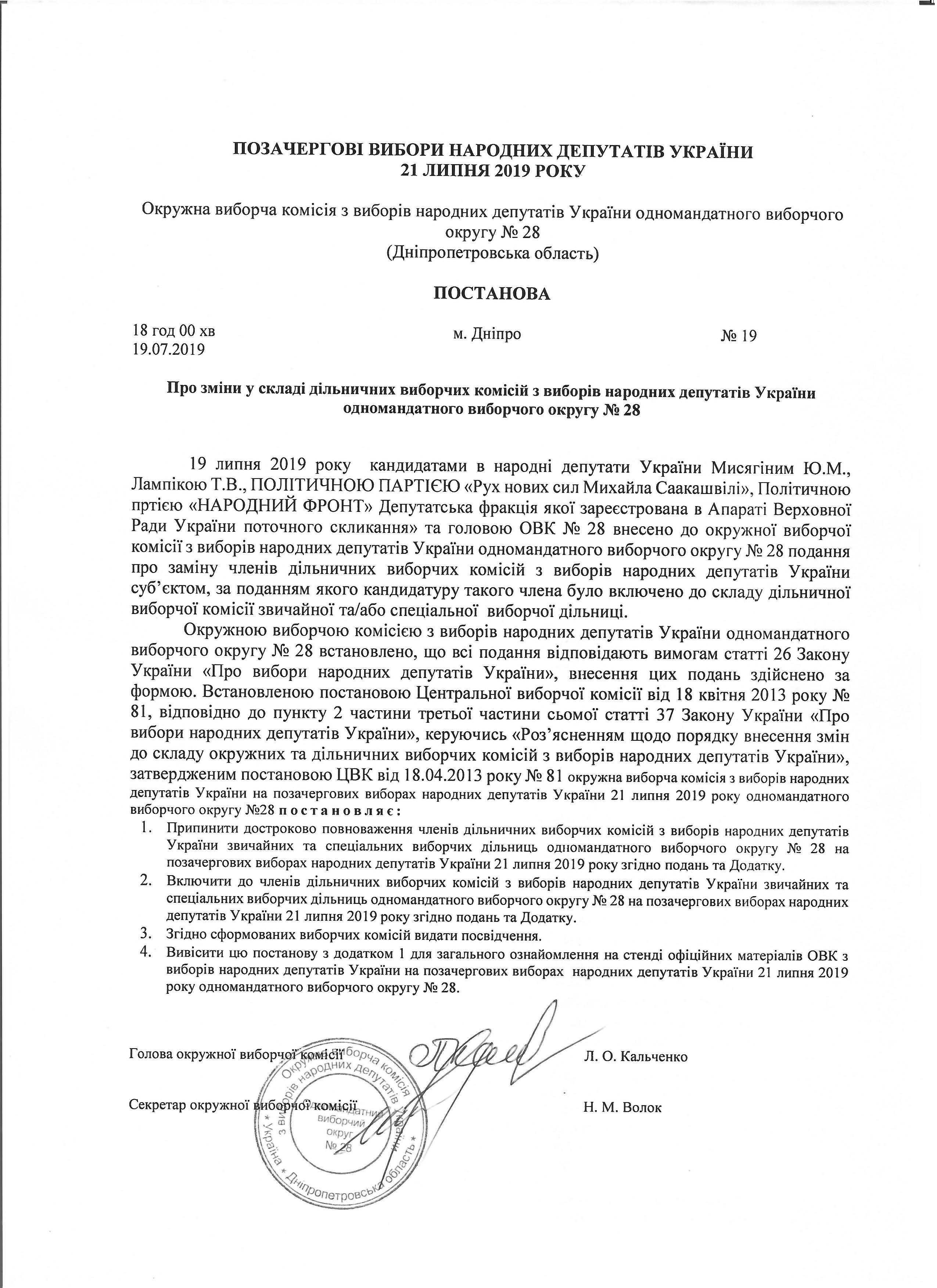 Про утворення дільничних виборчих комісій з виборів народних депутатів України звичайних та спеціальних виборчих дільниць одномандатного виборчого округу № 28 на позачергових виборах народних депутатів України 21 липня 2019 року |