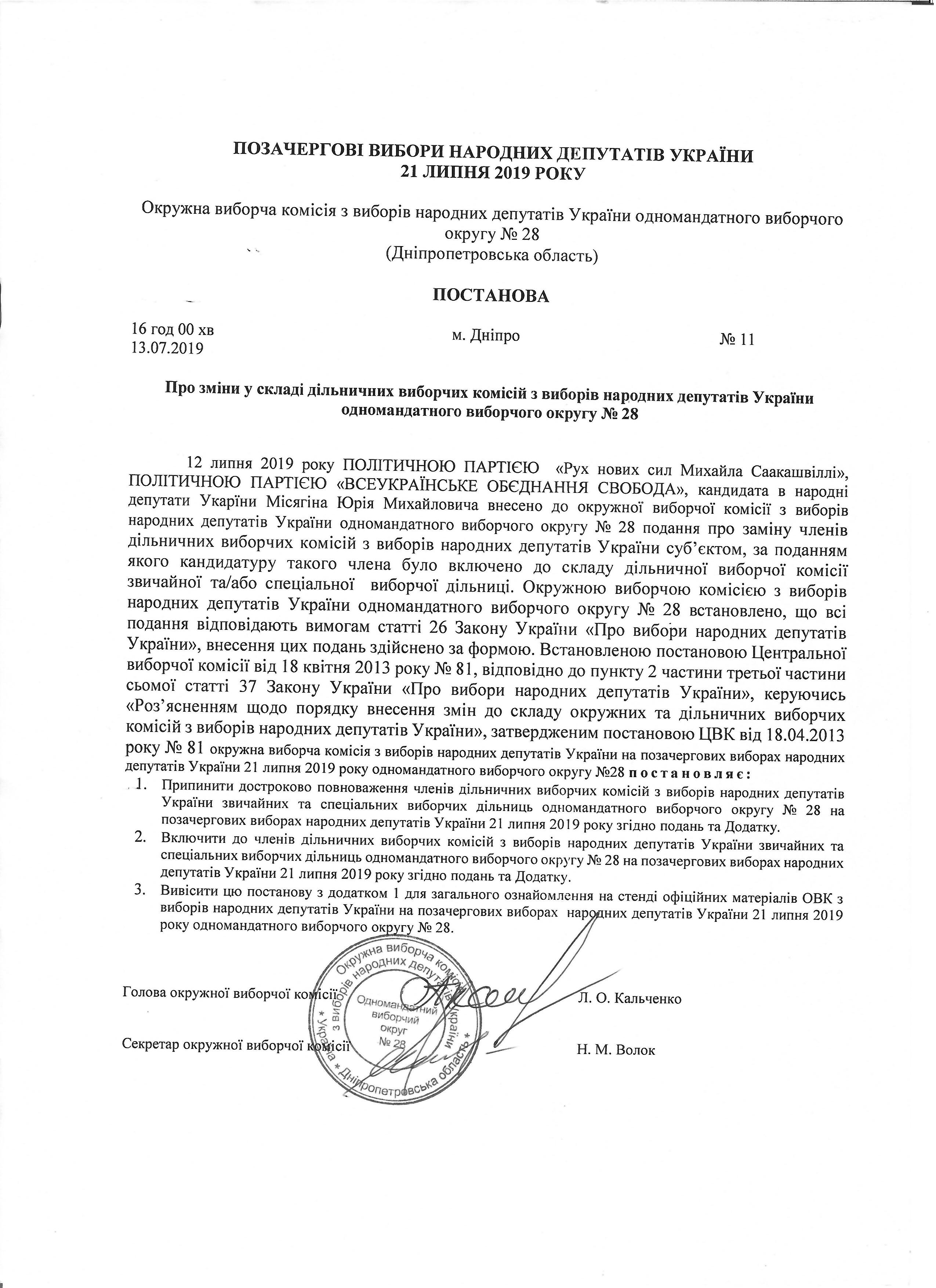 Про реєстрацію офіційних спостерігачів від Всеукраїнської громадської організації "Громадянська мережа "ОПОРА" на позачергових виборах народних депутатів України 21 липня 2019 року В ОВО № 28 |