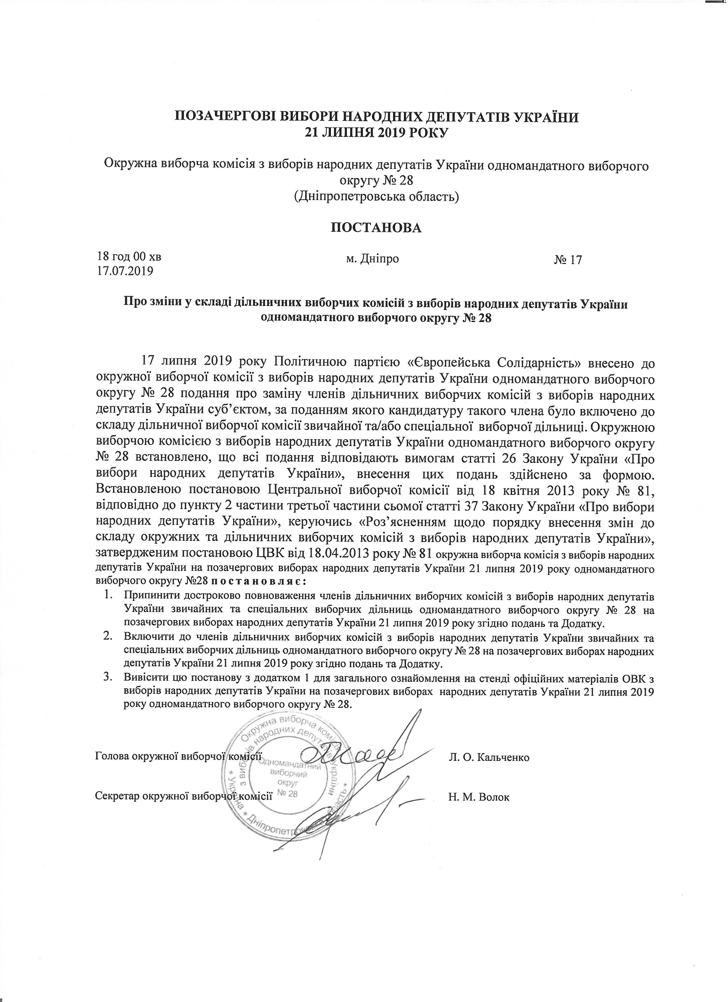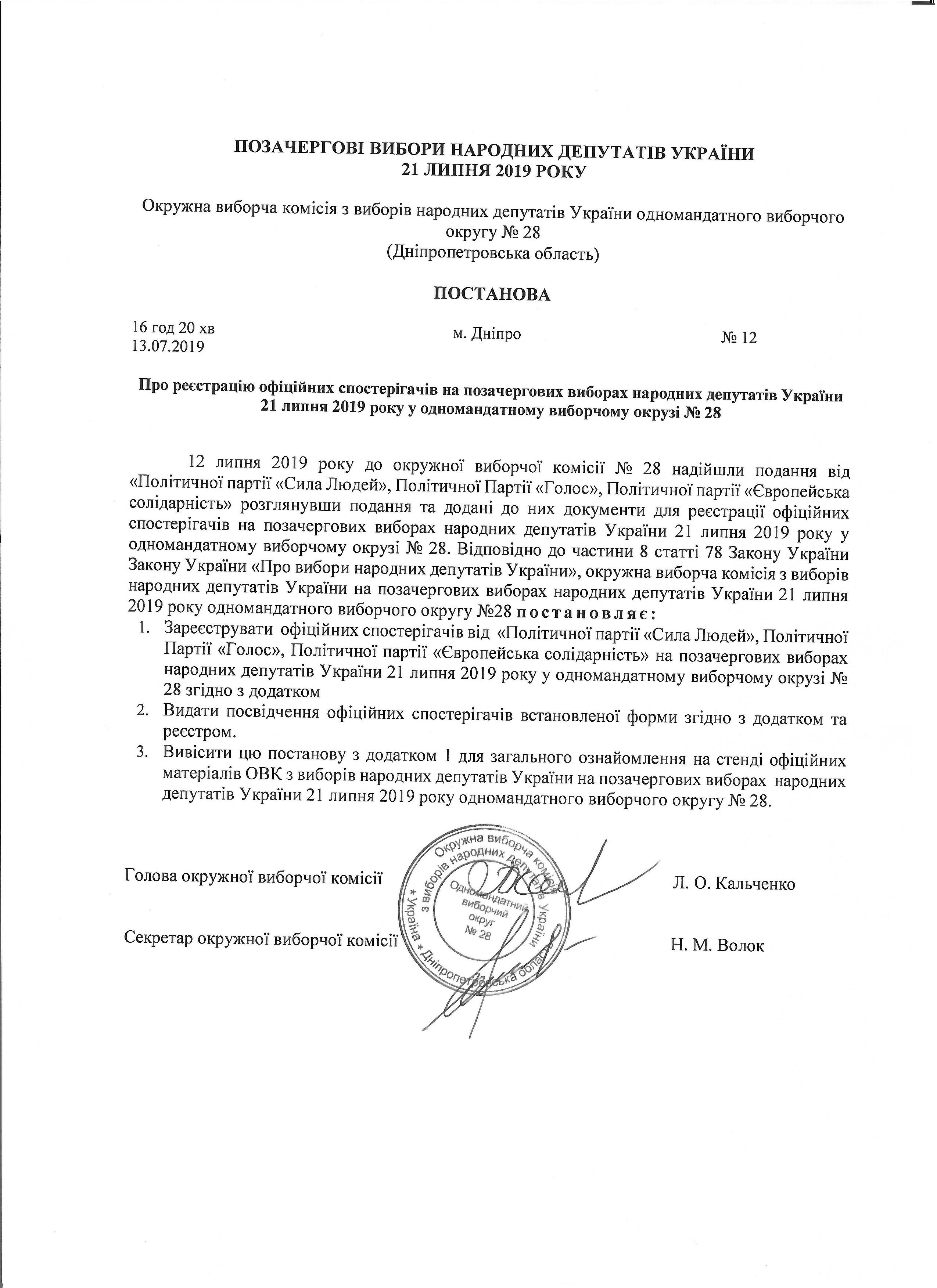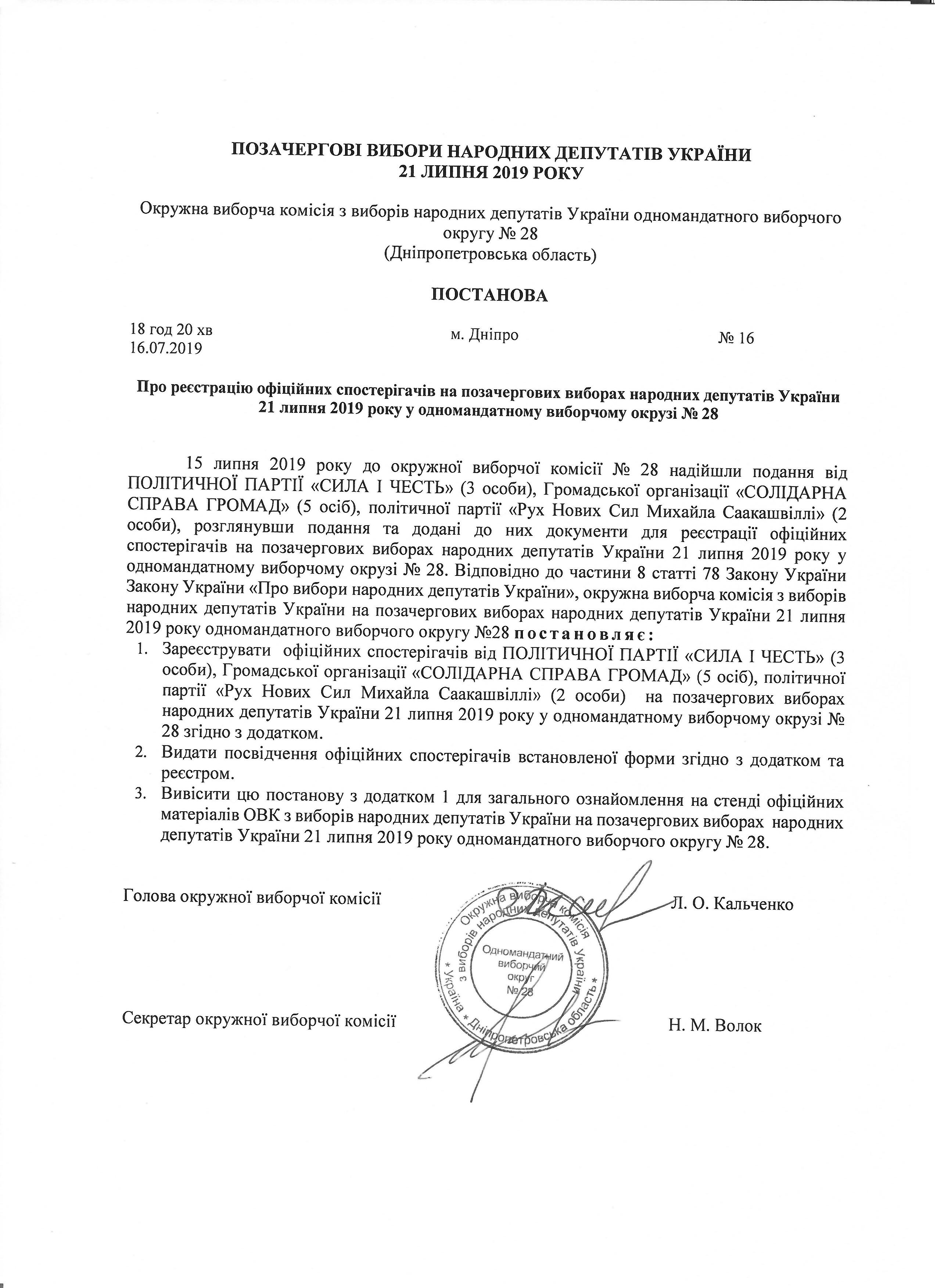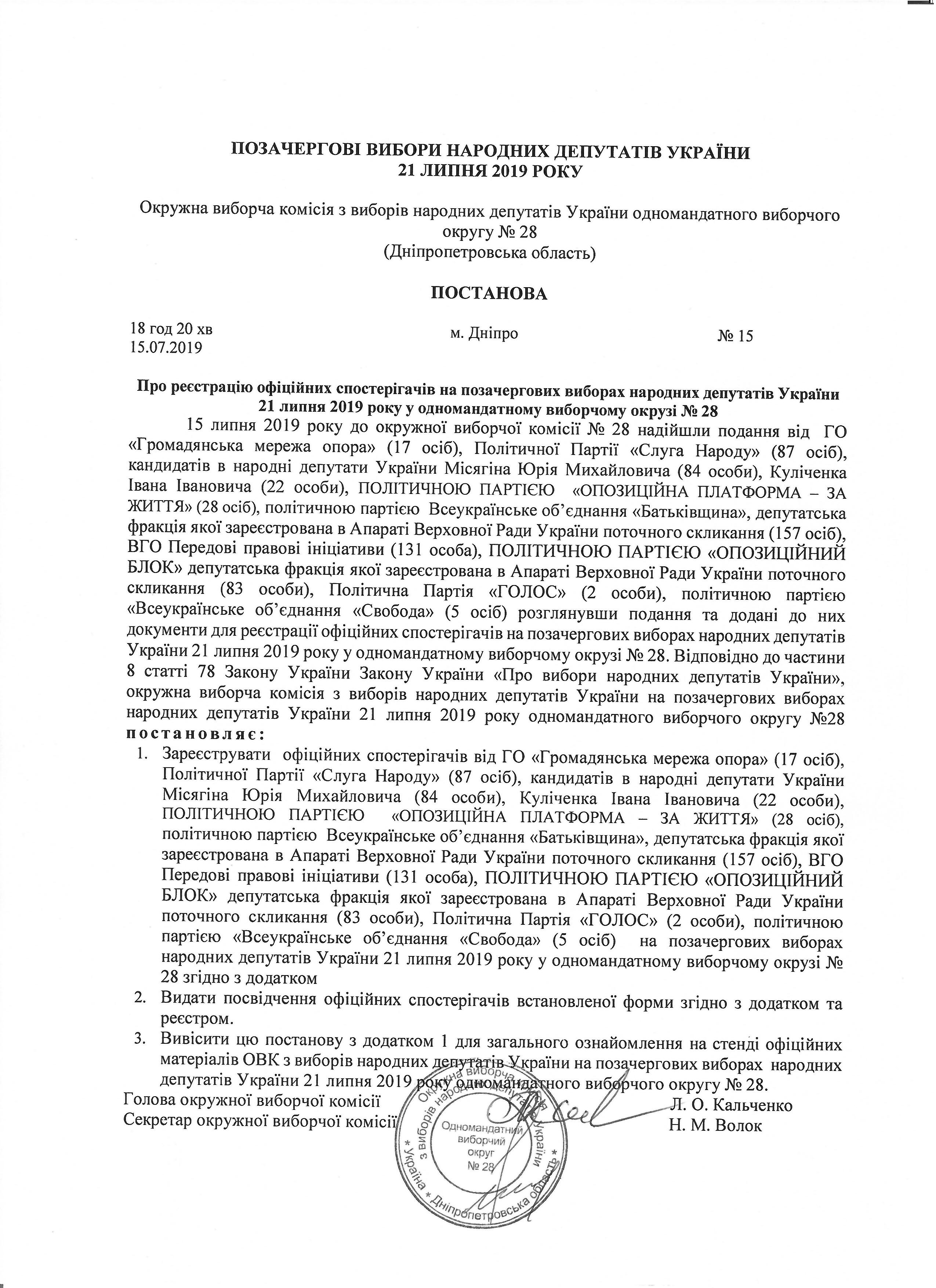 Про реєстрацію офіційних спостерігачів на позачергових виборах народних депутатів України 21 липня 2019 року у одномандатному виборчому окрузі № 28 |