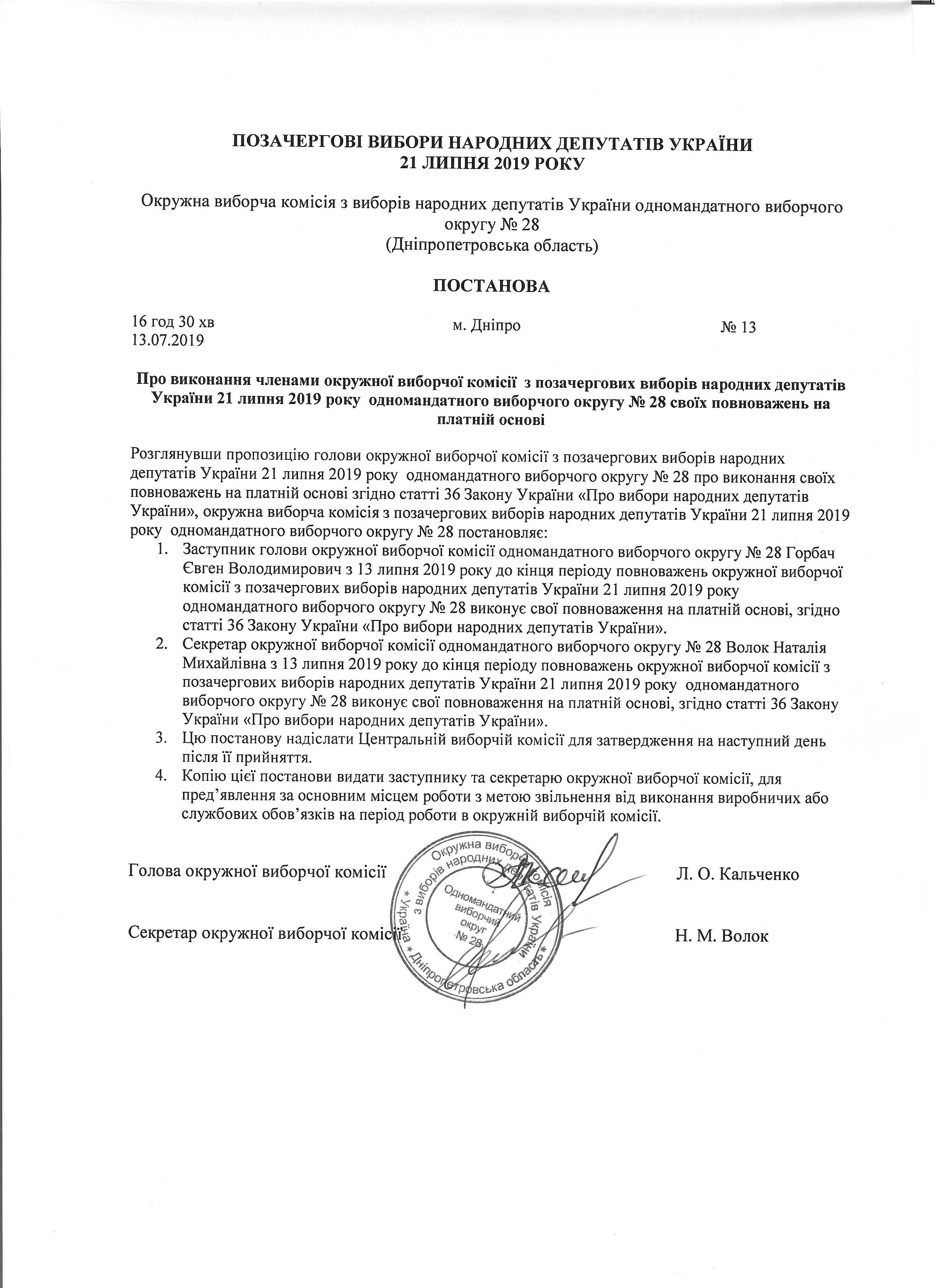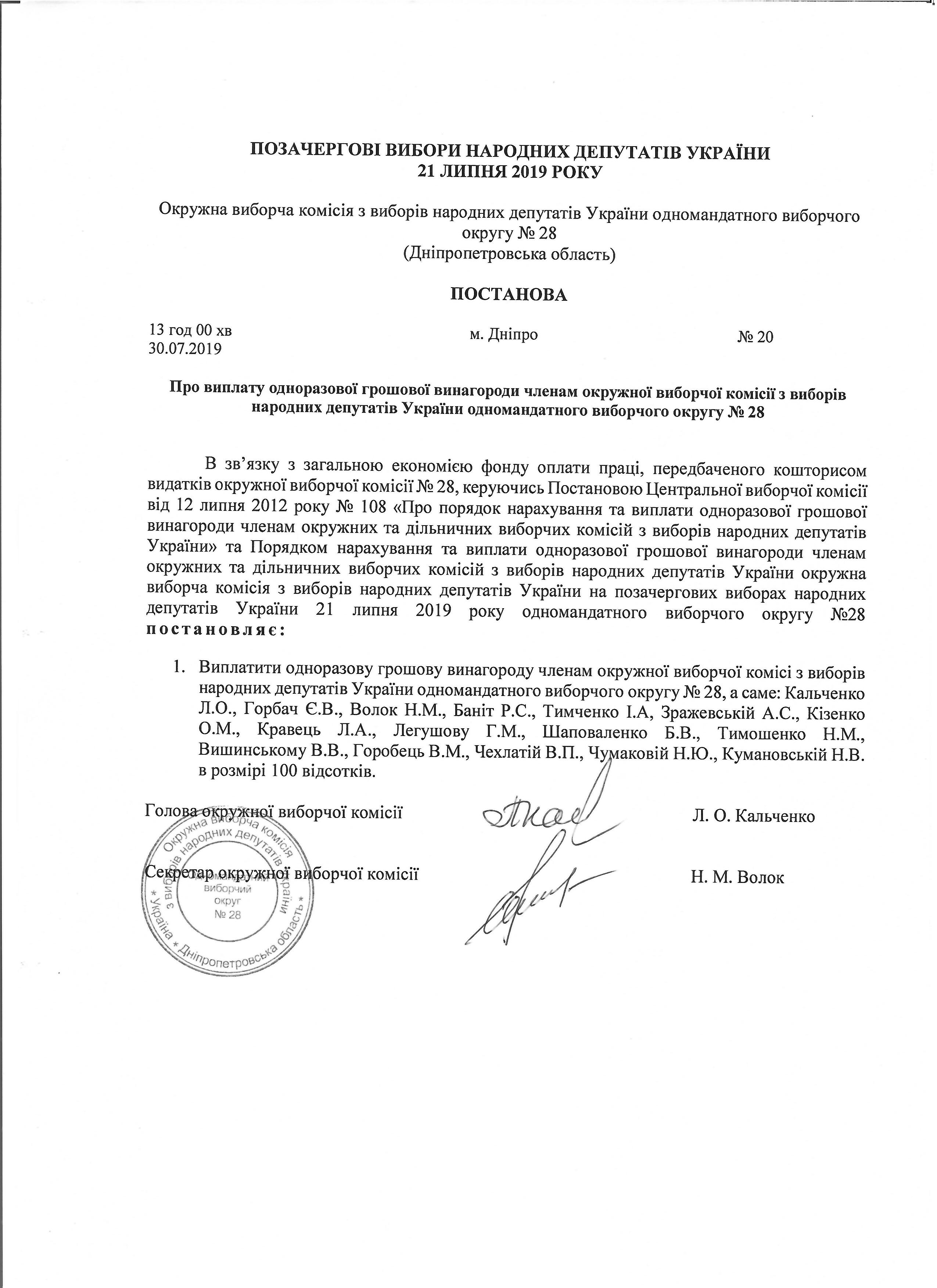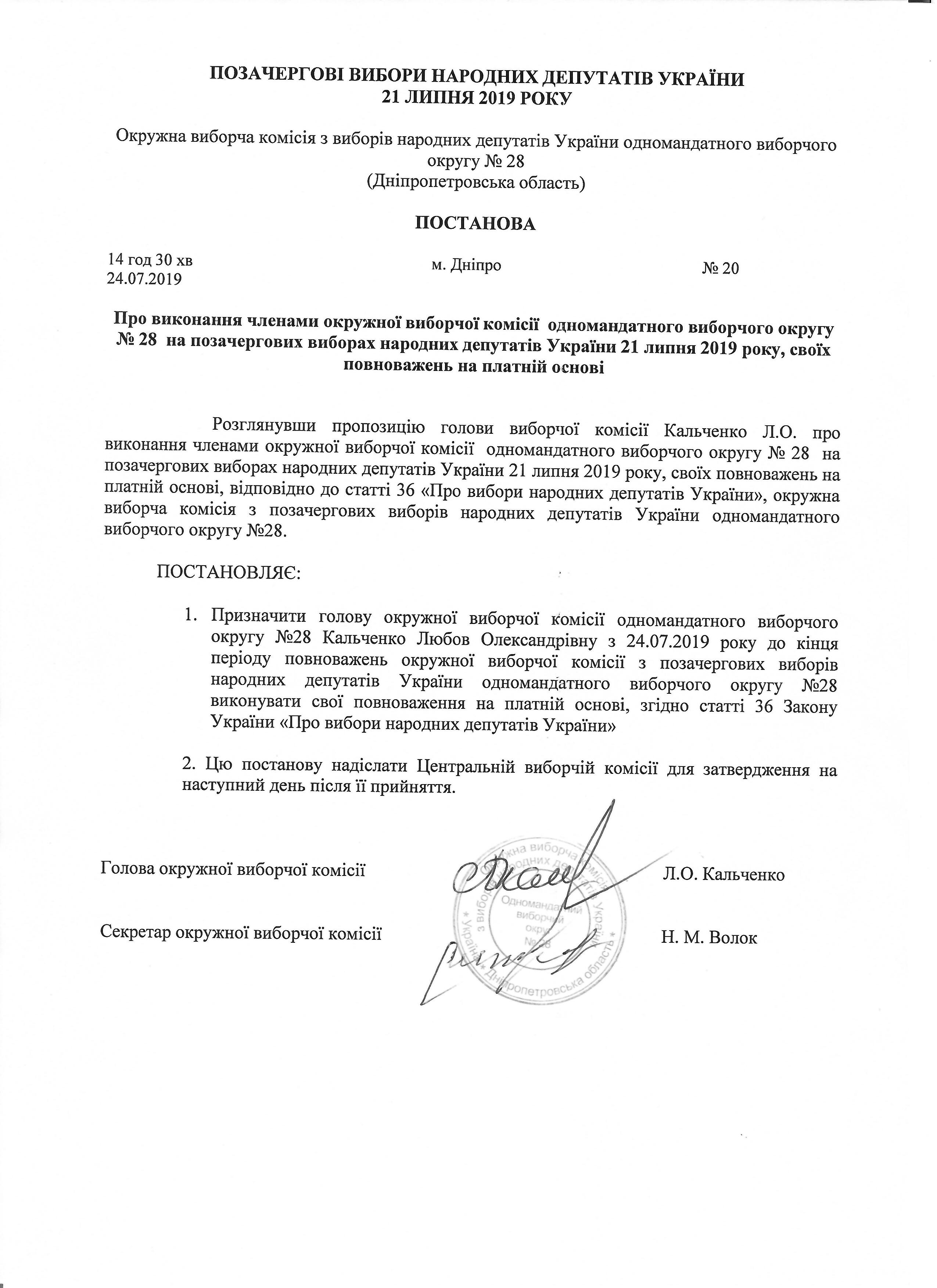 Про виконання членами окружної виборчої комісії з позачергових виборів народних депутатів України 21 липня 2019 року одномандатного виборчого округу № 28 своїх повноважень на платній основі |