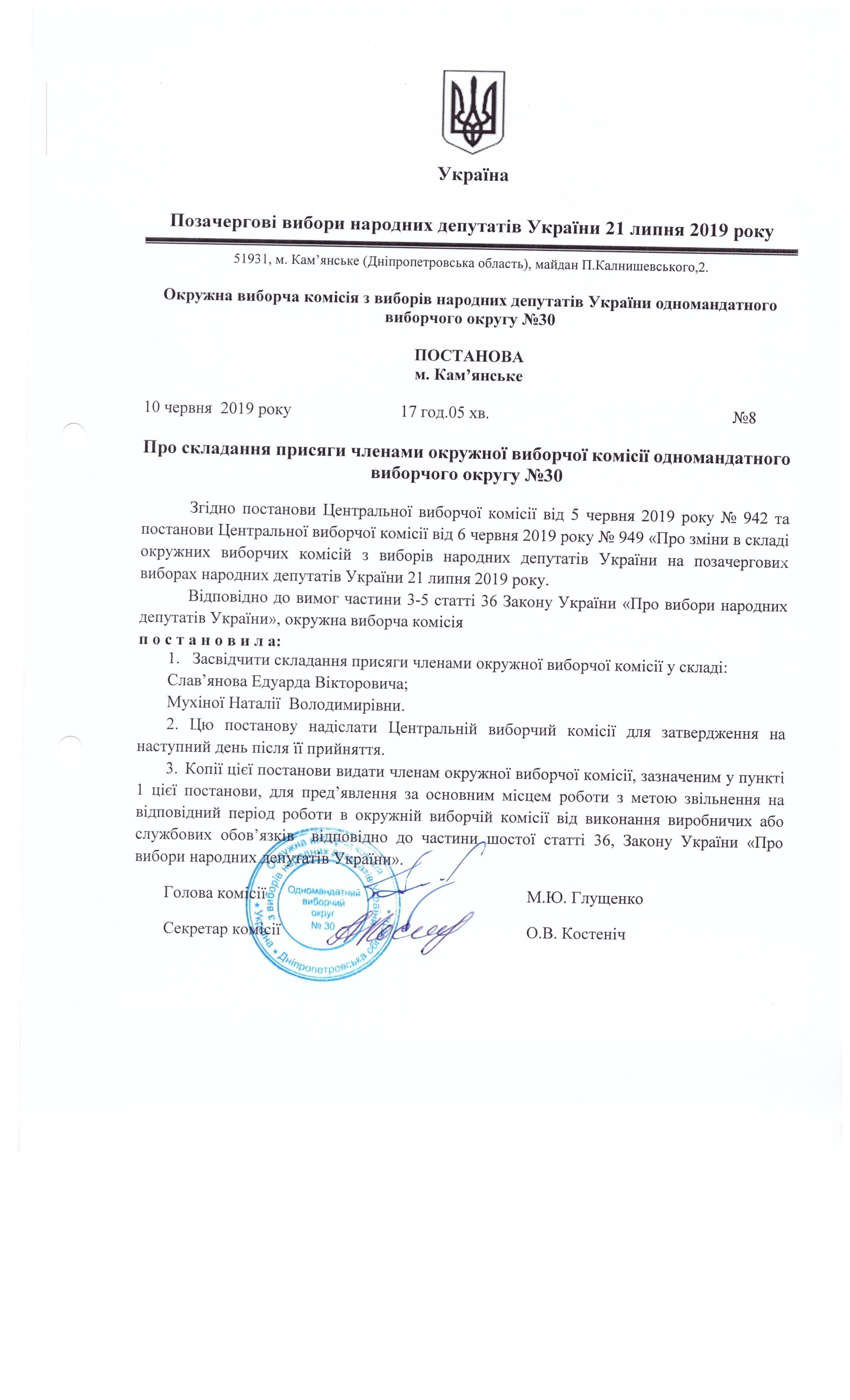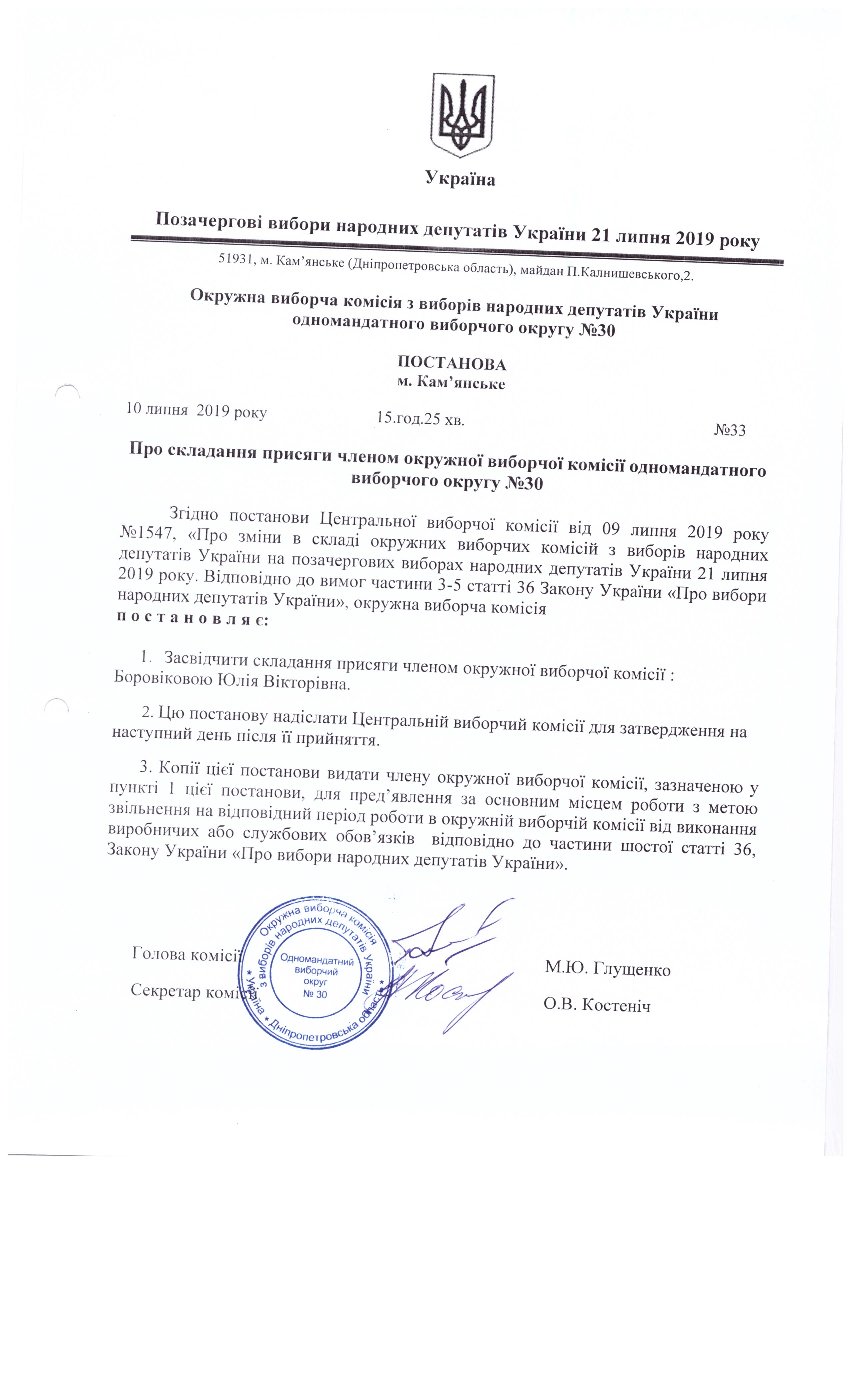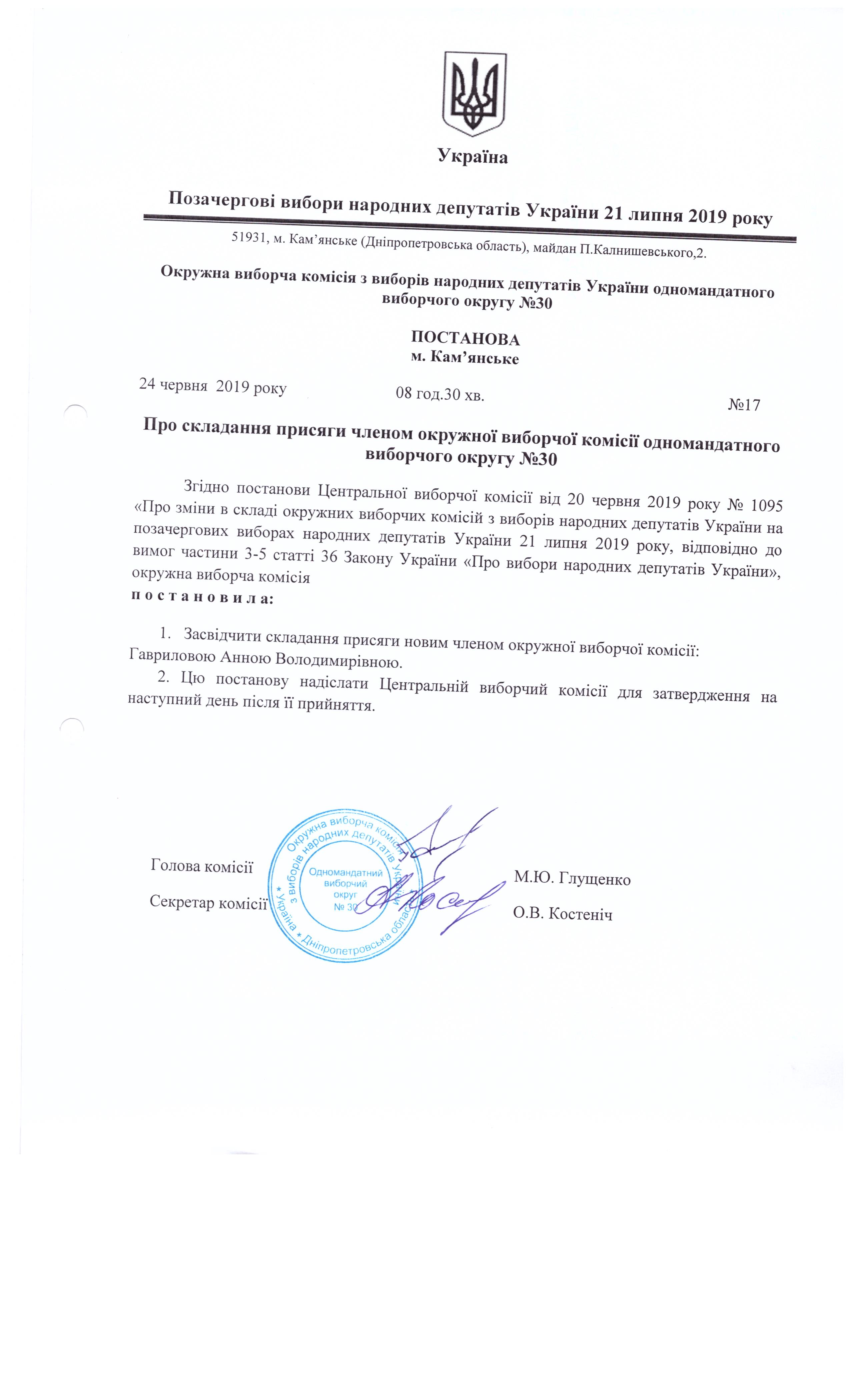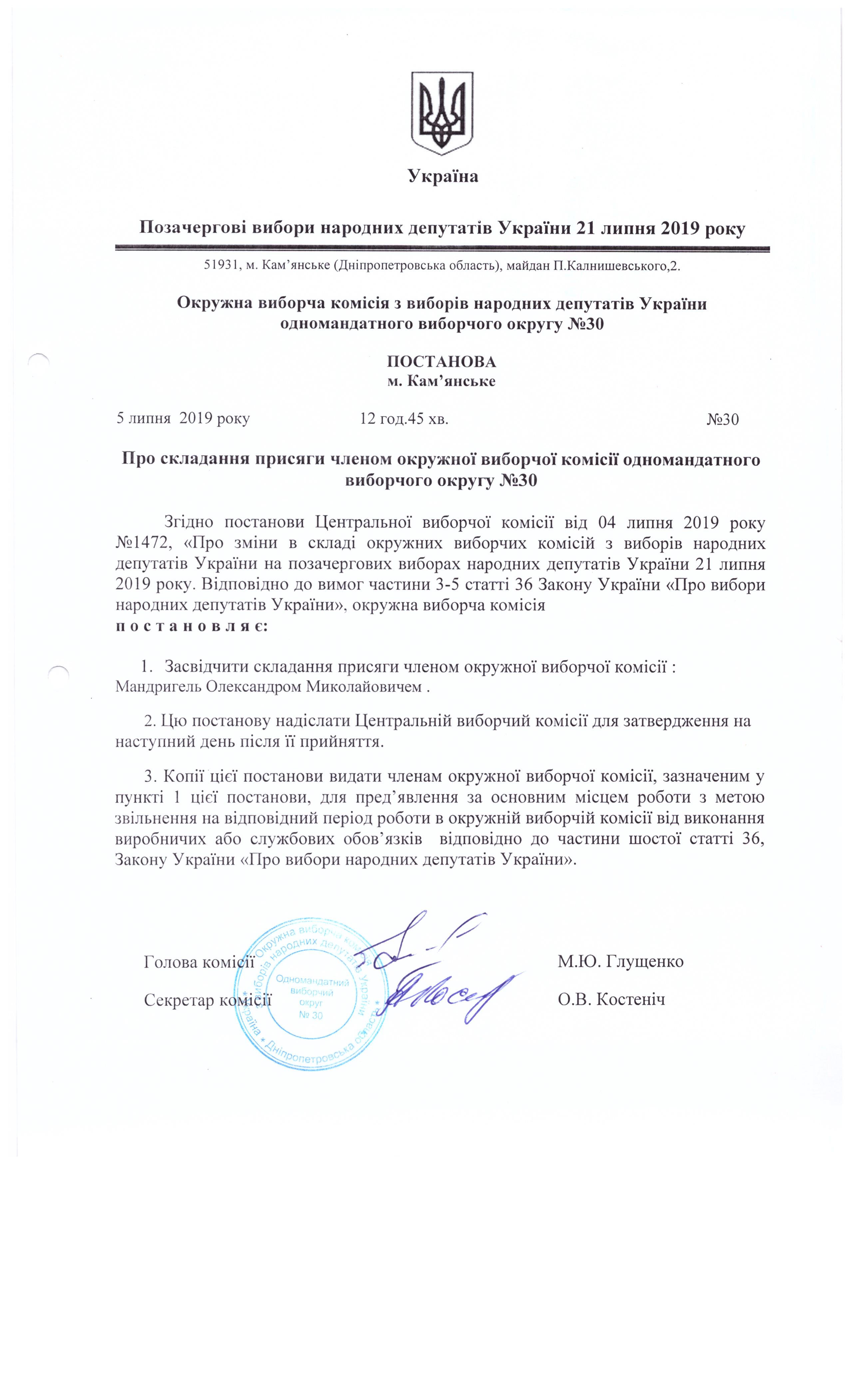 Про складання присяги членом окружної виборчої комісії одномандатного виборчого округу № 30 |