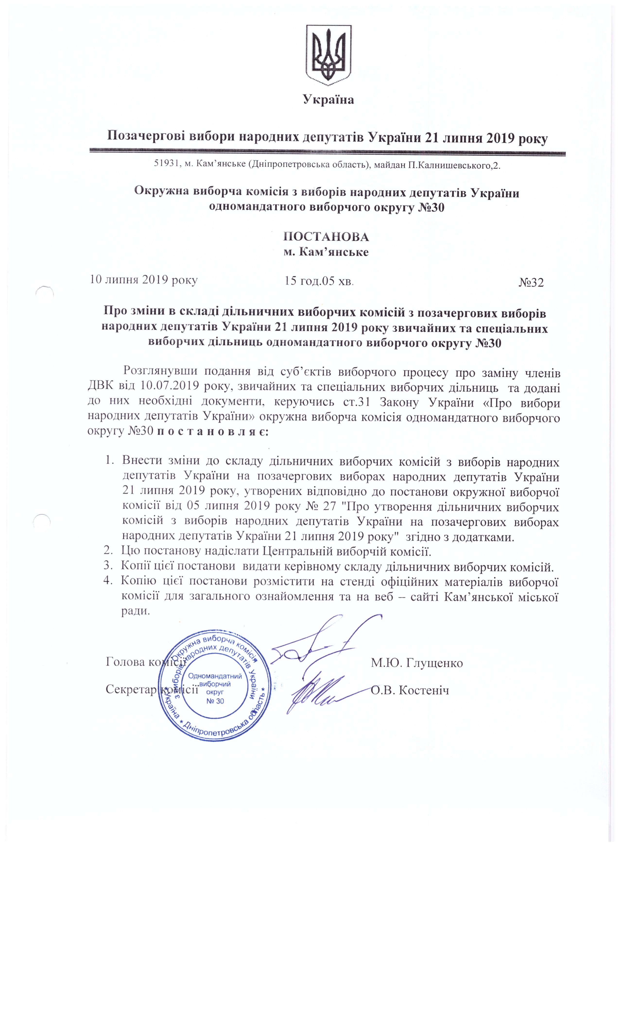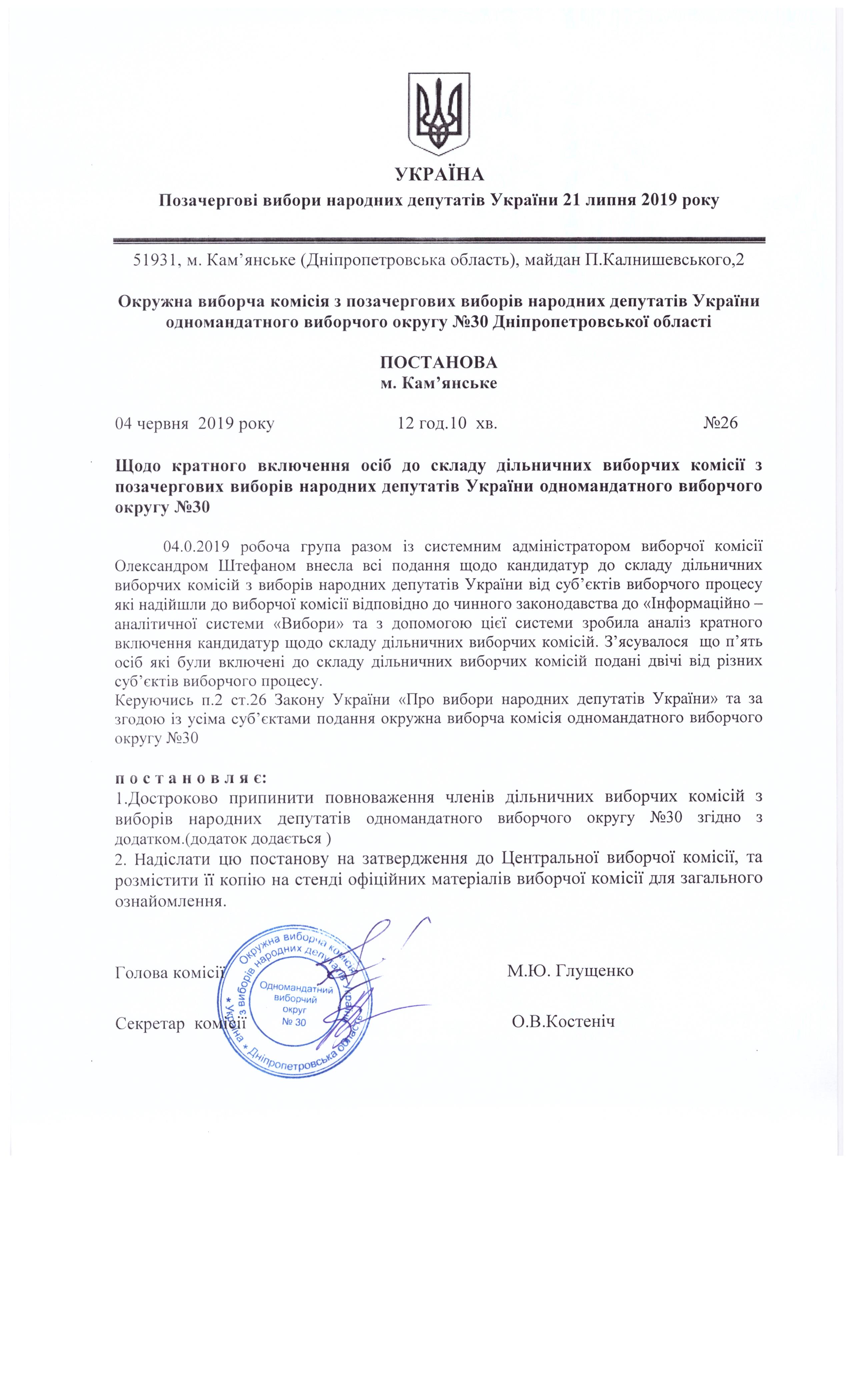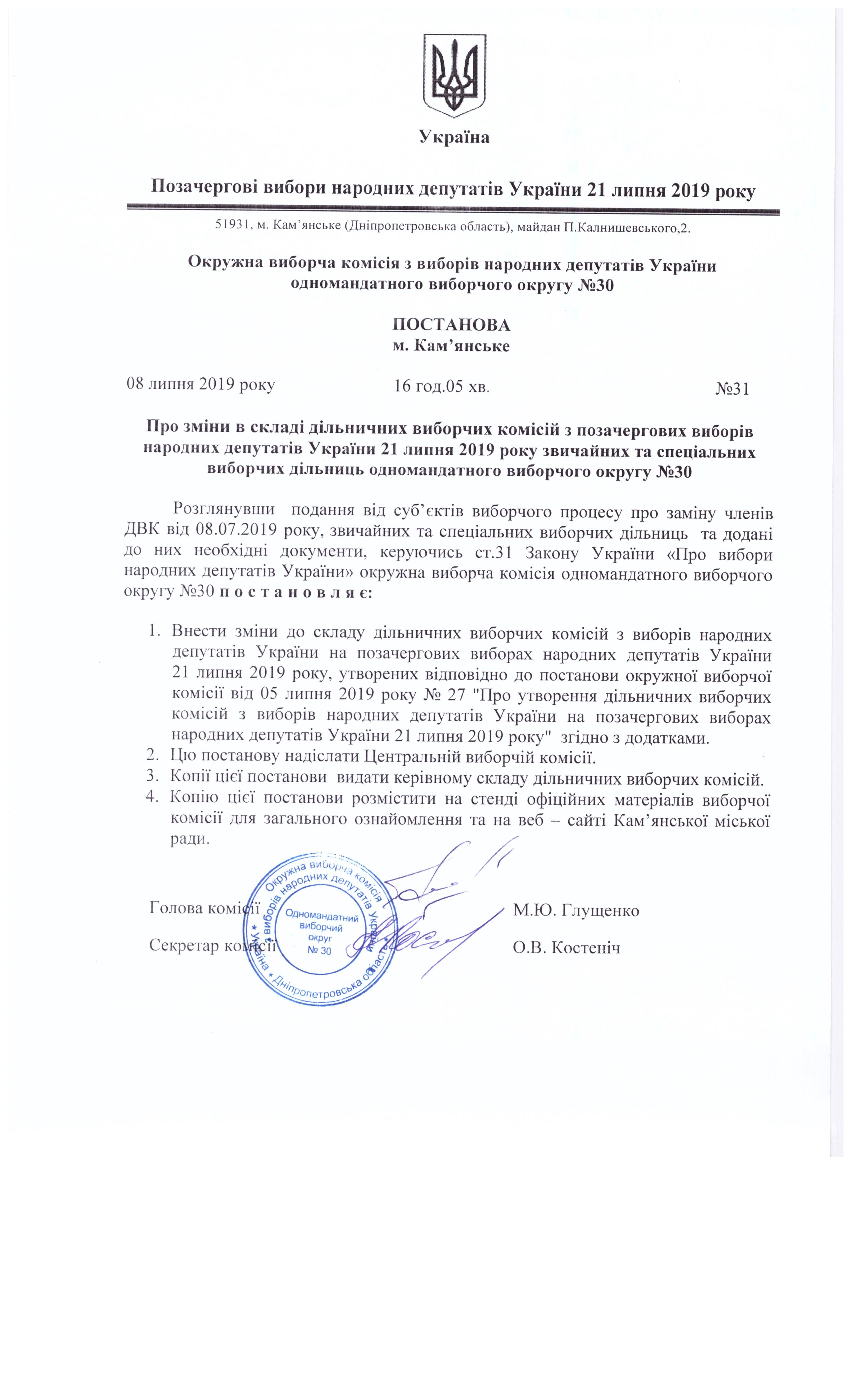 Про зміни в складі дільничних виборчих комісій з позачергових виборів депутатів України 21 липня 2019 року звичайних та спеціальних виборчих дільниць одномандатного виборчого округу № 30 |