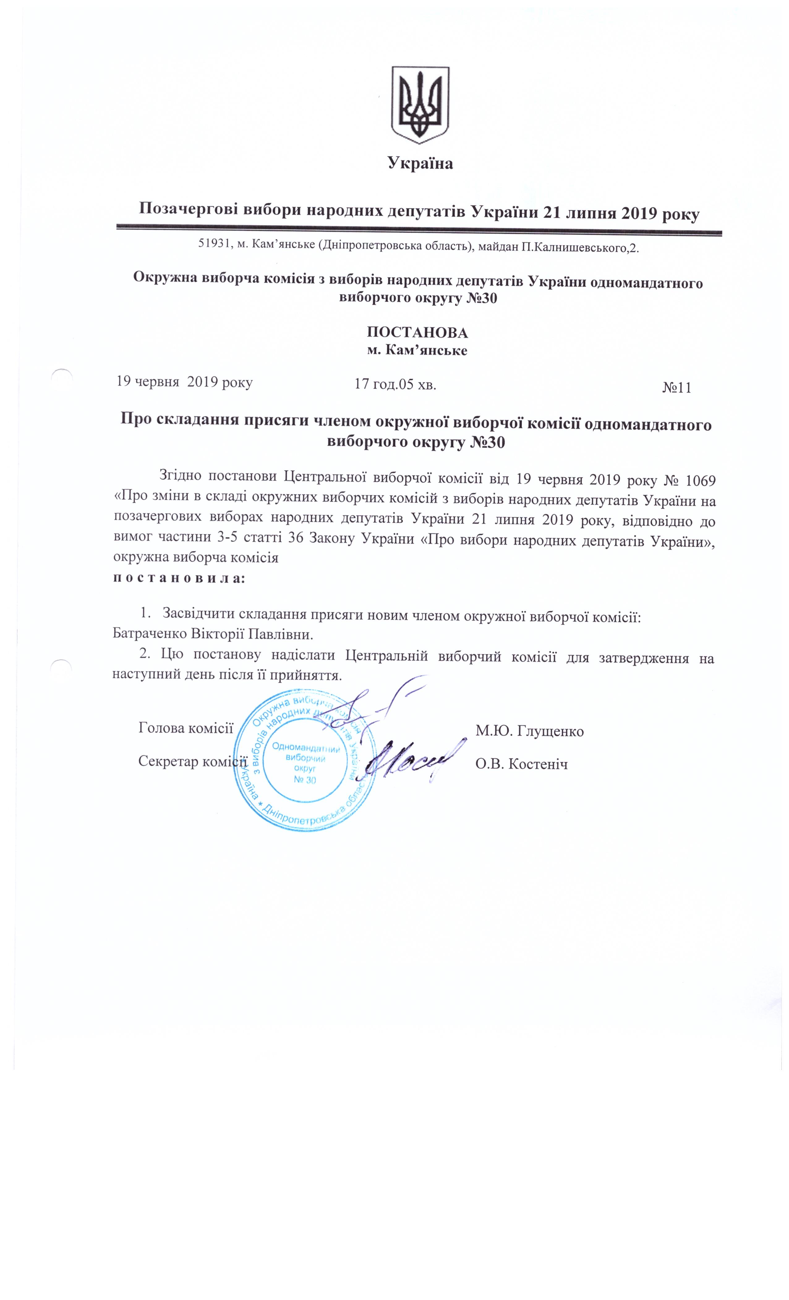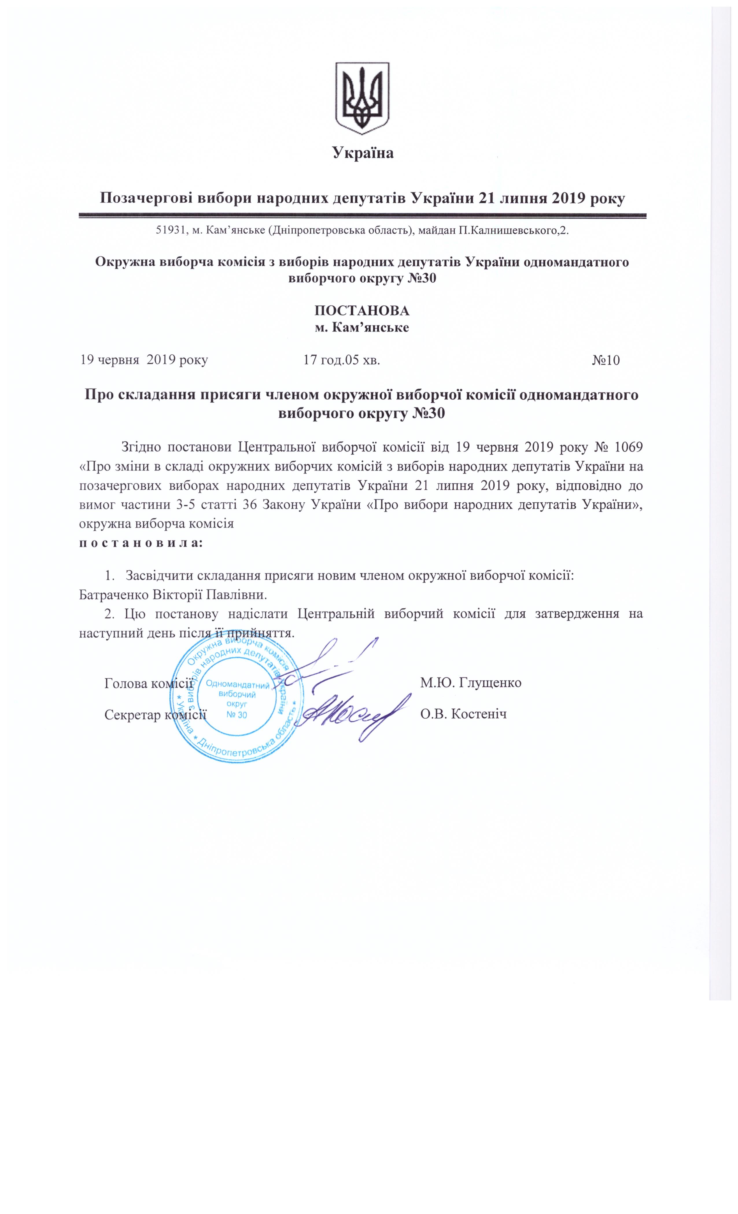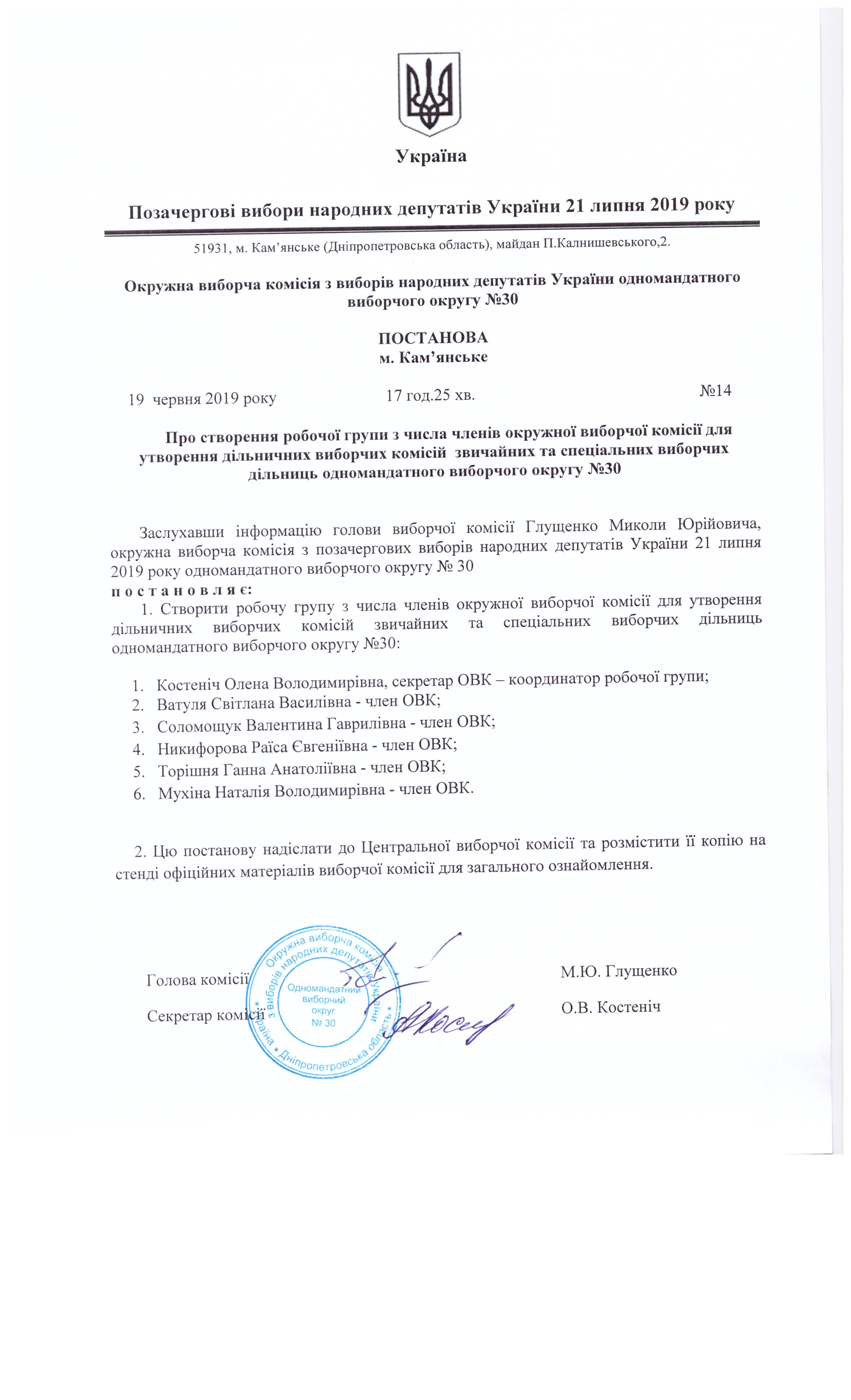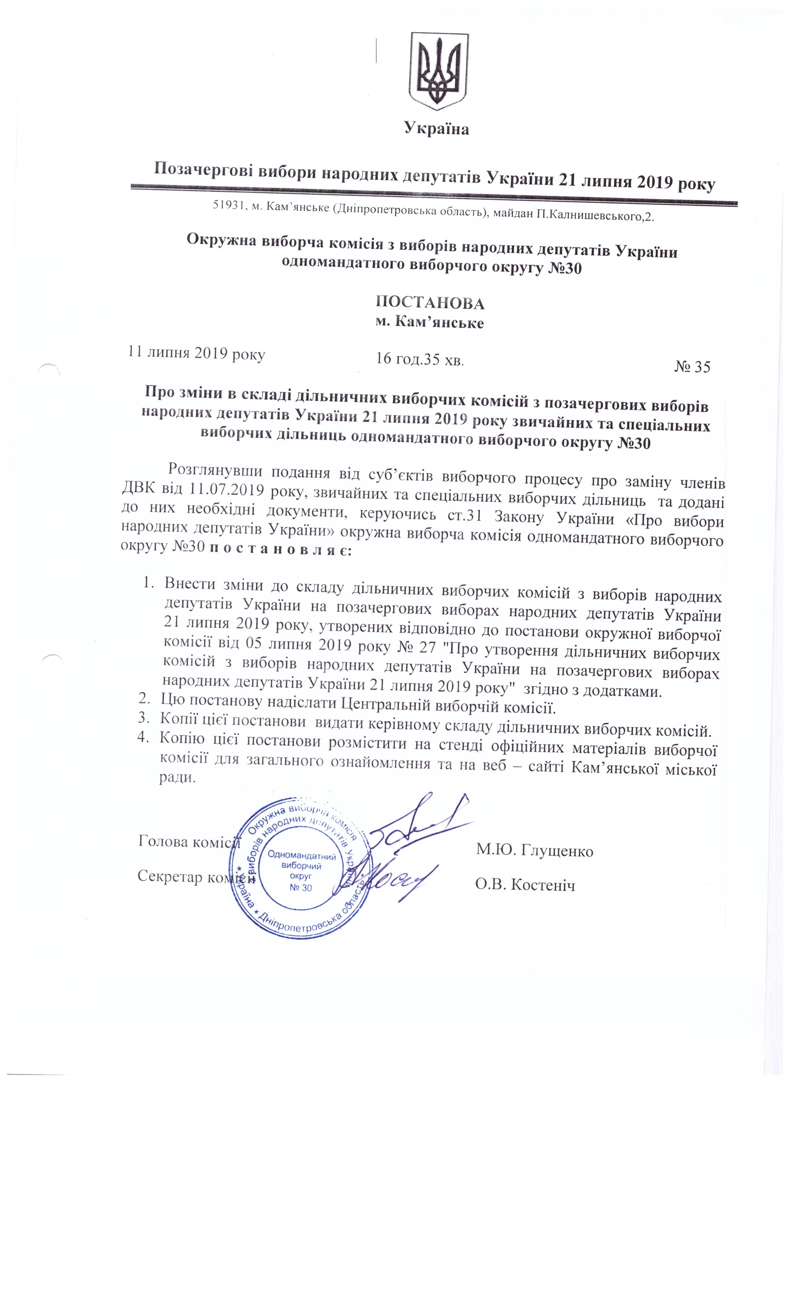 Про зміни в складі дільничних виборчих комісій з позачергових виборів депутатів України 21 липня 2019 року звичайних та спеціальних виборчих дільниць одномандатного виборчого округу № 30 |
