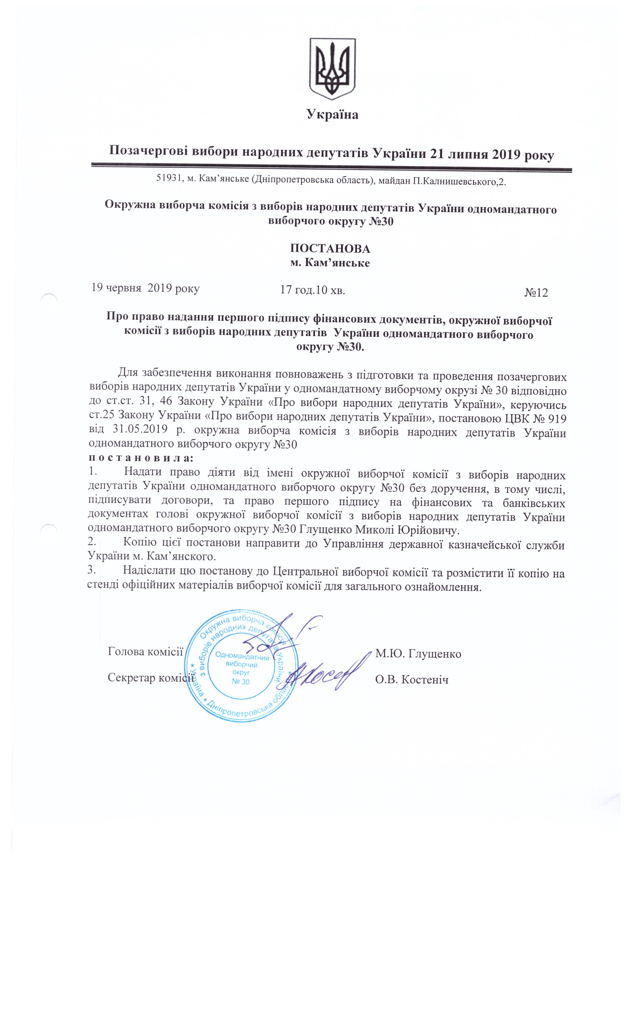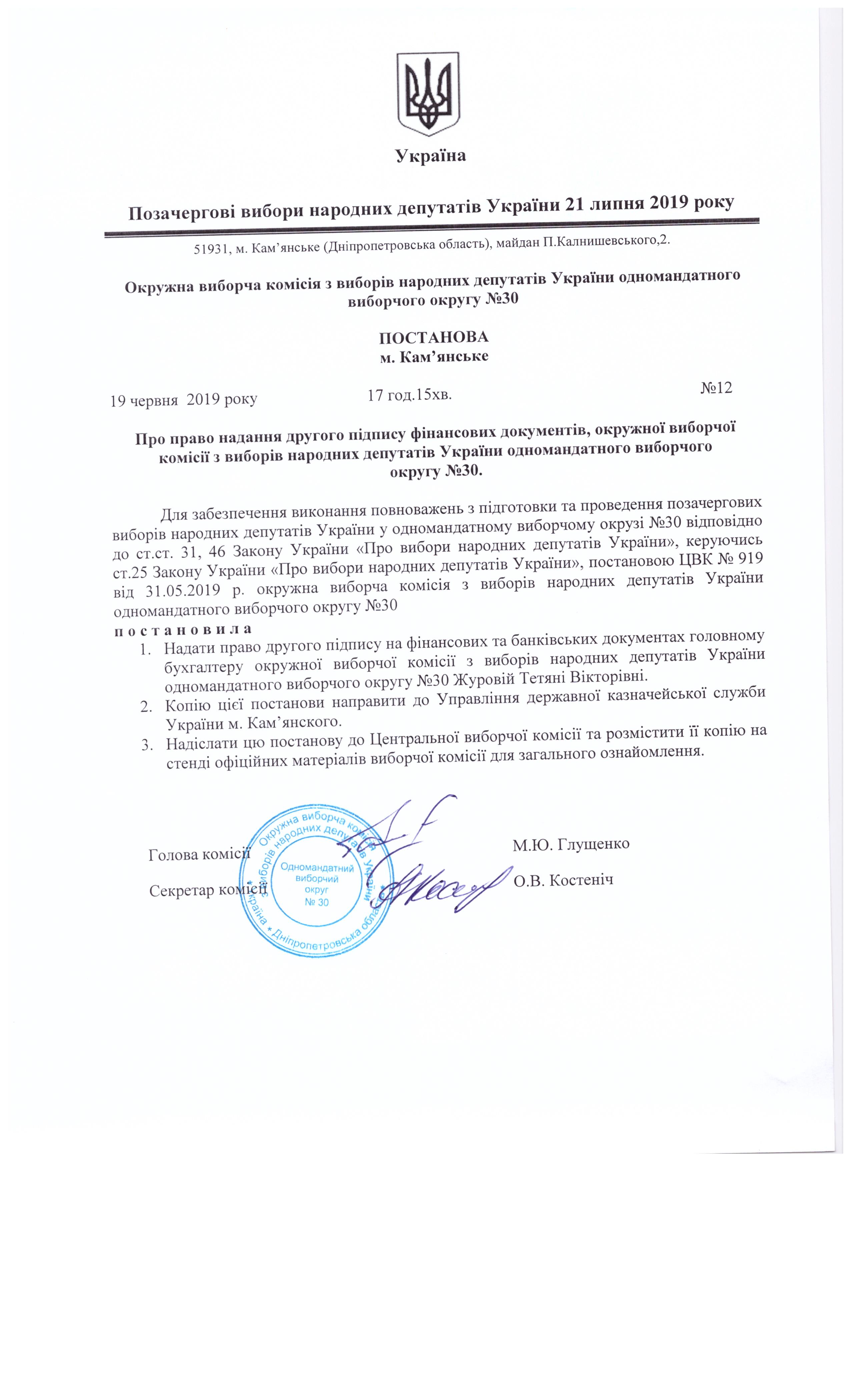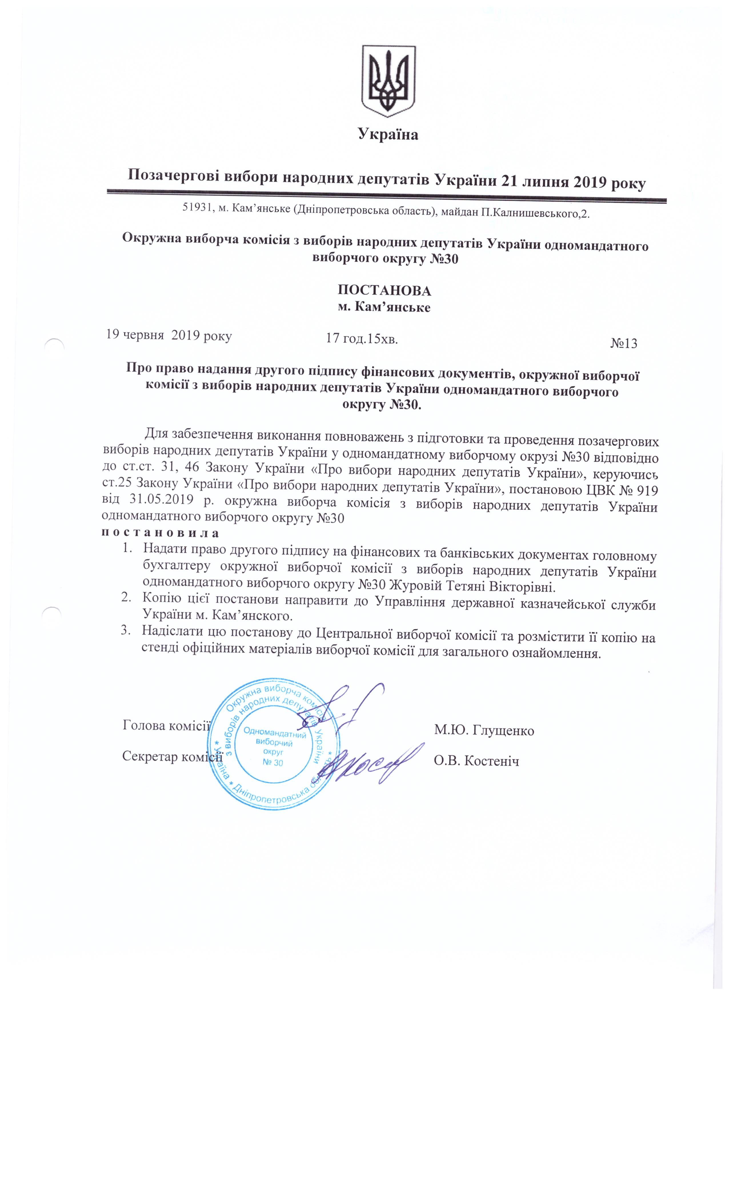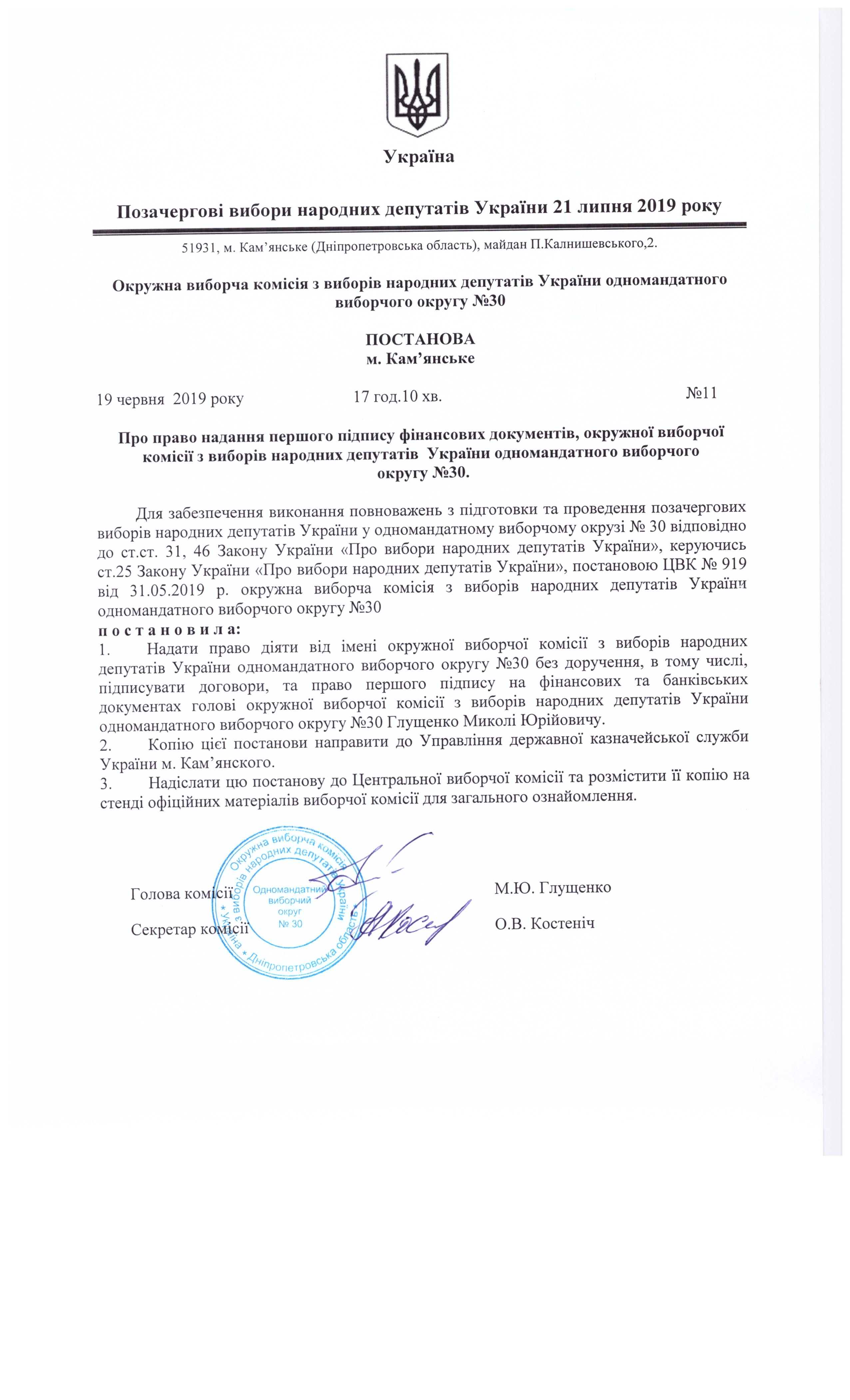 Про право надання першого підпису фінансових документів, окружної виборчої комісії з виборів народних депутатів України одномандатного виборчого округу №30 |