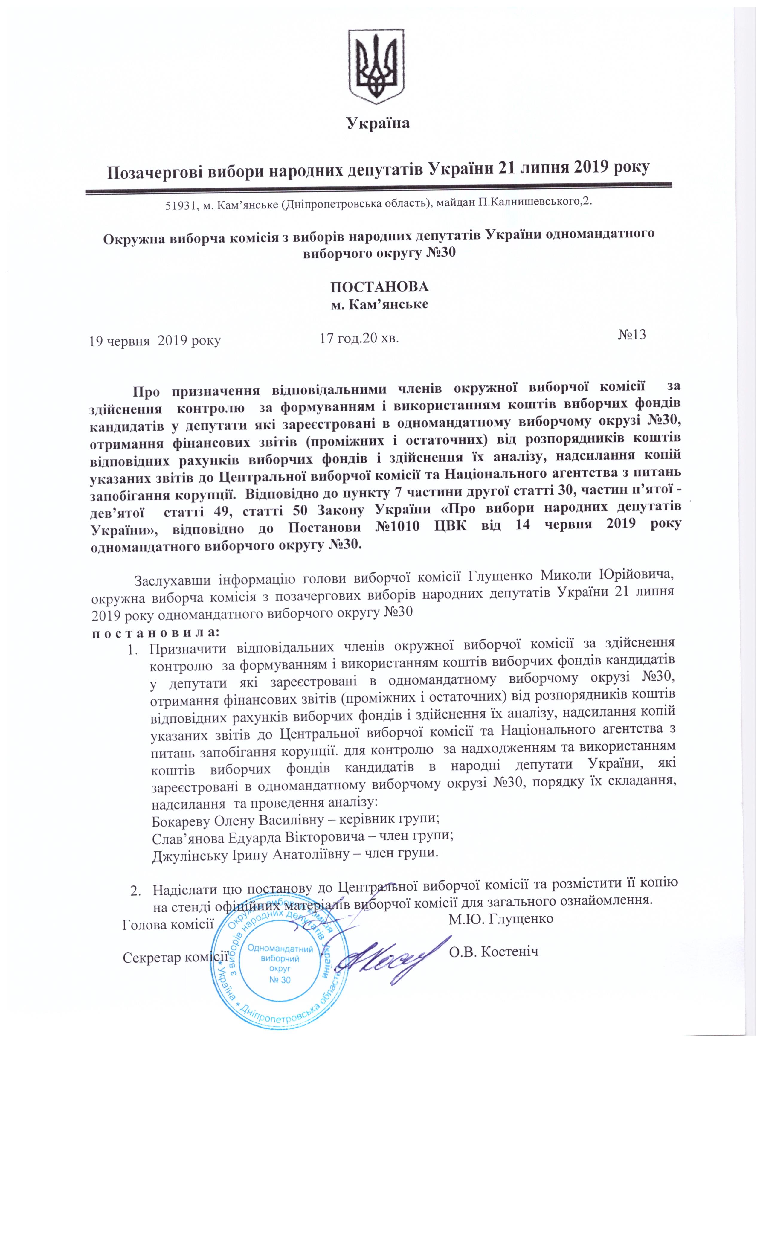 Про призначення відповідальними членів окружної виборчої комісії за здійснення контролю за формуванням і використанням коштів виборчих фондів кандидатів у депутати які зареєстровані в одномандатному виборчому окрузі №30, отримання фінансових звітів (проміжних і остаточних) від розпорядників коштів відповідних рахунків виборчих фондів і здійснення їх аналізу, надсилання копій указаних звітів до Центральної виборчої комісії та Національного агентства з питань запобігання корупції. |