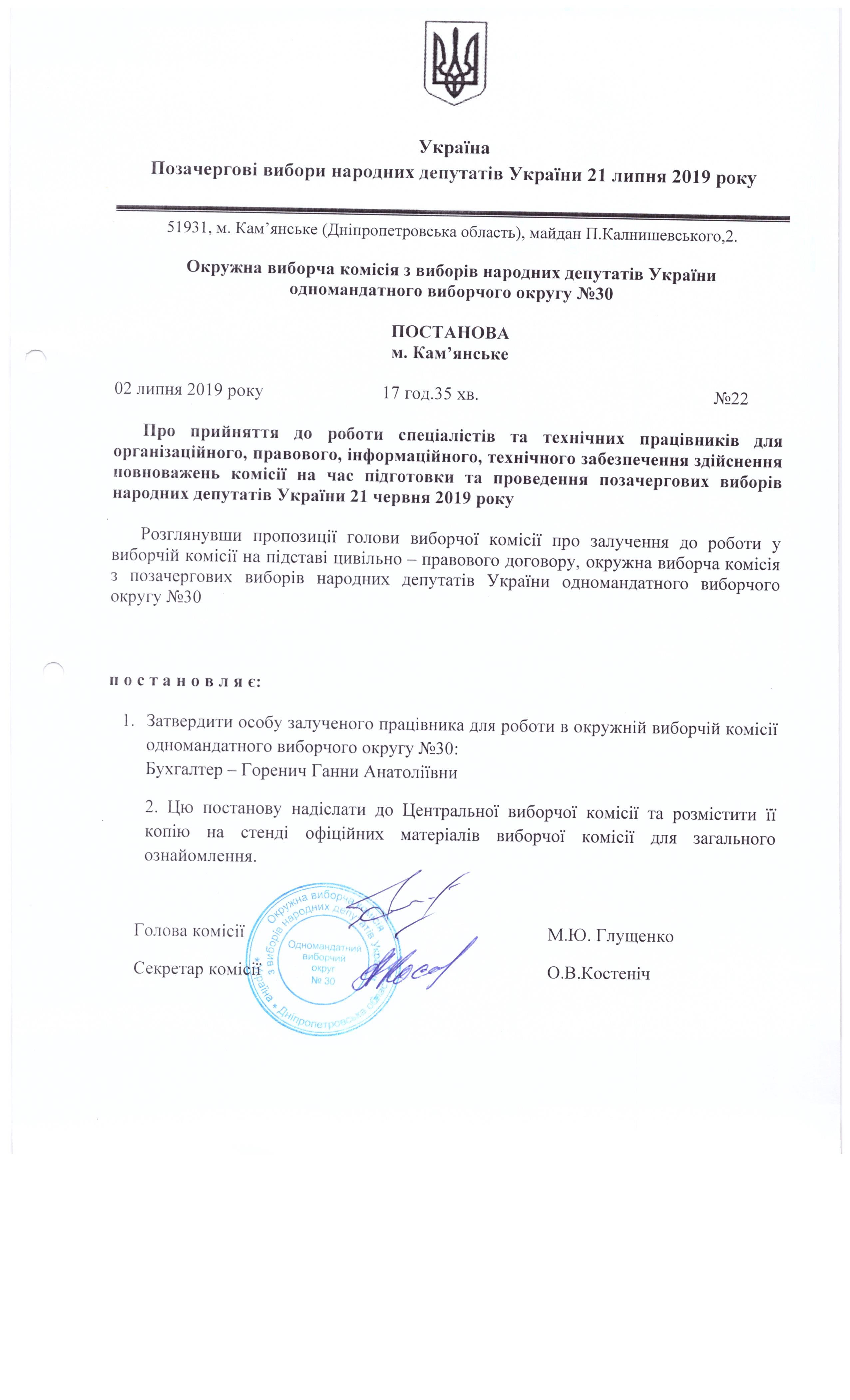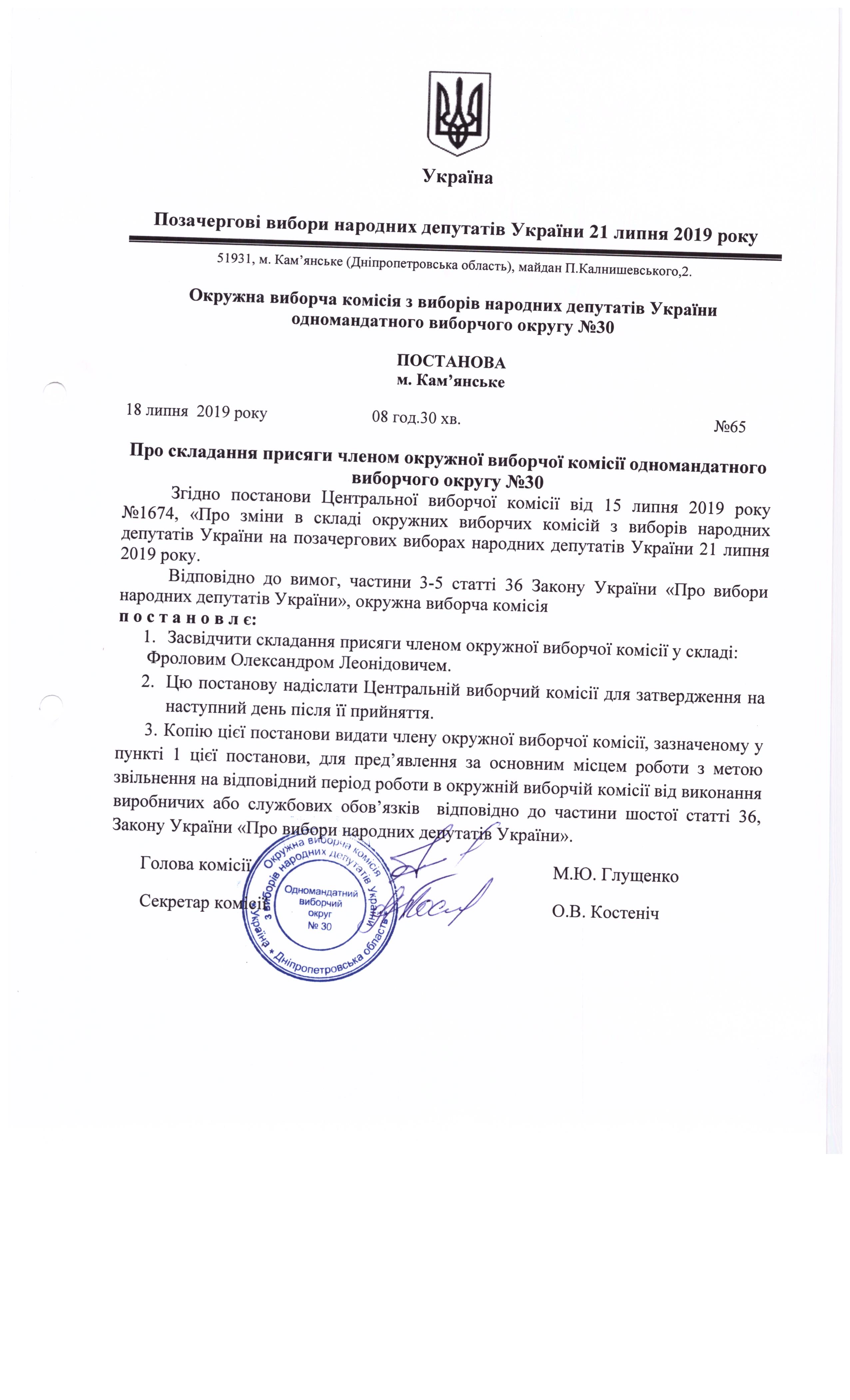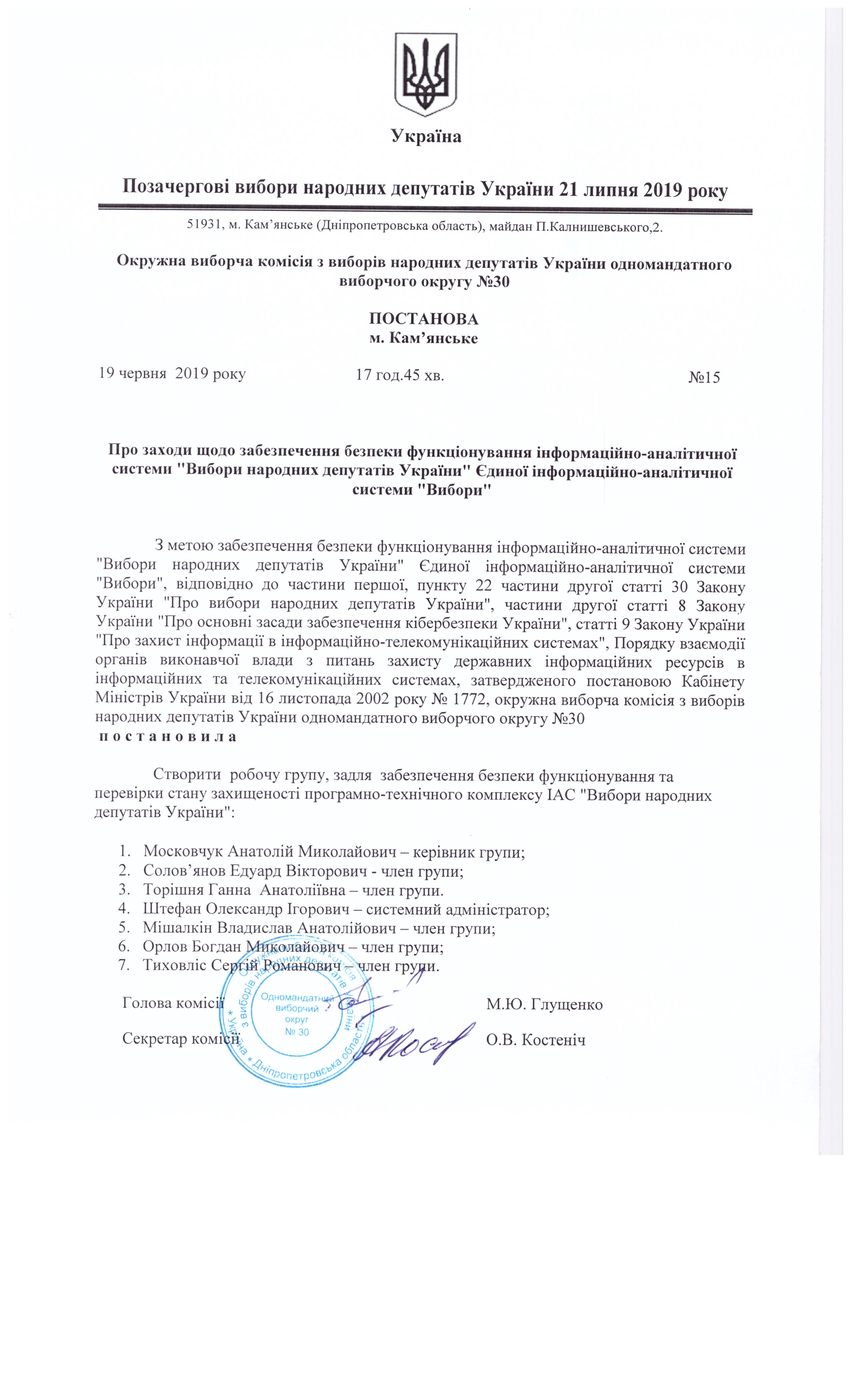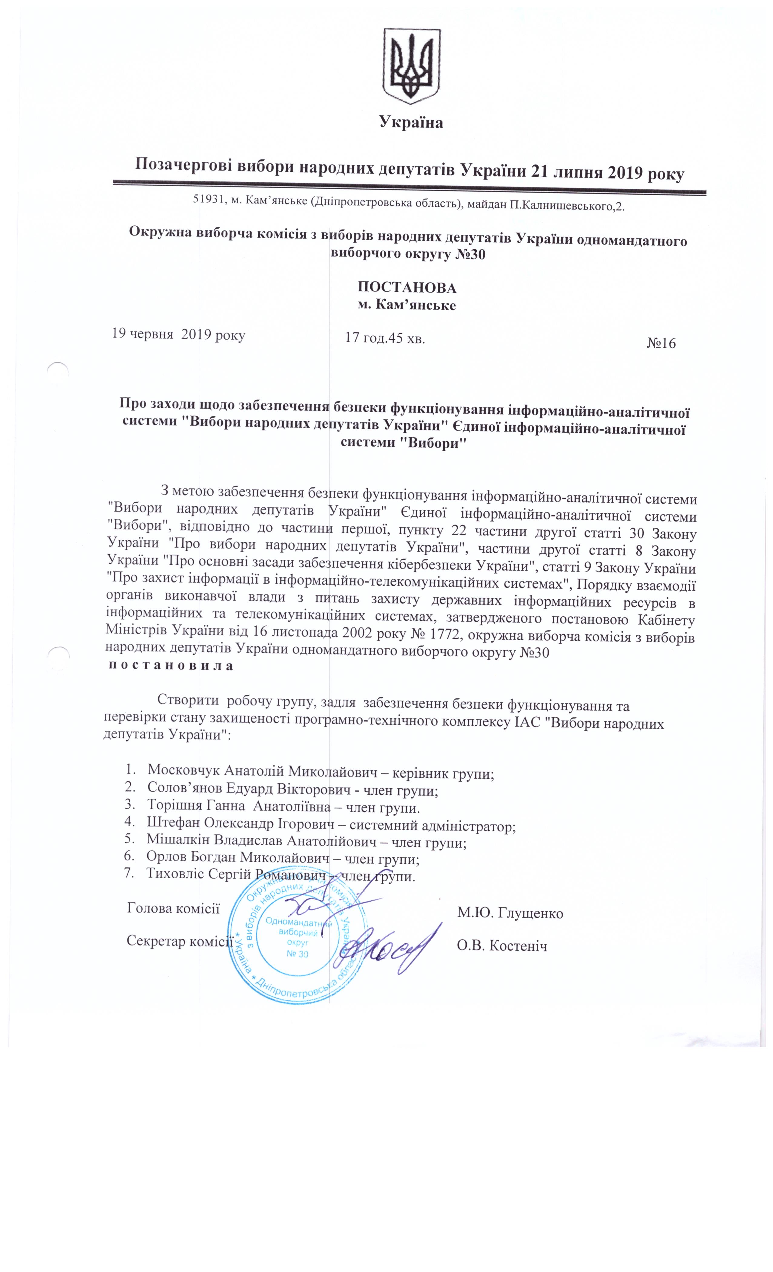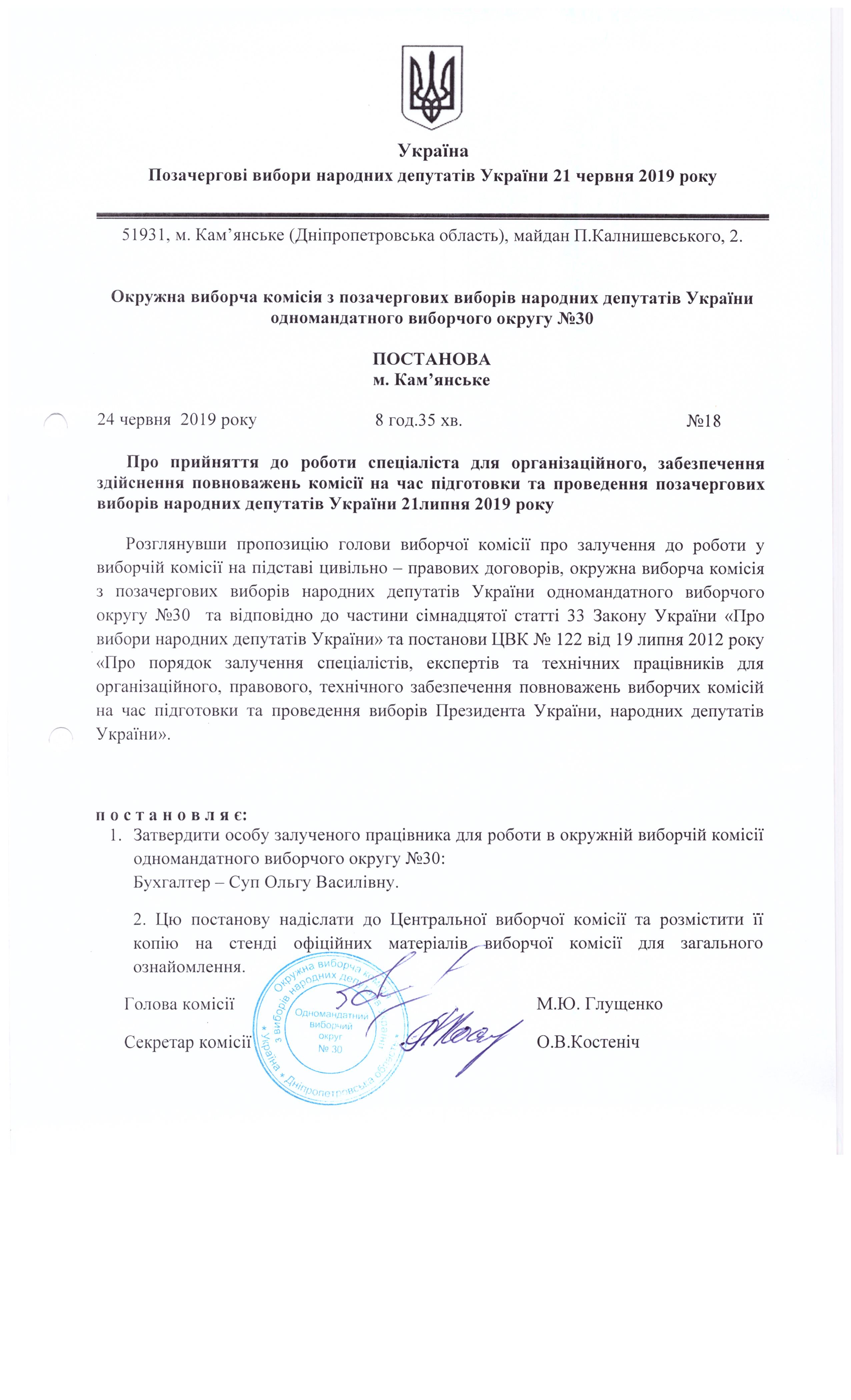 Про транспортування виборчих документів до Центральної виборчої комісії членами окружної виборчої комісії одномандатного виборчого округу № 30 на позачергових виборах народних депутатів України 21 липня 2019 року |