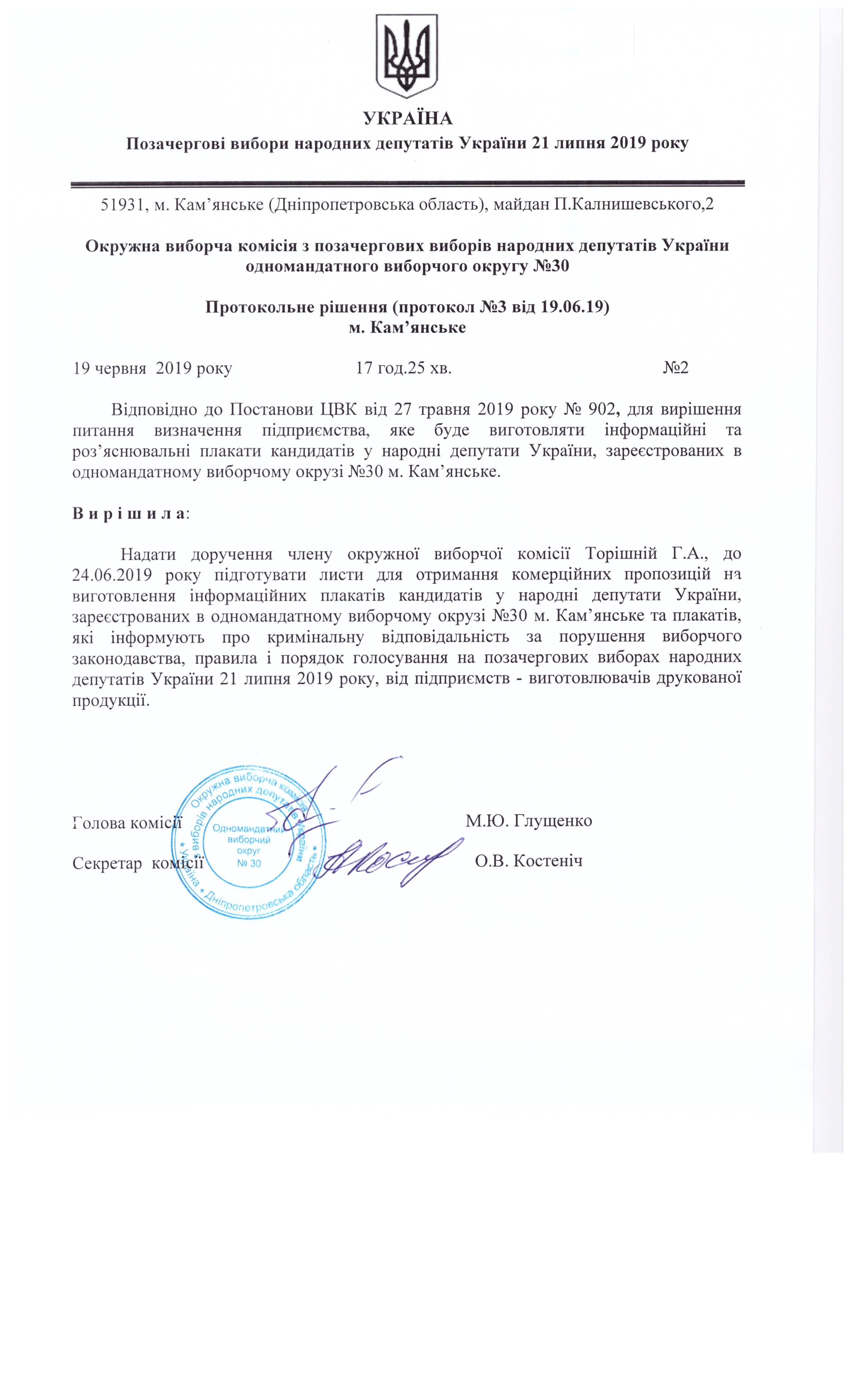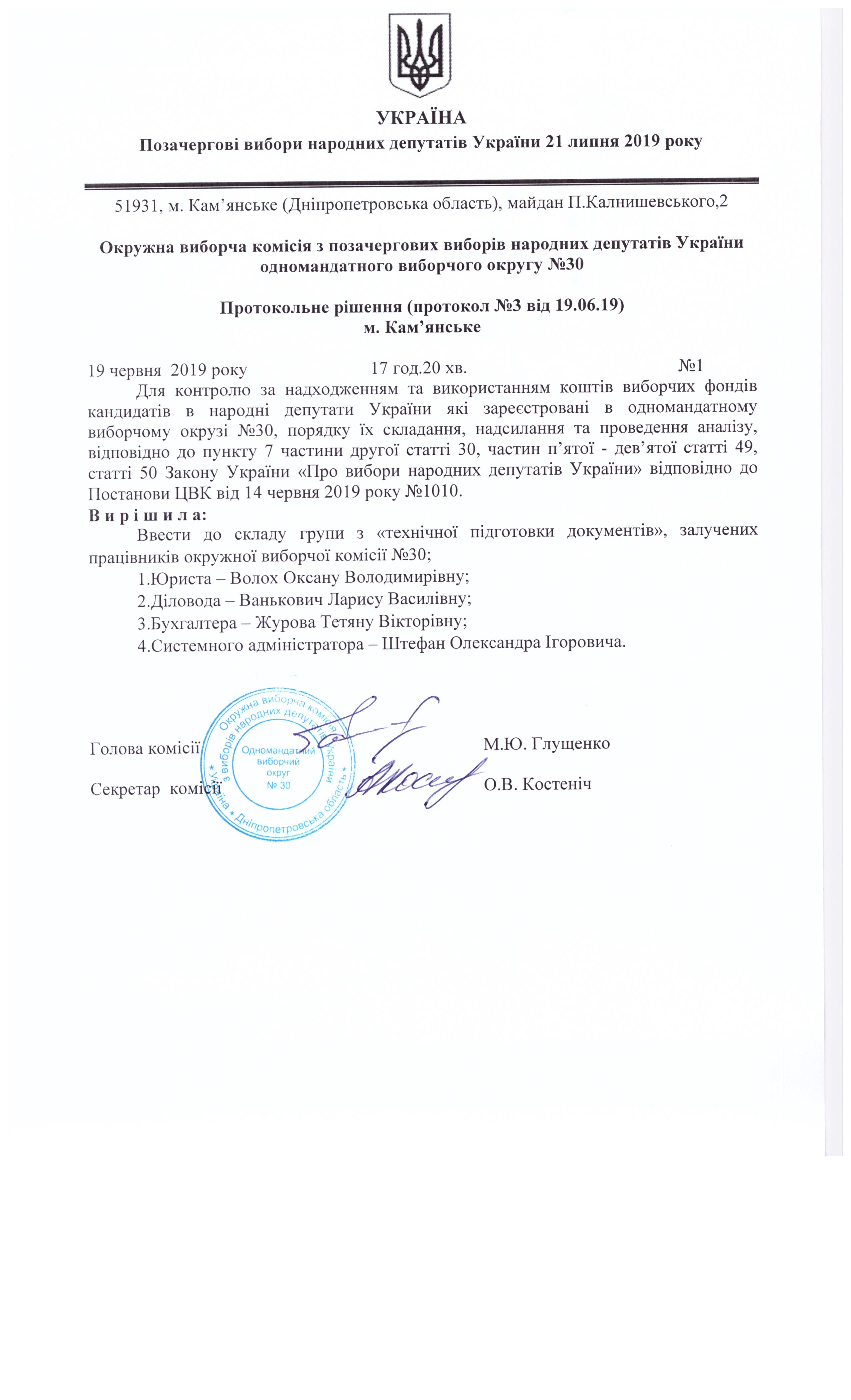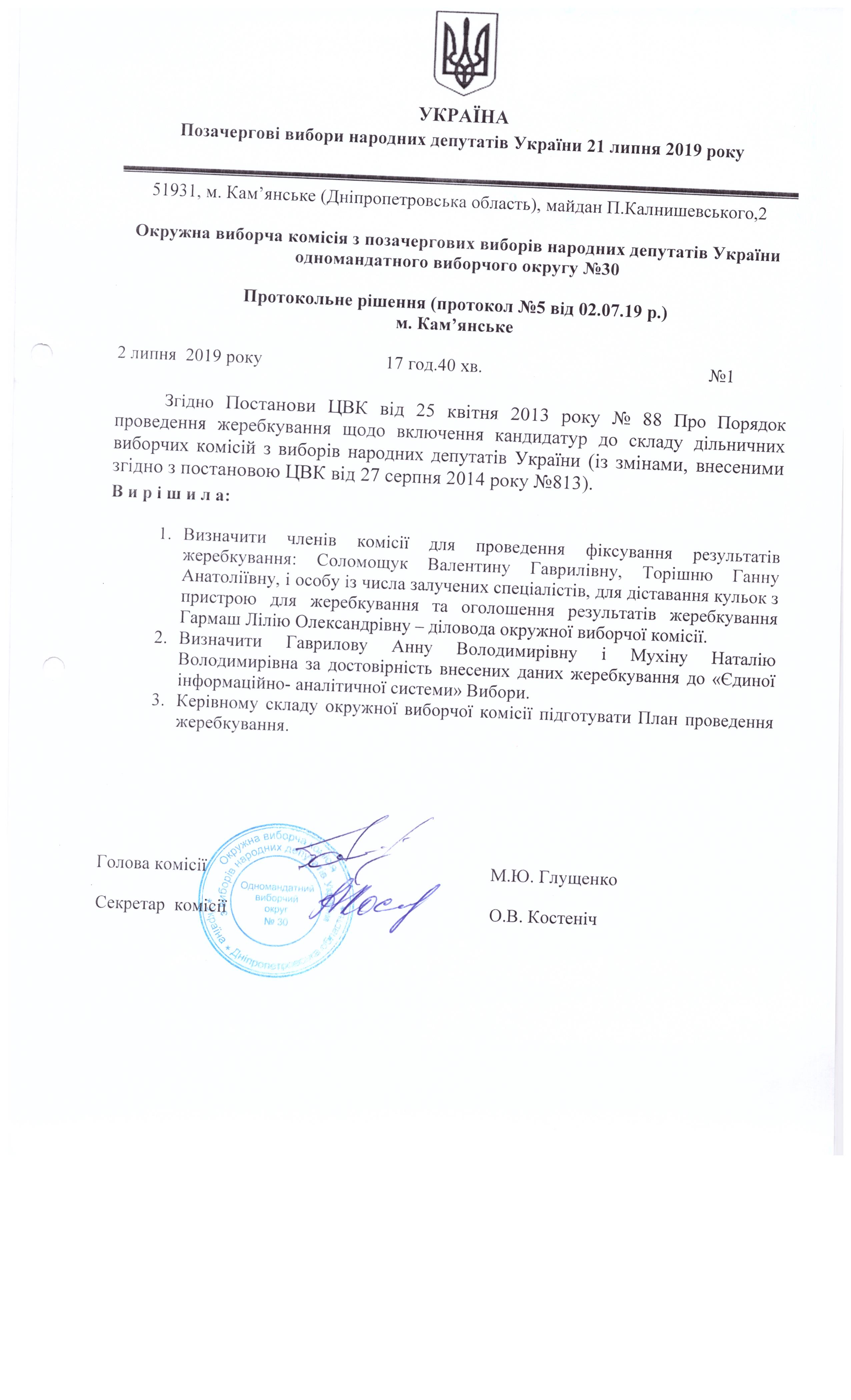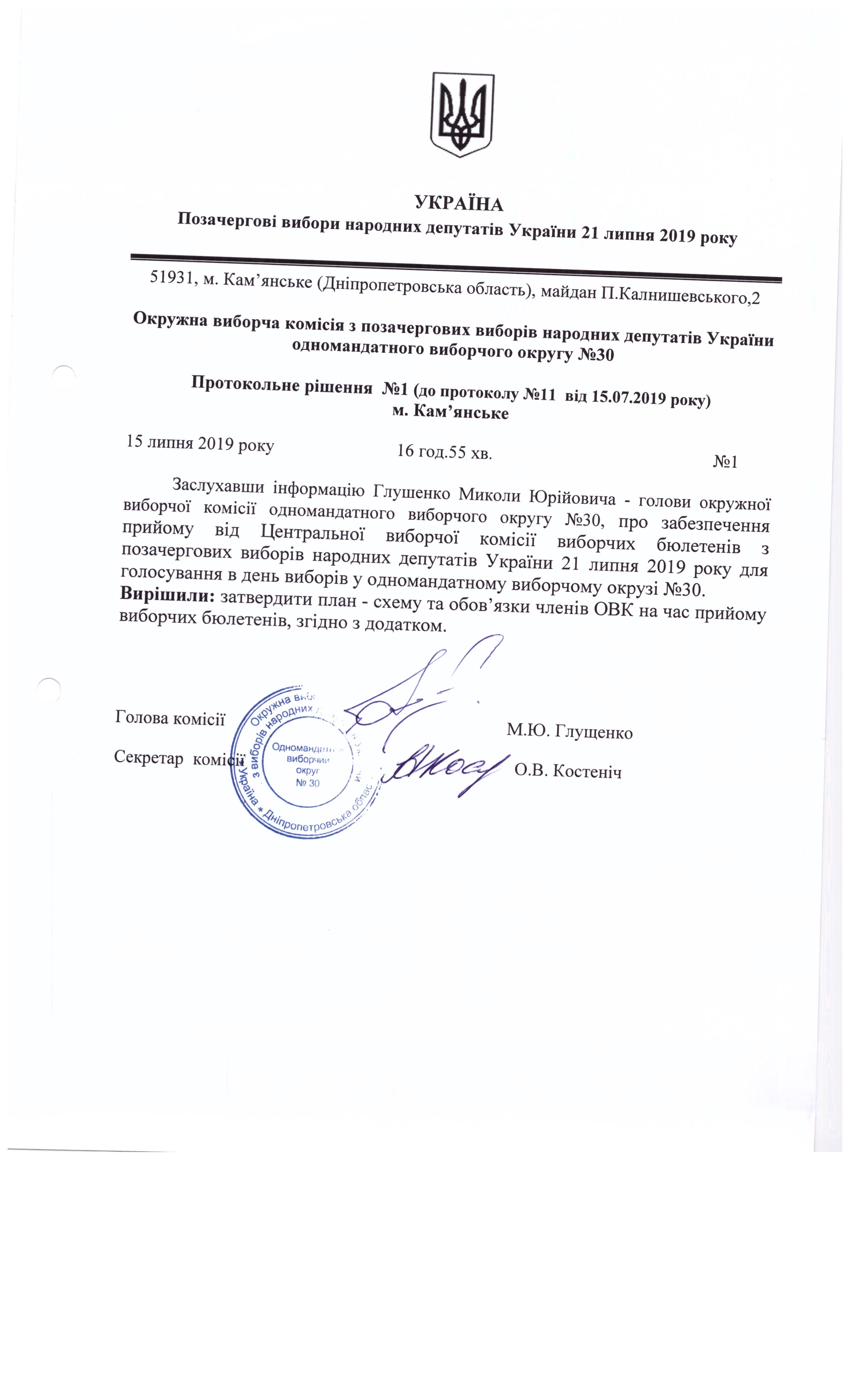 Протокольне рішення №1(до протоколу №11 від 15.07.2019 року) м. Кам'янське |