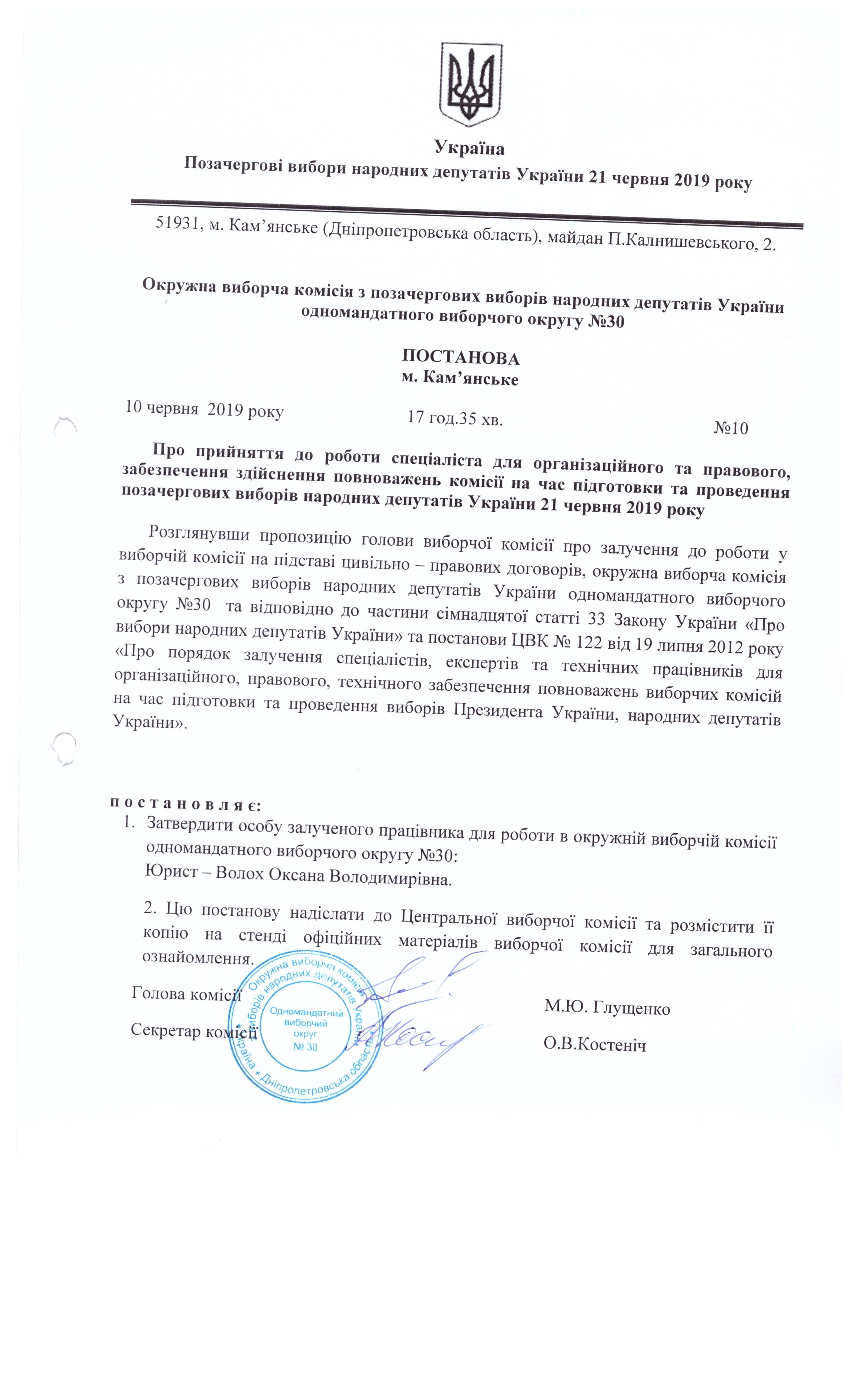 Про прийняття до роботи спеціаліста для організаційного, забезпечення здійснення повноважень комісії на час підготовки та проведення позачергових виборів народних депутатів України 21 липня 2019 року |