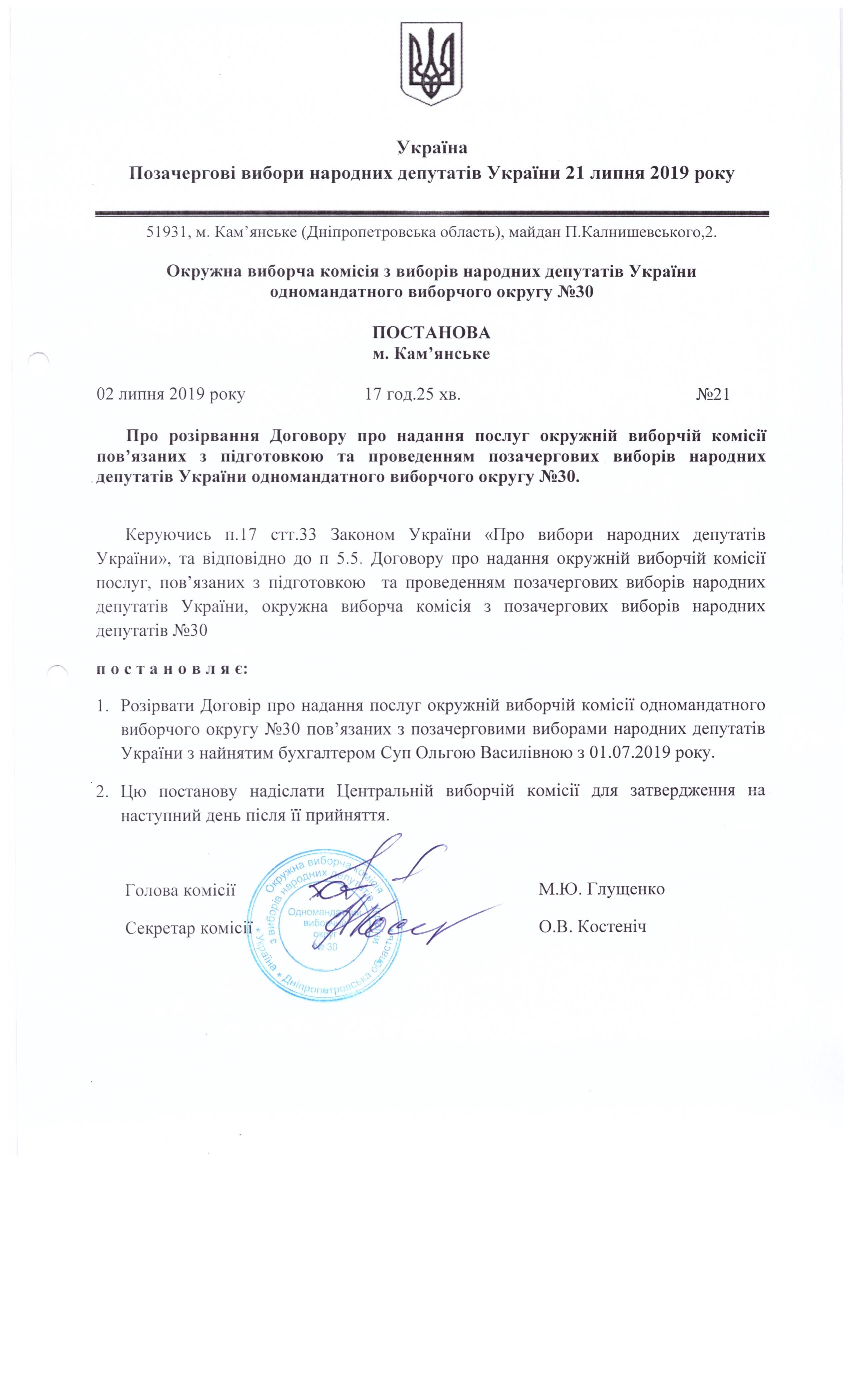 Про розірвання Договору про надання послуг окружній виборчій комісії № 30 |